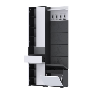 Garderoba to elegancka i funkcjonalna przestrzeń, w której dominuje harmonijne połączenie stylu i praktyczności. Centralnym punktem jest wyrafinowana szafka na buty z wbudowanym siedziskiem i schowkiem, oferująca idealne rozwiązanie do przechowywania obuwia oraz drobnych przedmiotów.