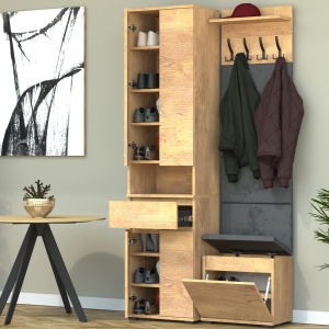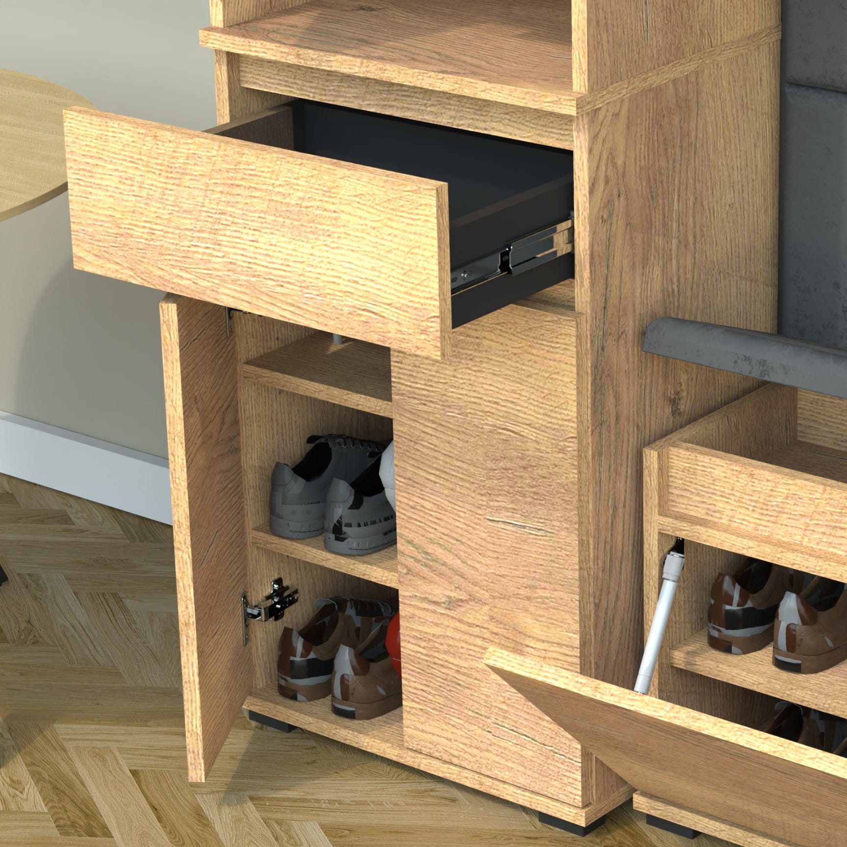 Szafka na buty jest nie tylko wygodna, ale także praktyczna - wewnątrz znajduje się półka, która pozwala na przechowywanie większej ilości obuwia. Dodatkowo, szafka jest wyposażona w schowek na przybory, dzięki czemu wszystko, czego potrzebujesz, jest zawsze pod ręką.