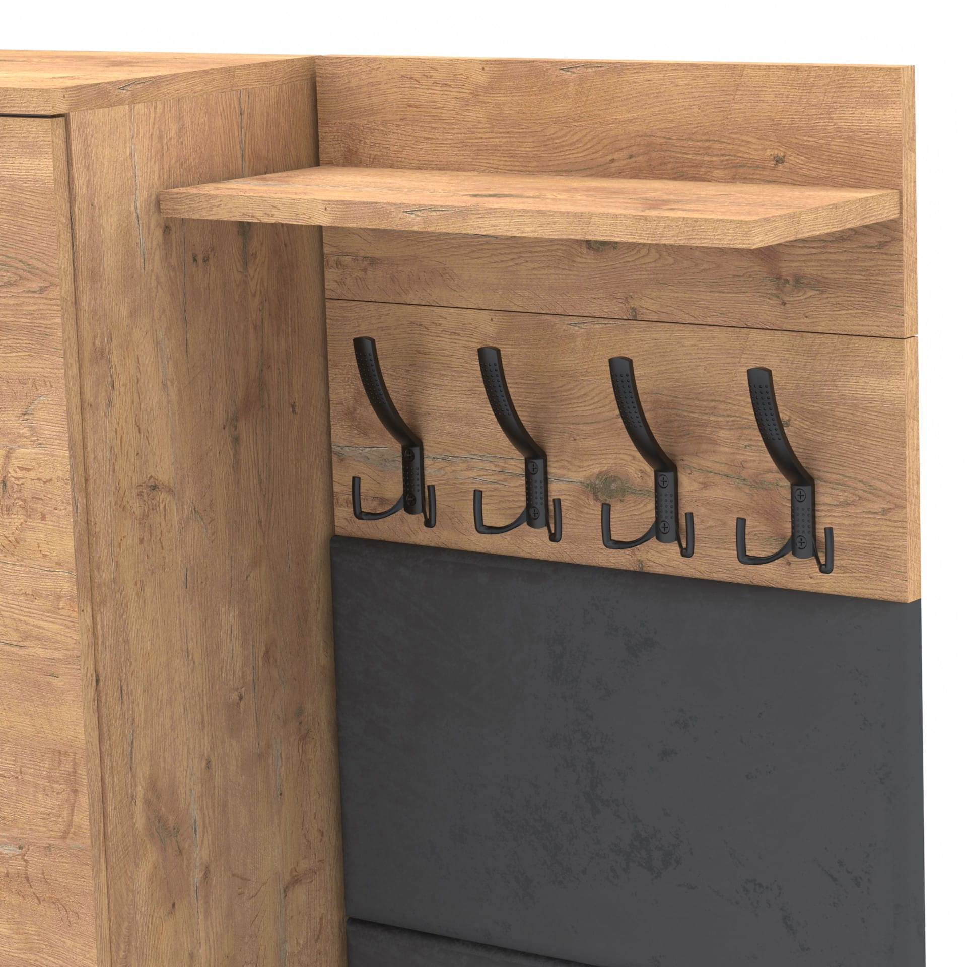 Garderoba to elegancka i funkcjonalna przestrzeń, w której dominuje harmonijne połączenie stylu i praktyczności. Centralnym punktem jest wyrafinowana szafka na buty z wbudowanym siedziskiem i schowkiem, oferująca idealne rozwiązanie do przechowywania obuwia oraz drobnych przedmiotów.