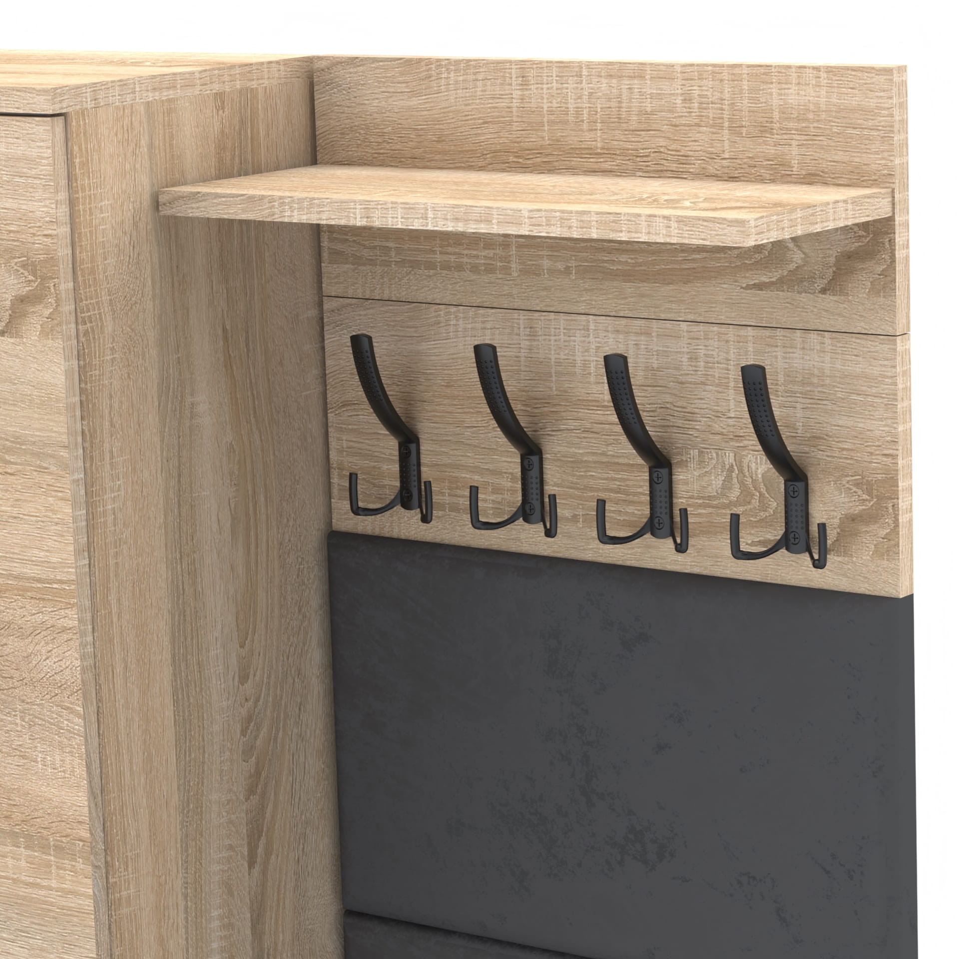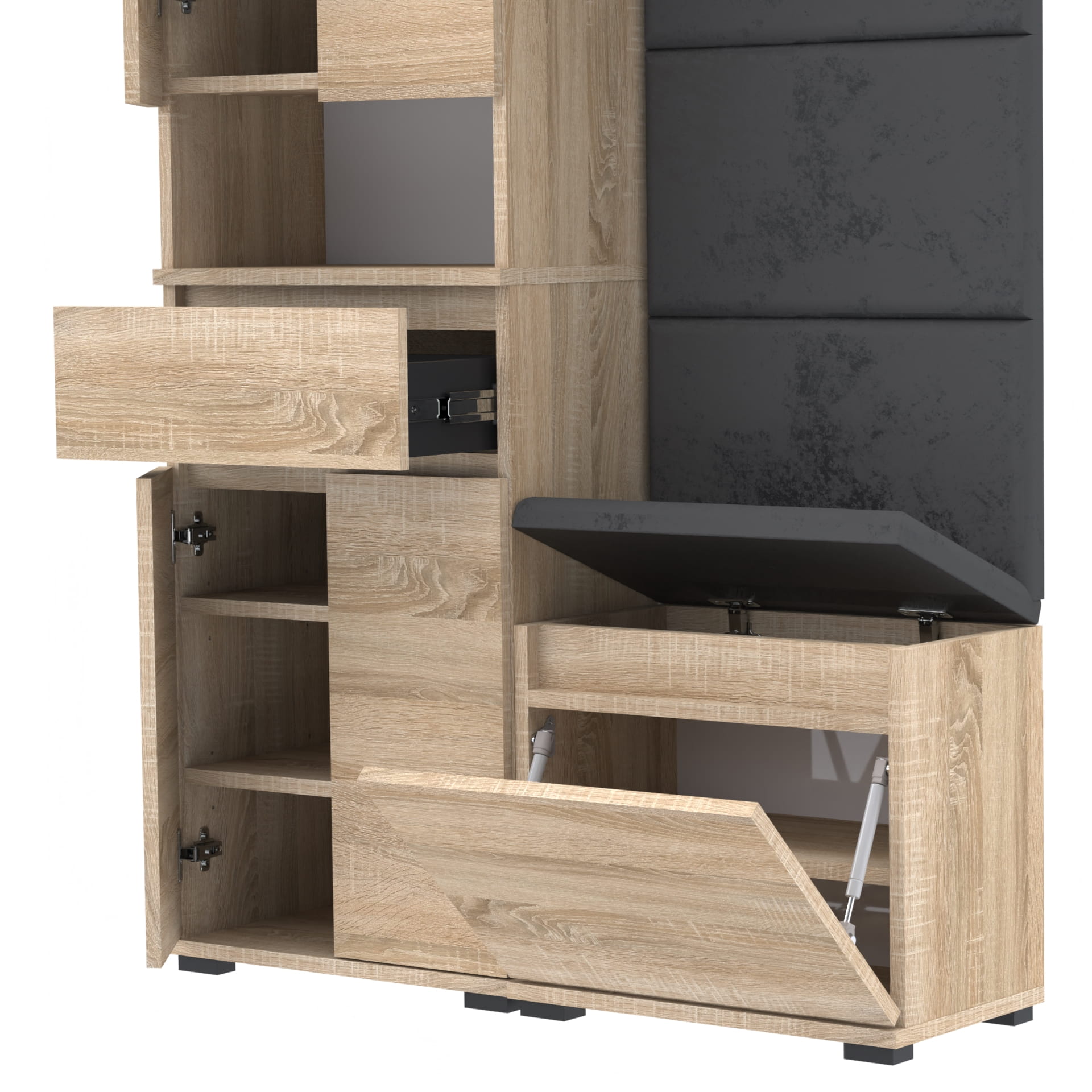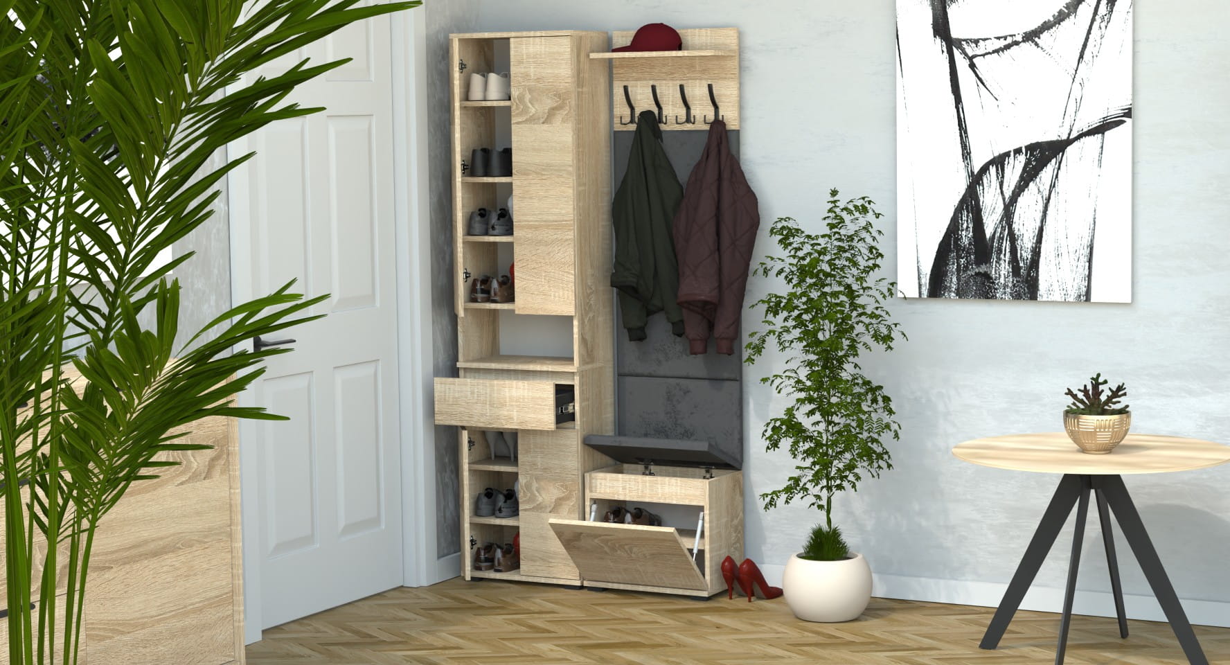 Garderoba to elegancka i funkcjonalna przestrzeń, w której dominuje harmonijne połączenie stylu i praktyczności. Centralnym punktem jest wyrafinowana szafka na buty z wbudowanym siedziskiem i schowkiem, oferująca idealne rozwiązanie do przechowywania obuwia oraz drobnych przedmiotów.