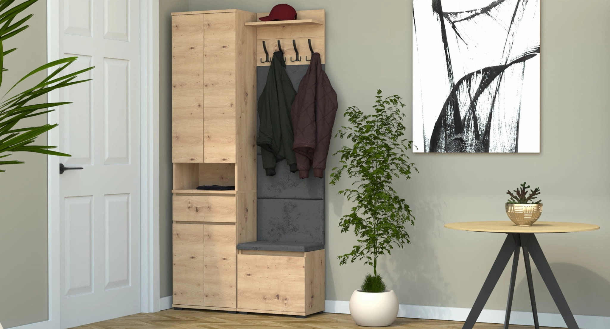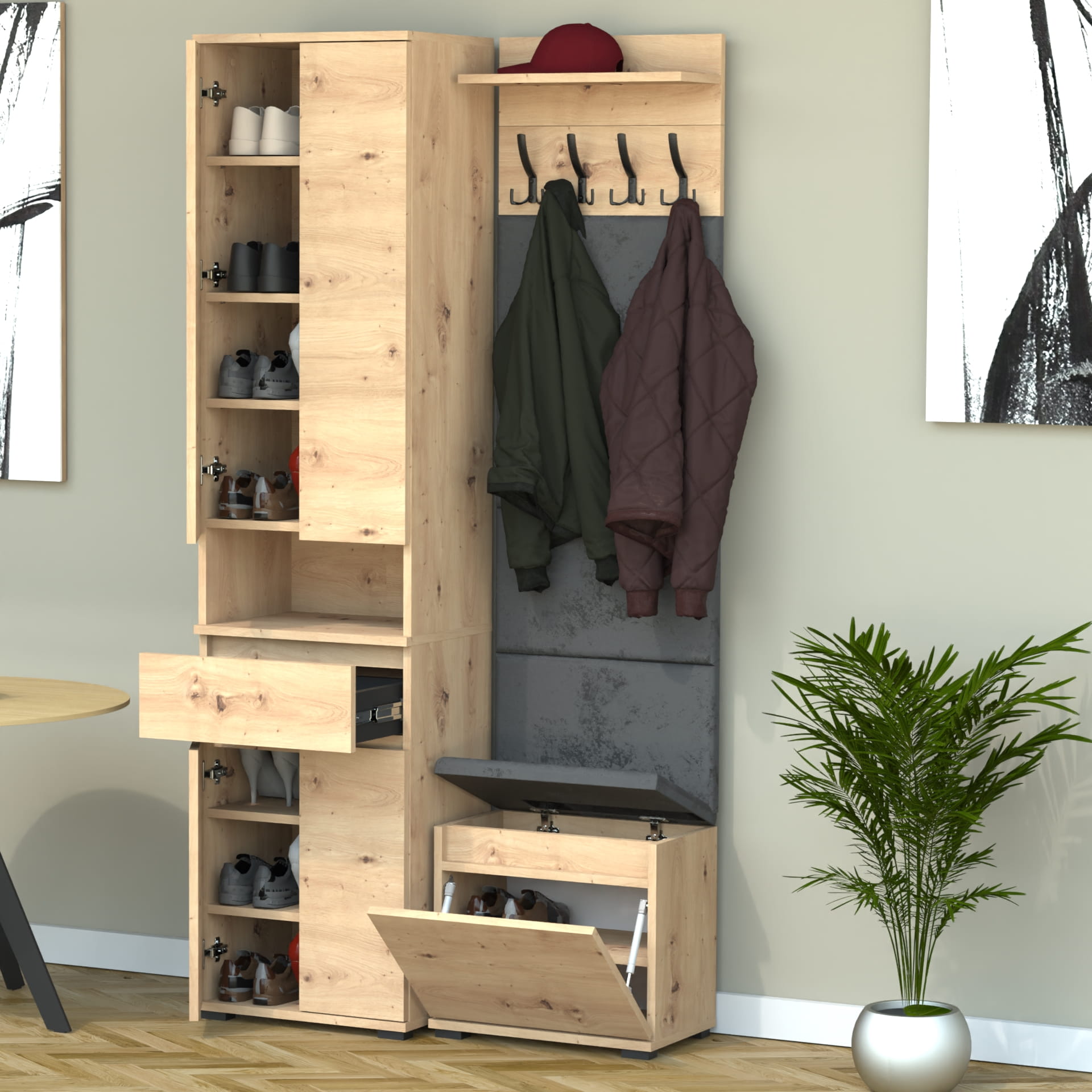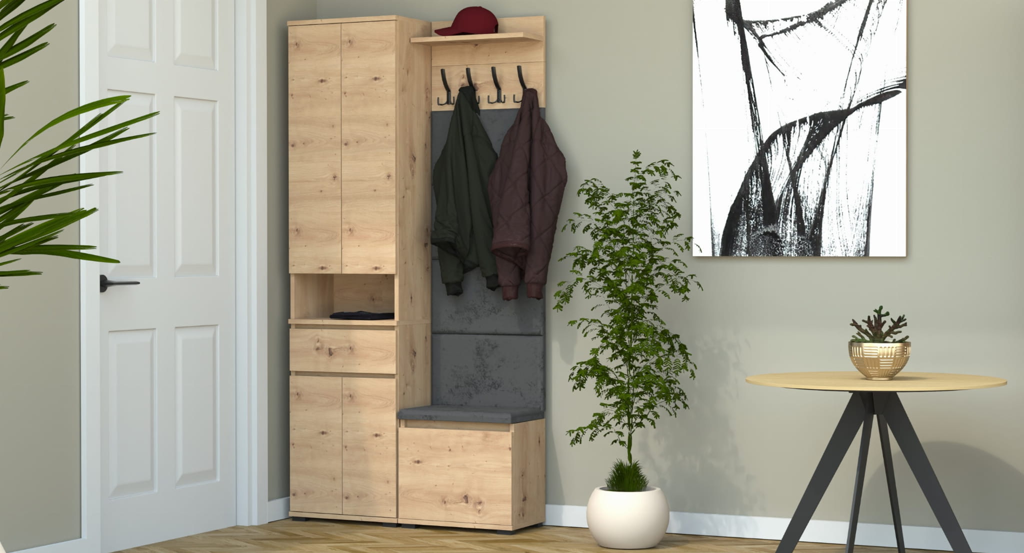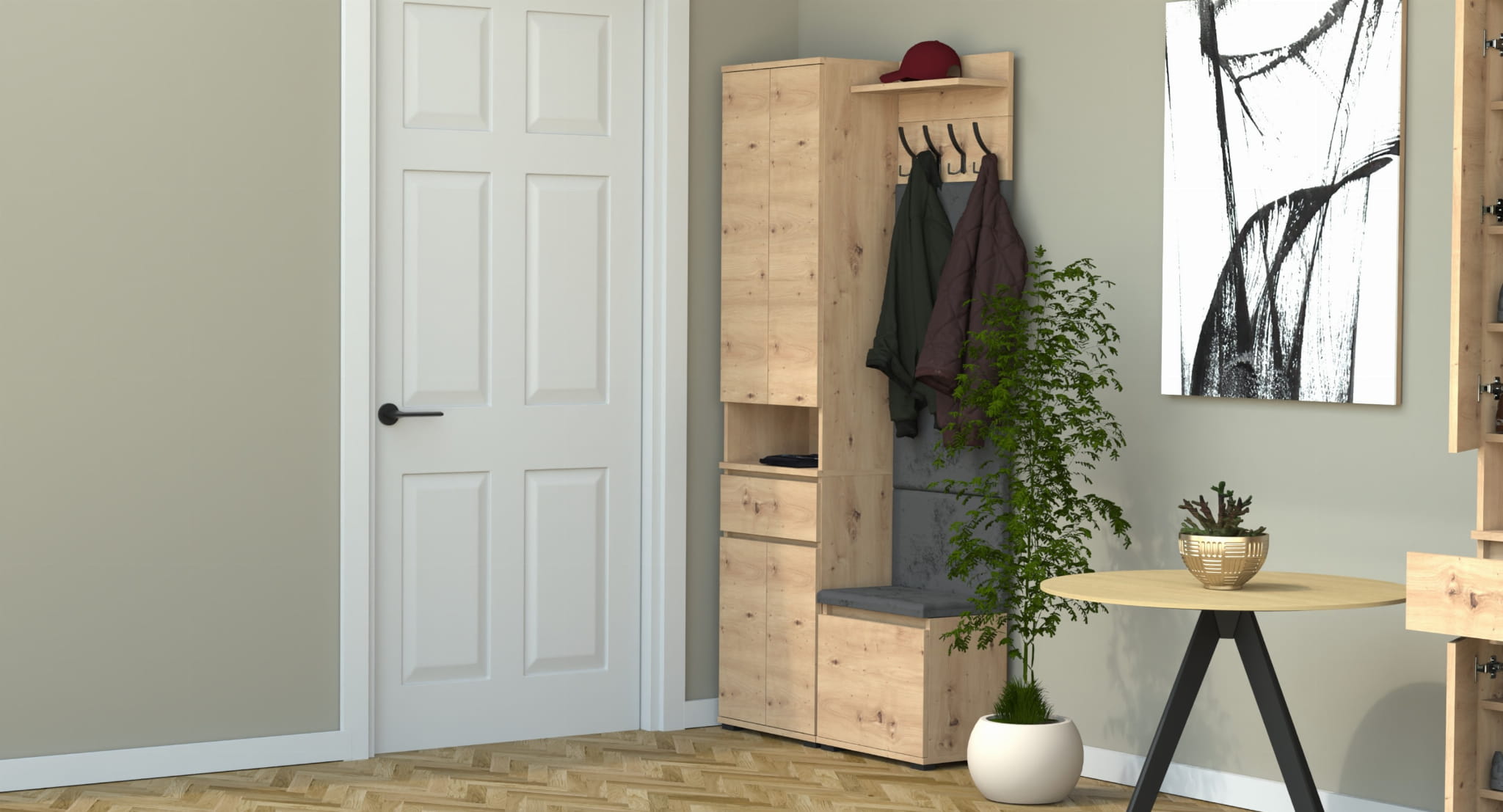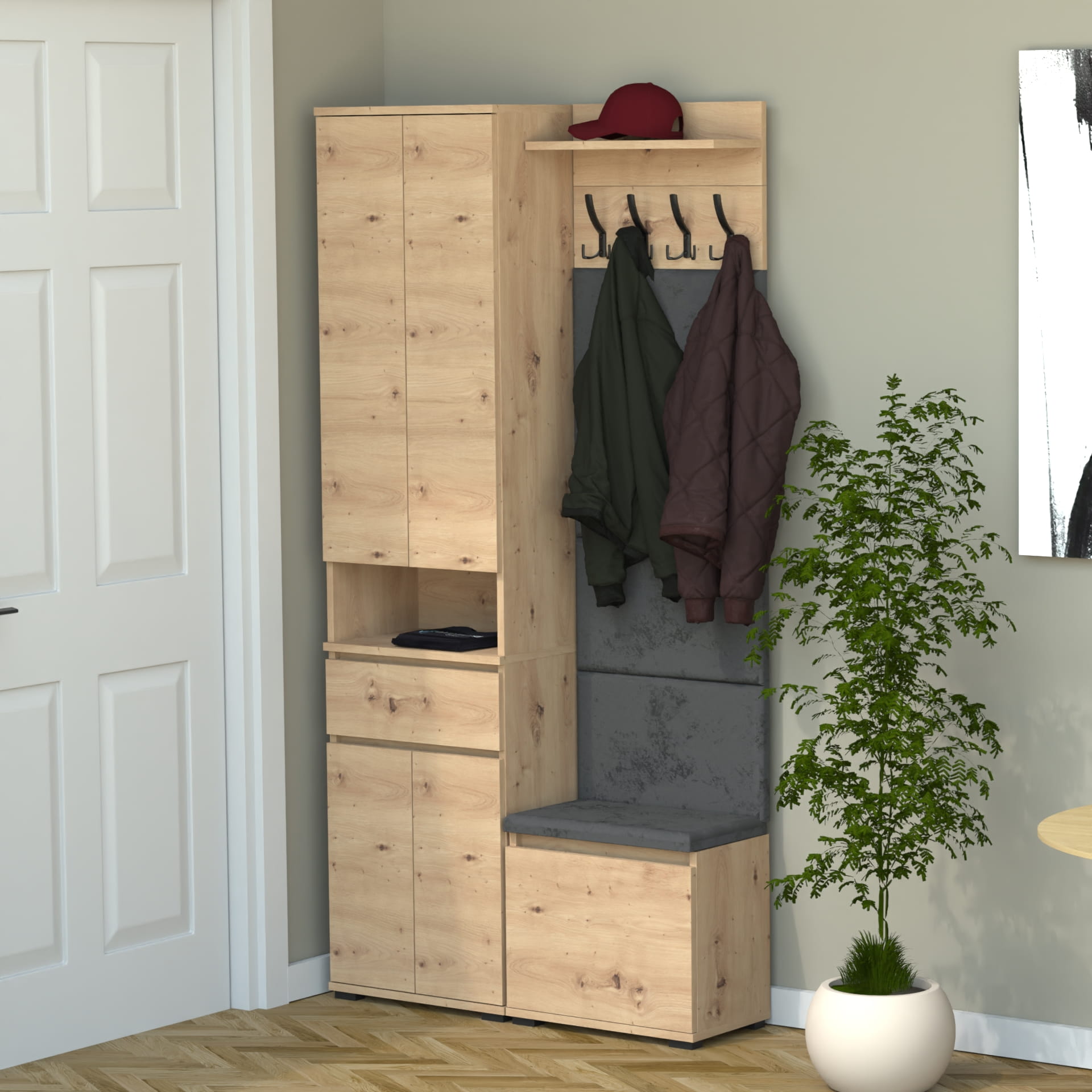 Garderoba to elegancka i funkcjonalna przestrzeń, w której dominuje harmonijne połączenie stylu i praktyczności. Centralnym punktem jest wyrafinowana szafka na buty z wbudowanym siedziskiem i schowkiem, oferująca idealne rozwiązanie do przechowywania obuwia oraz drobnych przedmiotów.