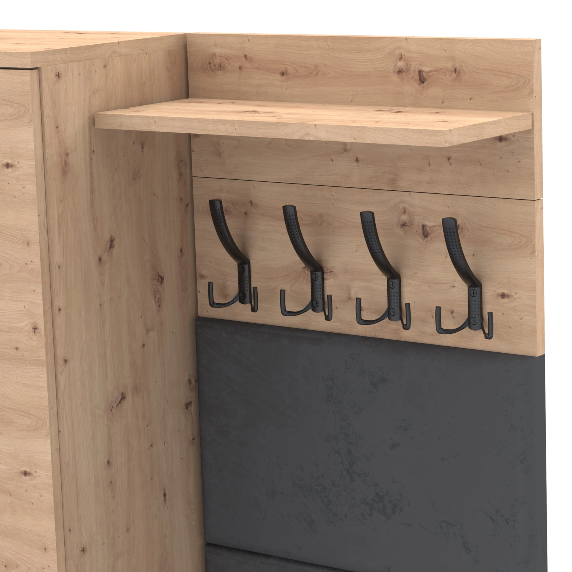 Na górze struktury znajduje się praktyczna półka o głębokości 18 cm, która jest idealna do przechowywania różnych przedmiotów. Półka nie tylko zapewnia dodatkową przestrzeń do przechowywania, ale także stanowi integralną część designu wieszaka, nadając mu ciekawy, nowoczesny wygląd.