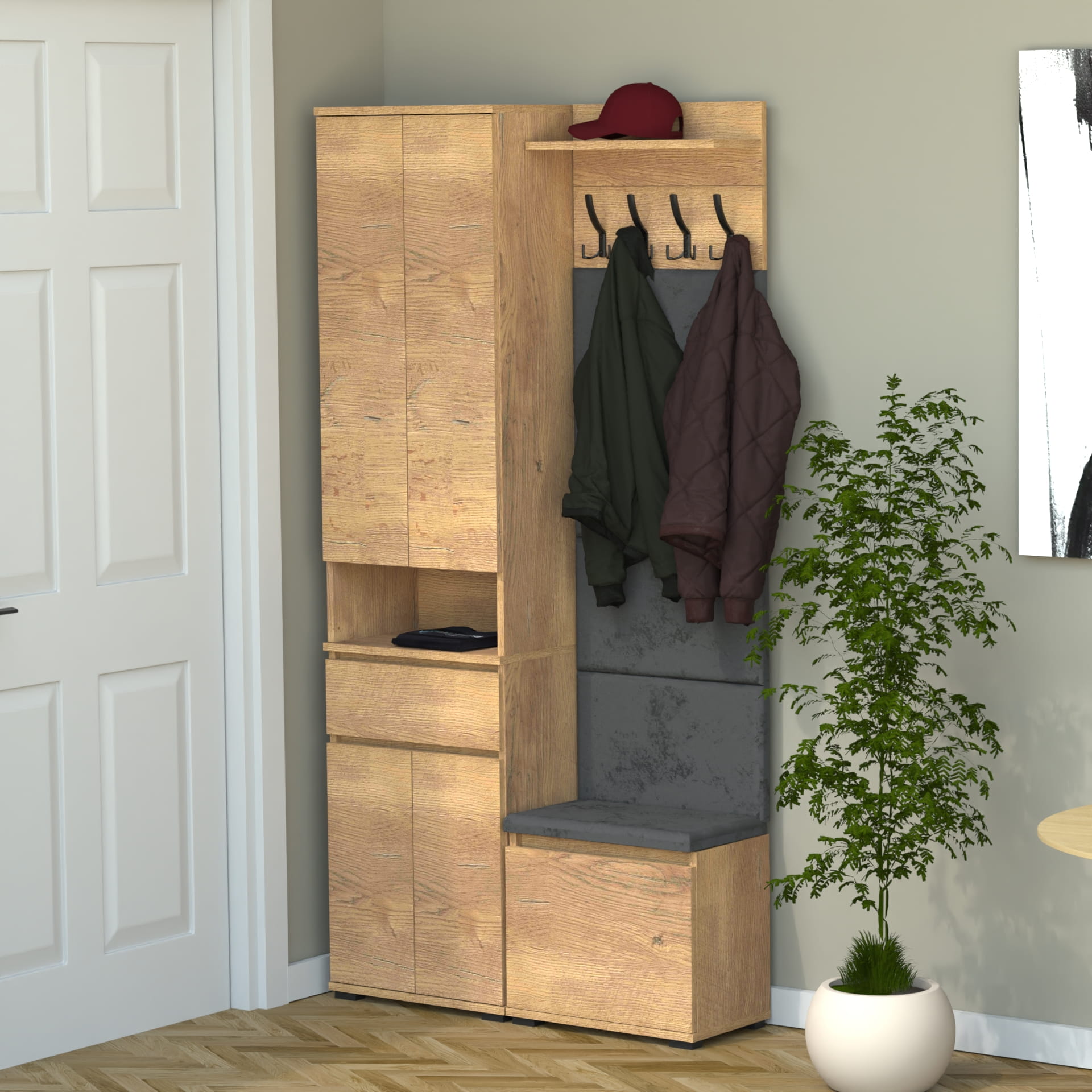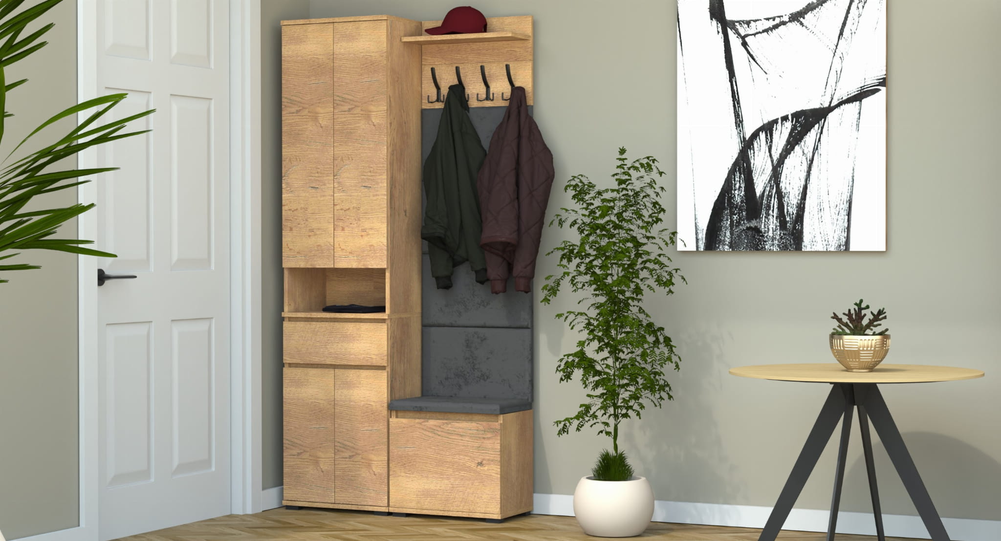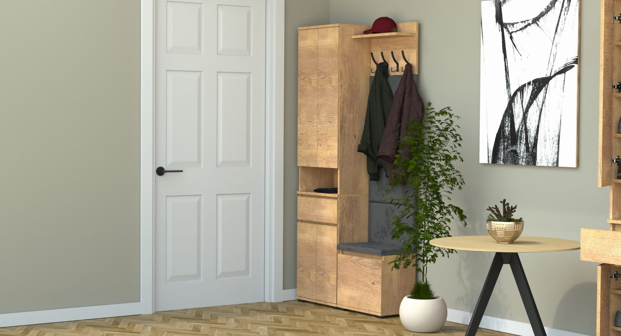 Garderoba to elegancka i funkcjonalna przestrzeń, w której dominuje harmonijne połączenie stylu i praktyczności. Centralnym punktem jest wyrafinowana szafka na buty z wbudowanym siedziskiem i schowkiem, oferująca idealne rozwiązanie do przechowywania obuwia oraz drobnych przedmiotów.