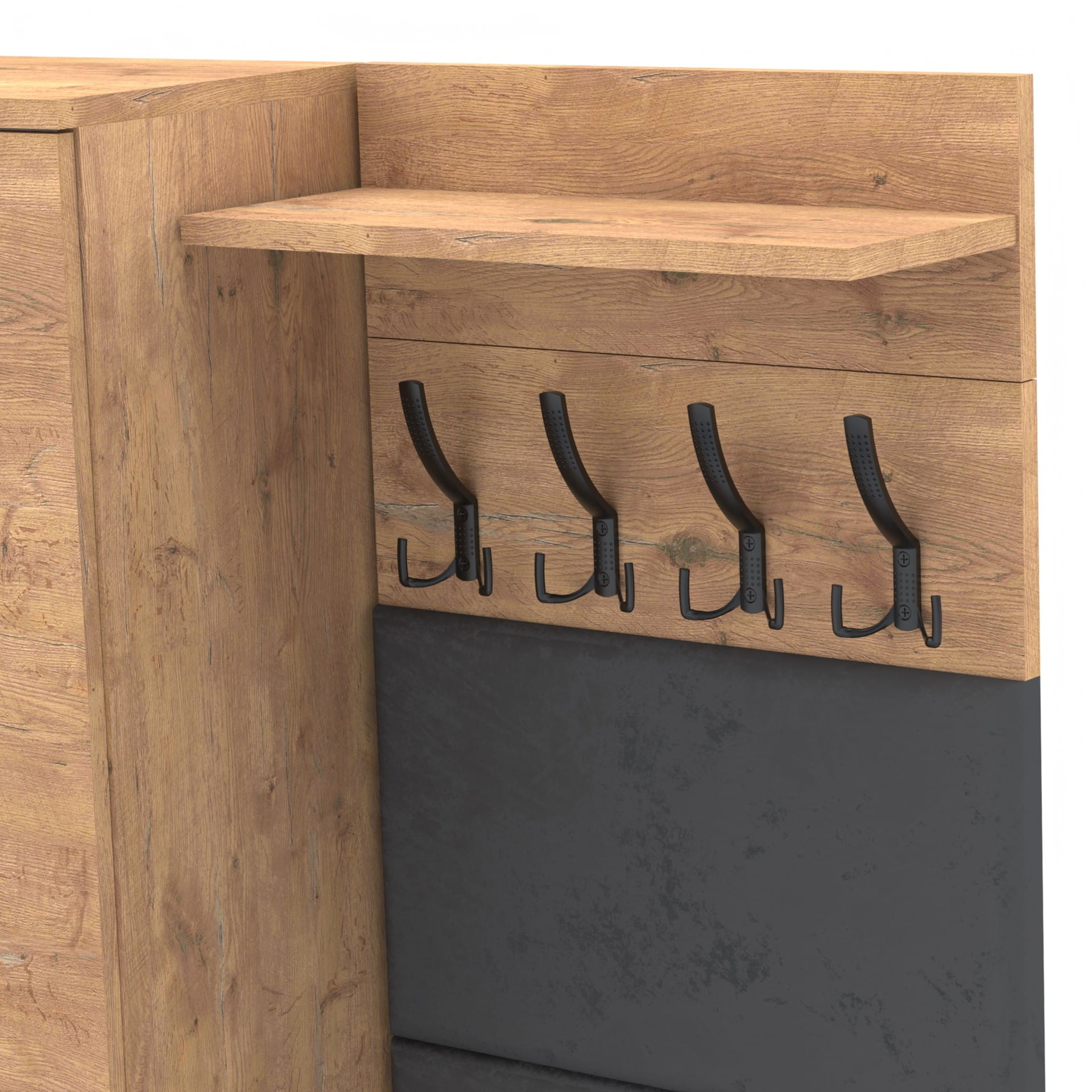 Na górze struktury znajduje się praktyczna półka o głębokości 18 cm, która jest idealna do przechowywania różnych przedmiotów. Półka nie tylko zapewnia dodatkową przestrzeń do przechowywania, ale także stanowi integralną część designu wieszaka, nadając mu ciekawy, nowoczesny wygląd.