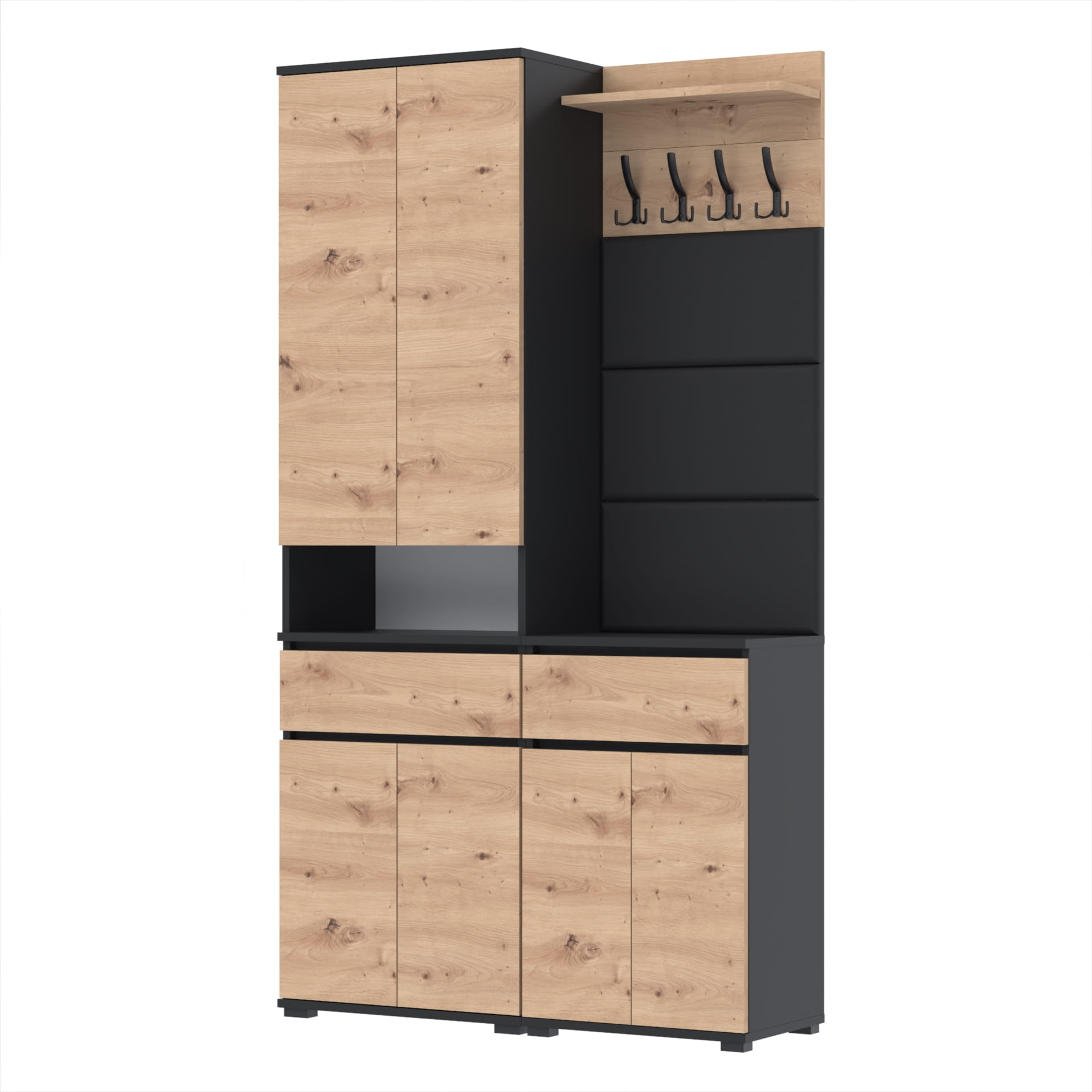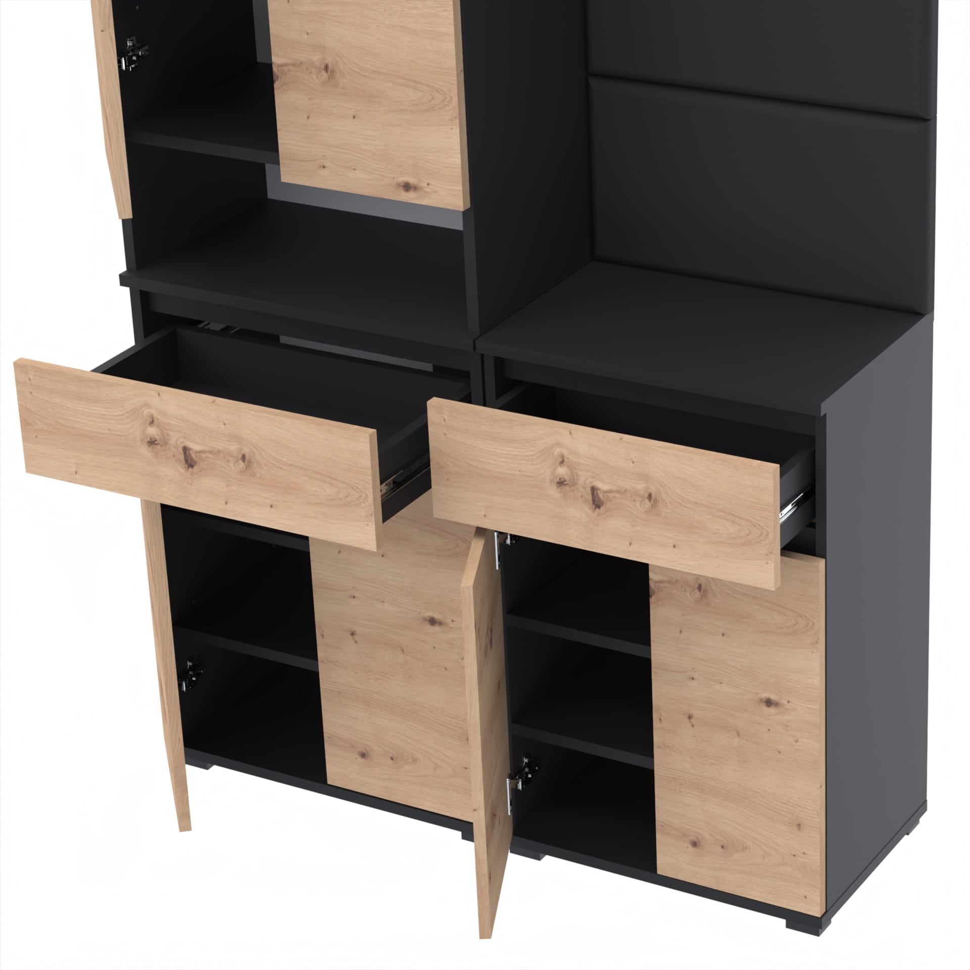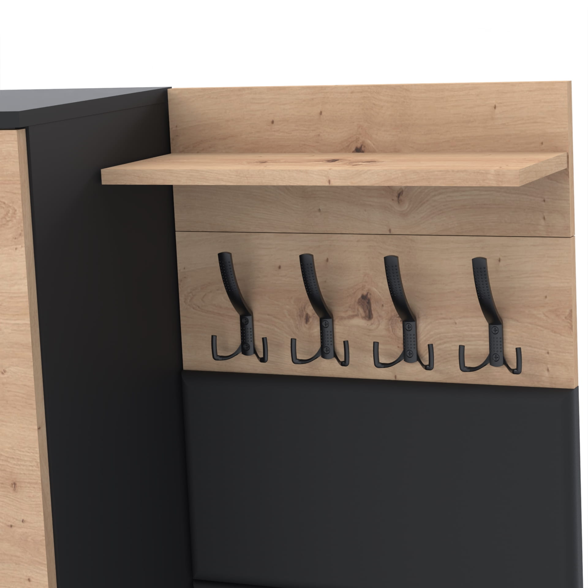 Górna część - nadstawka przynosi jeszcze więcej przestrzeni dzięki szafce z czterema poziomami oraz otwartej półce. Idealna do przechowywania butów lub ubrań. Górna część doskonale komponuje się z dolnym modułem, tworząc spójną i estetyczną całość.