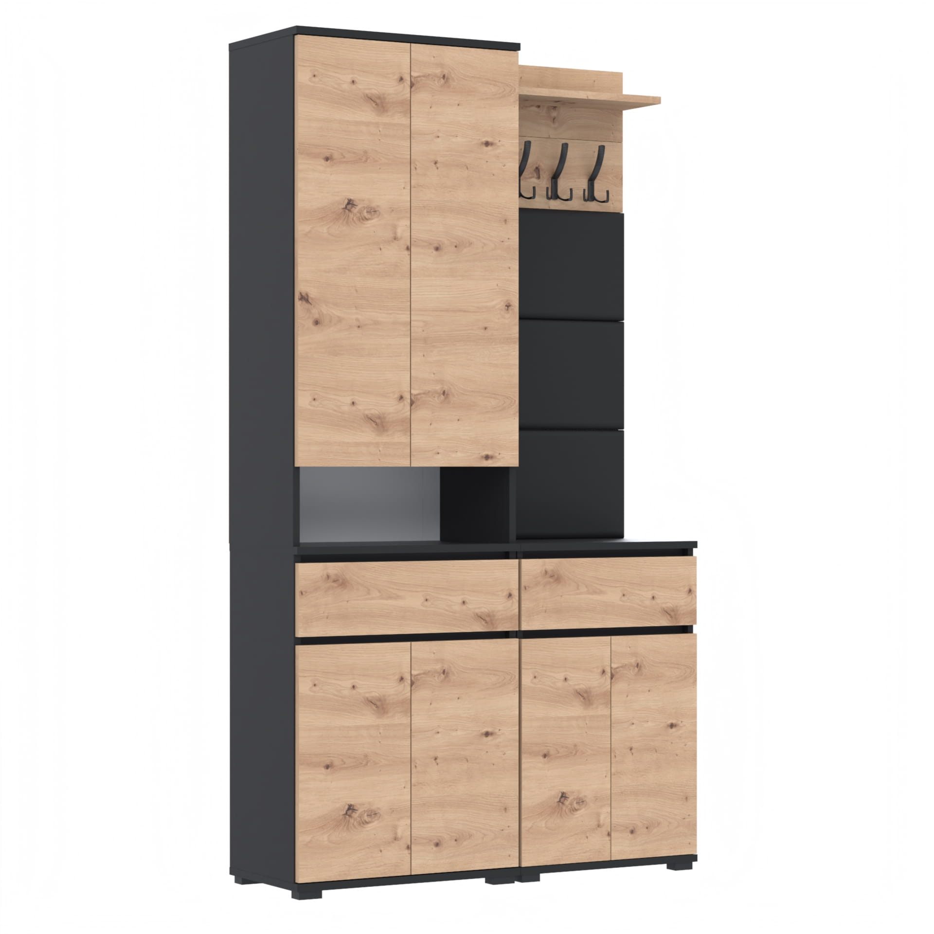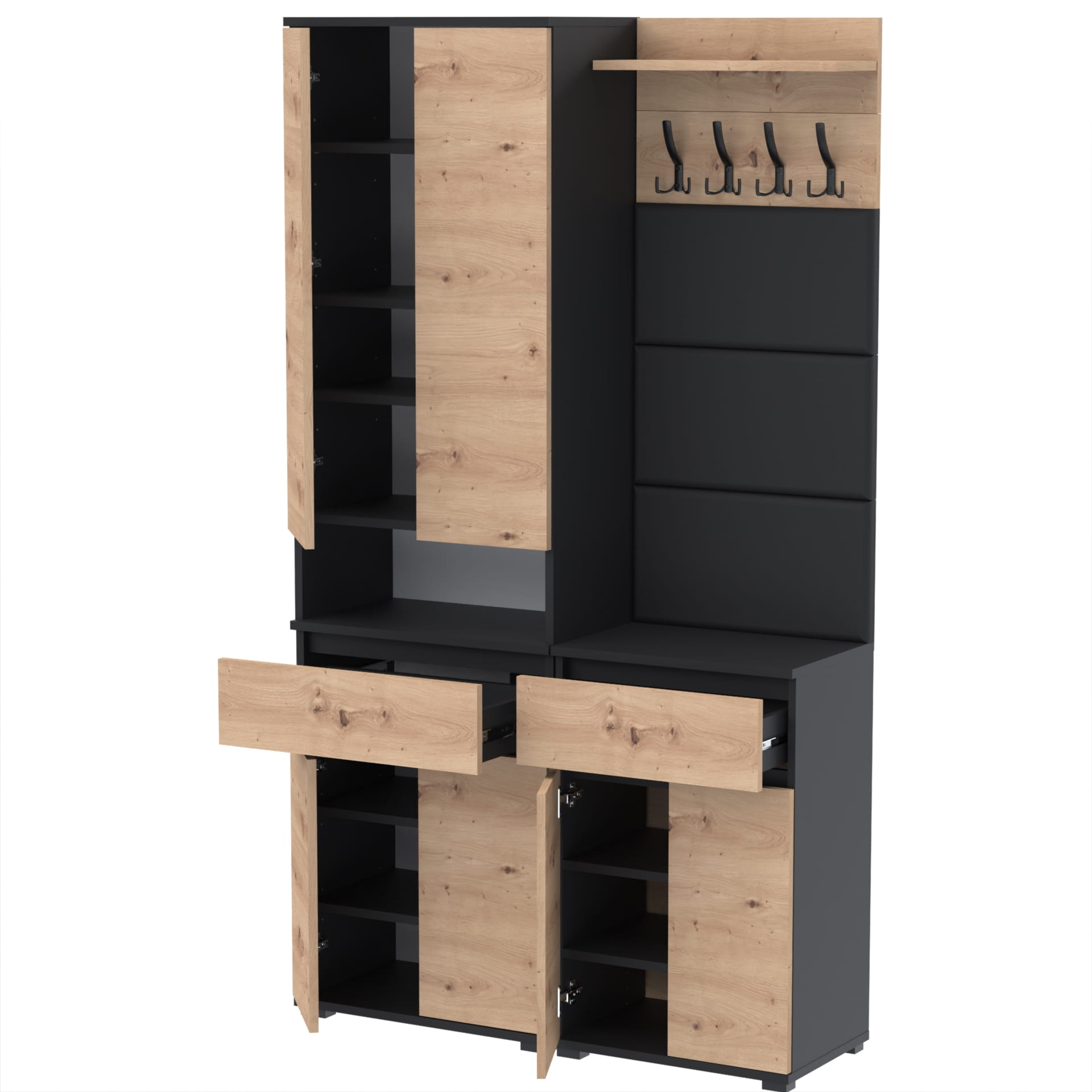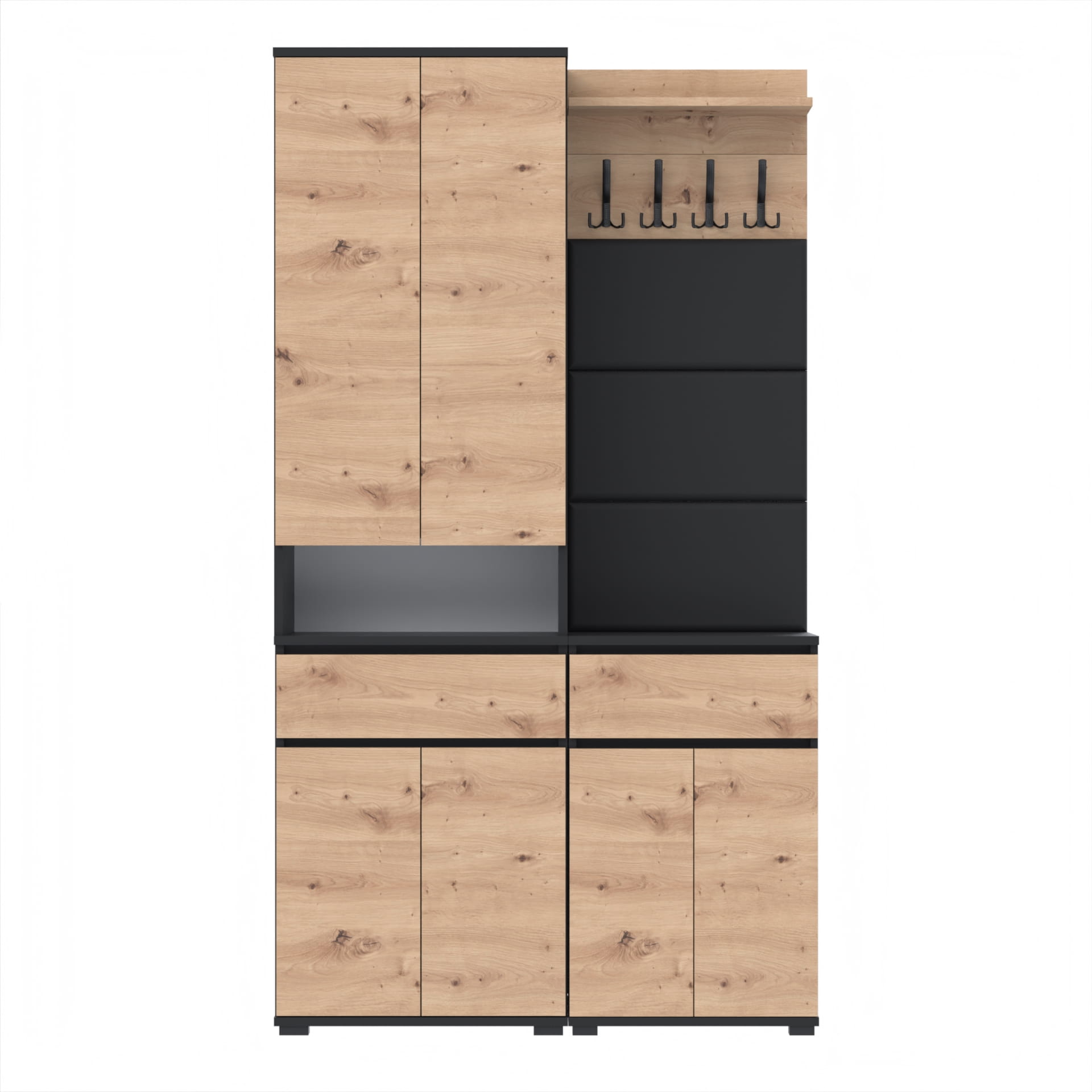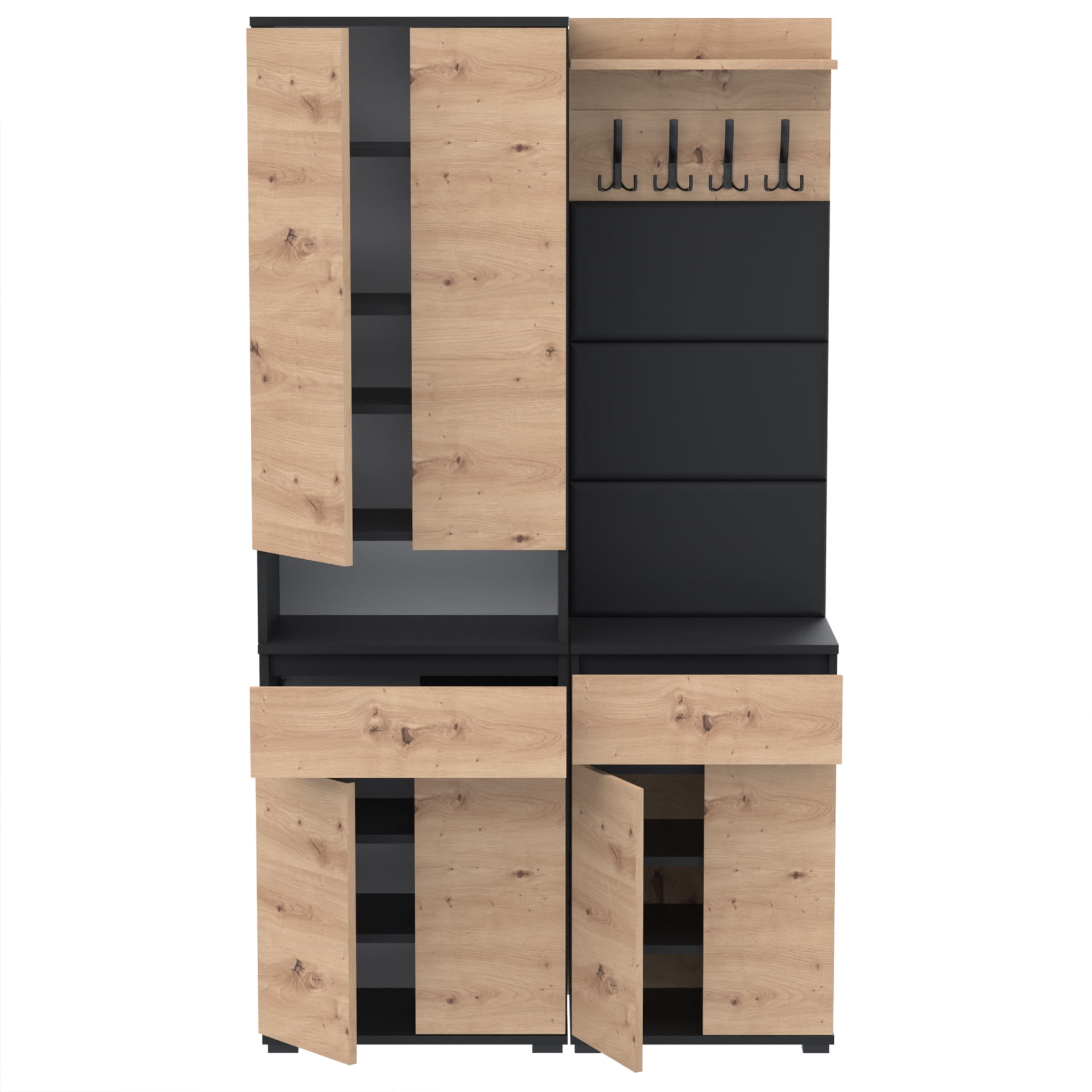 Górna część - nadstawka przynosi jeszcze więcej przestrzeni dzięki szafce z czterema poziomami oraz otwartej półce. Idealna do przechowywania butów lub ubrań. Górna część doskonale komponuje się z dolnym modułem, tworząc spójną i estetyczną całość.