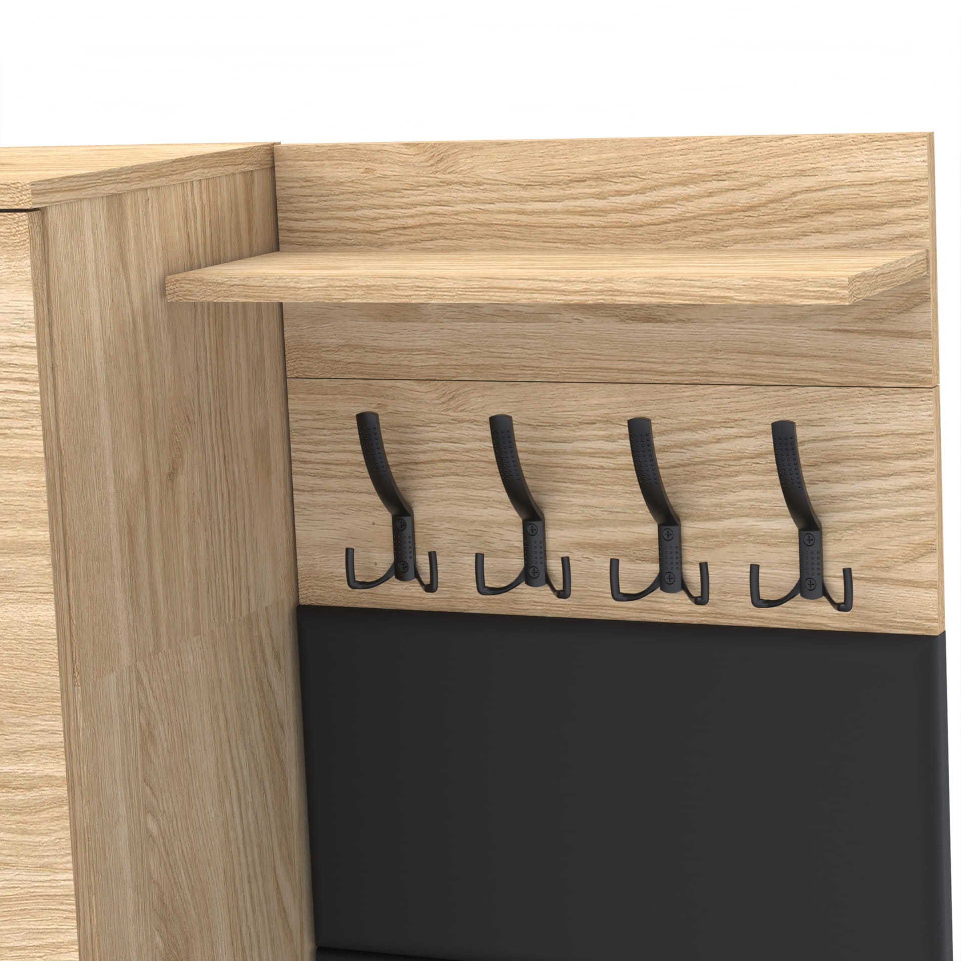 Na górze struktury znajduje się praktyczna półka o głębokości 18 cm, która jest idealna do przechowywania różnych przedmiotów. Półka nie tylko zapewnia dodatkową przestrzeń do przechowywania, ale także stanowi integralną część designu wieszaka, nadając mu ciekawy, nowoczesny wygląd.