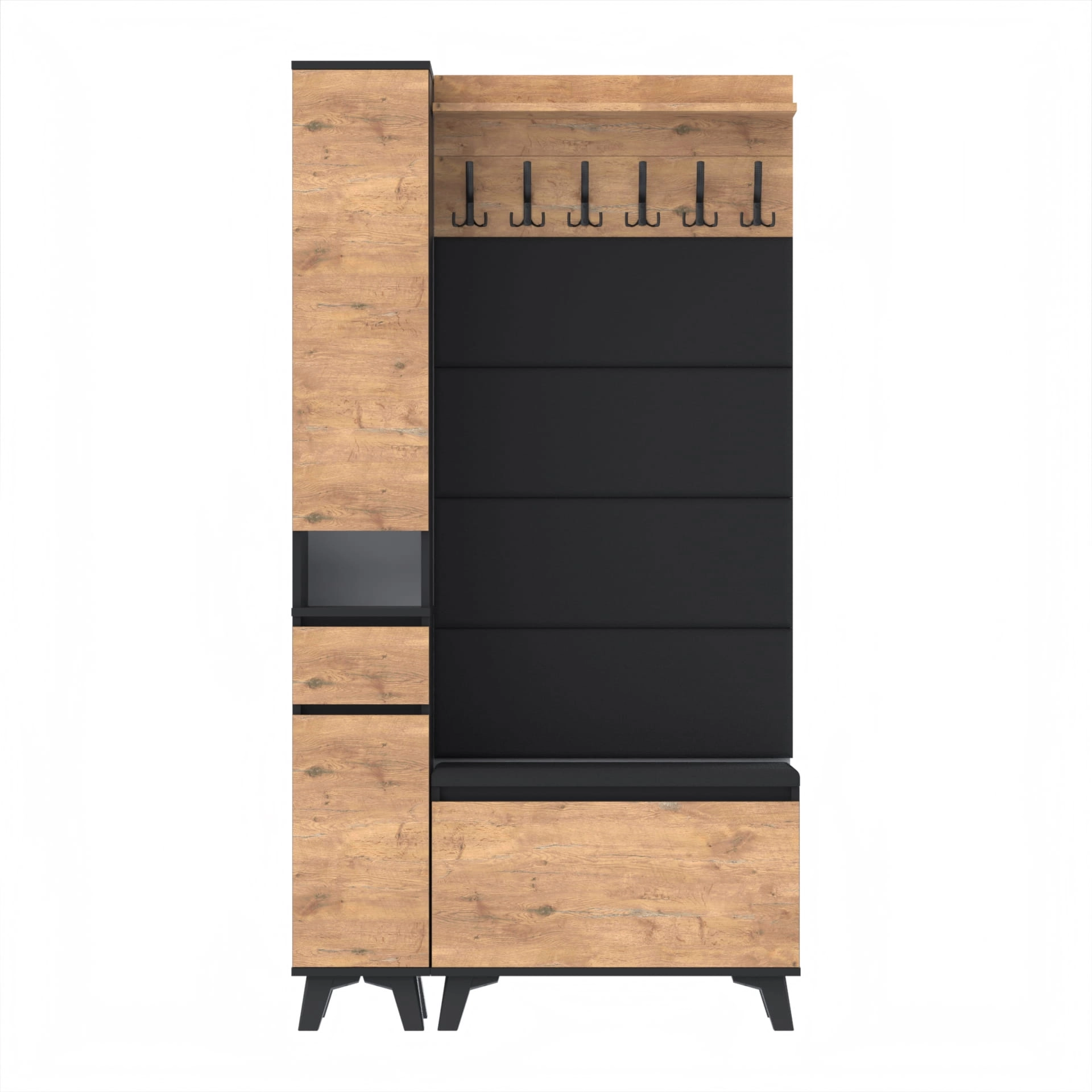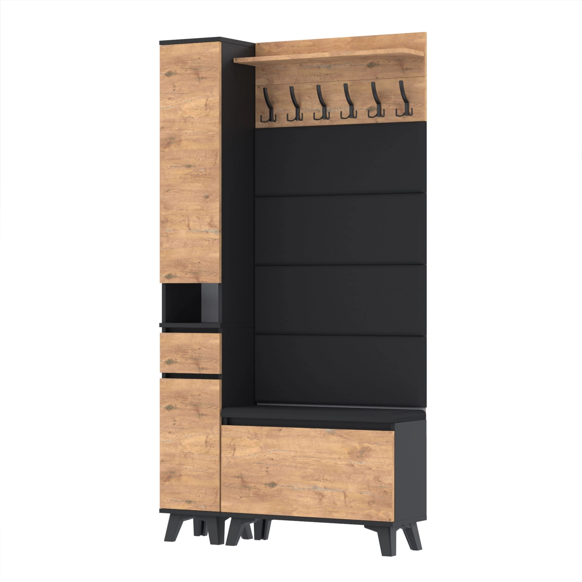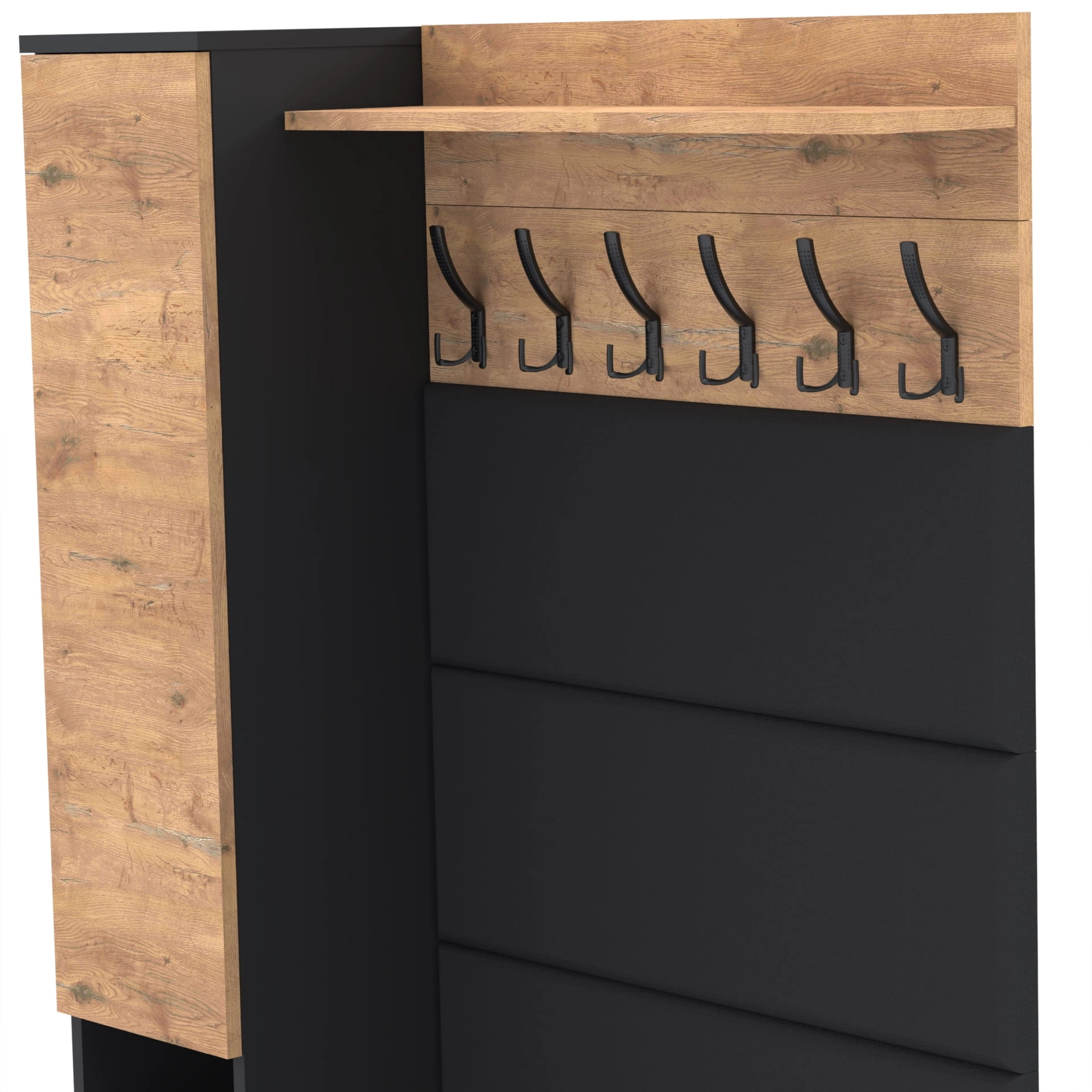 Na górze struktury znajduje się praktyczna półka o głębokości 18 cm, która jest idealna do przechowywania różnych przedmiotów. Półka nie tylko zapewnia dodatkową przestrzeń do przechowywania, ale także stanowi integralną część designu wieszaka, nadając mu ciekawy, nowoczesny wygląd.