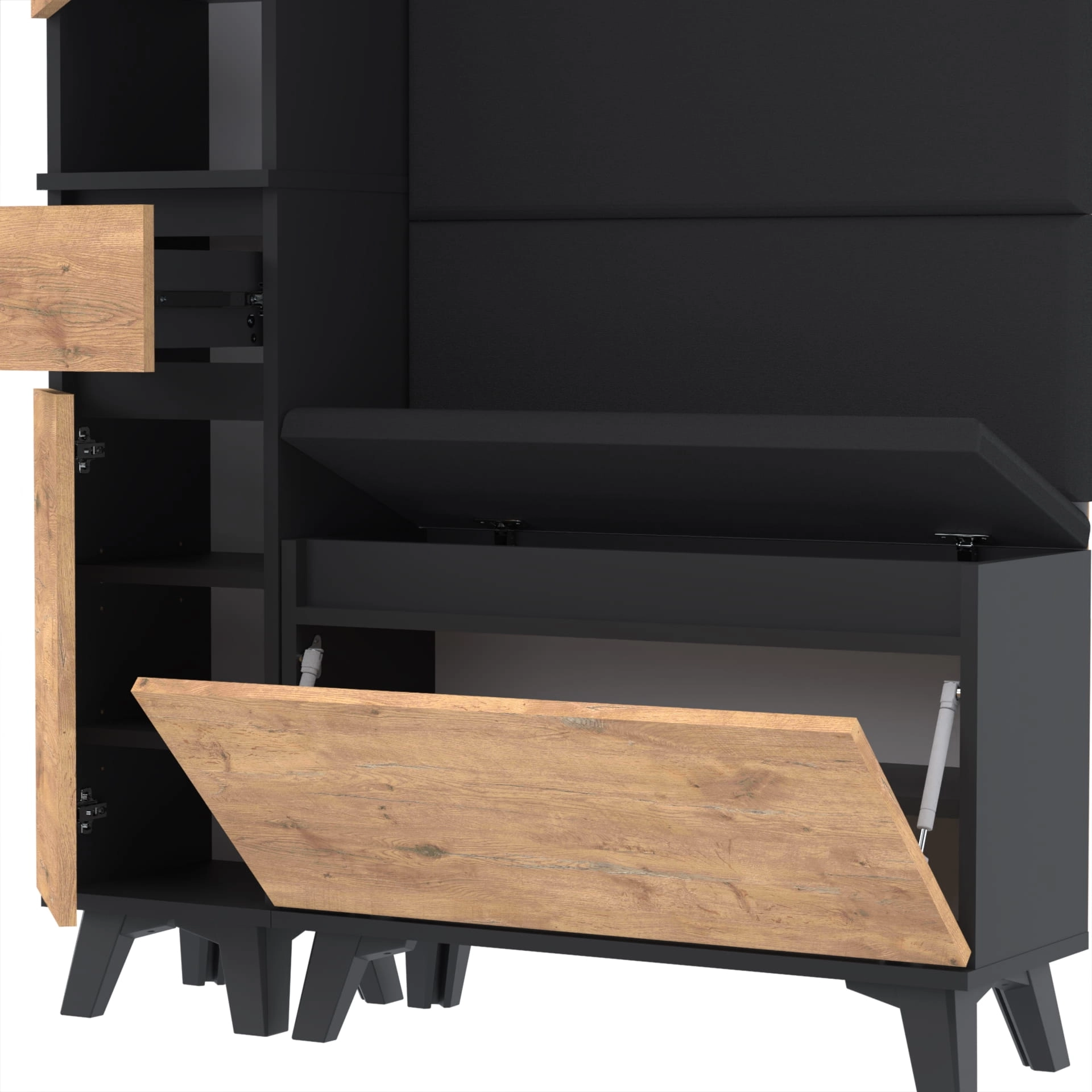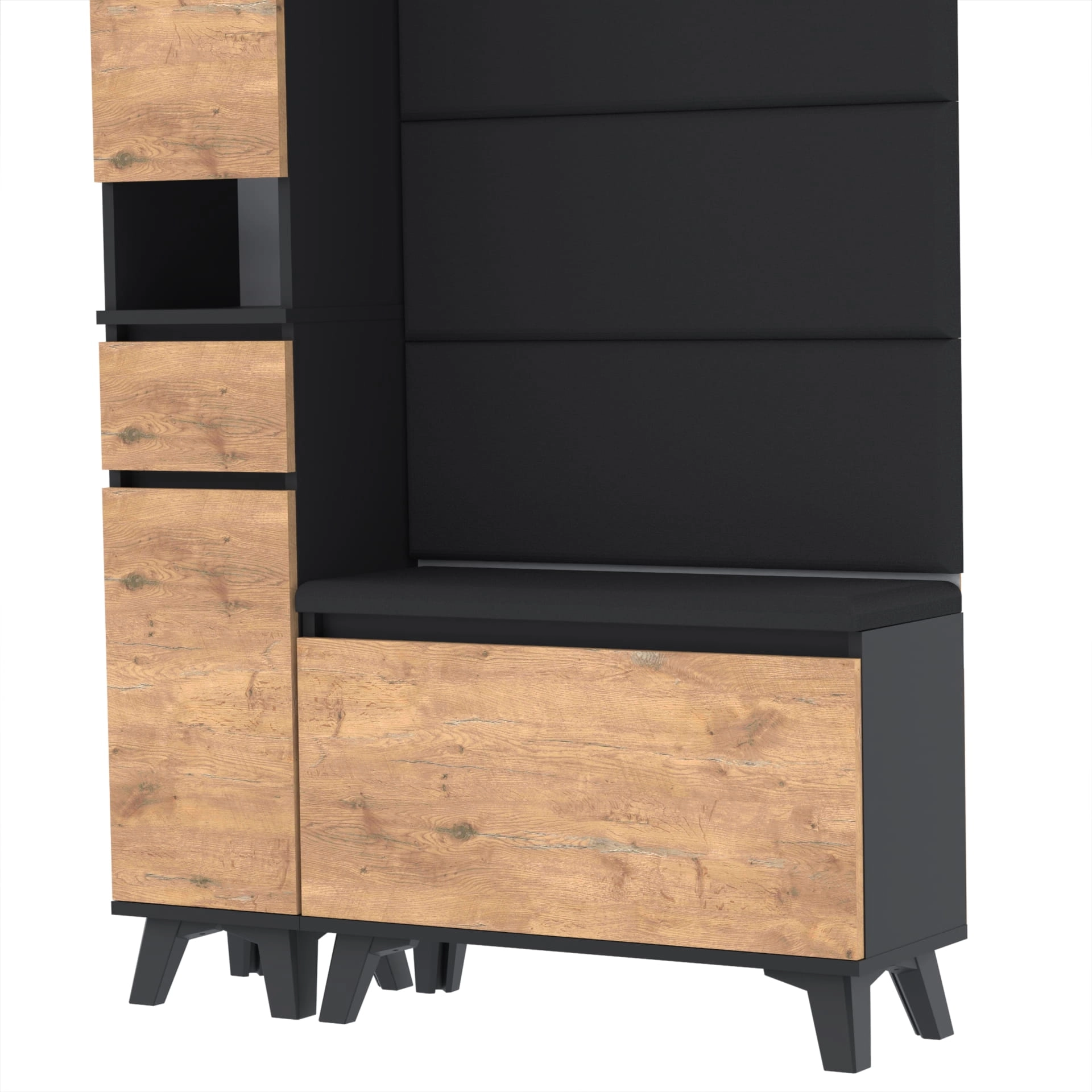 Garderoba to elegancka, funkcjonalna przestrzeń. Wyróżniającym elementem jest szafka na buty z siedziskiem i schowkiem, która ułatwia przechowywanie obuwia i drobnych przedmiotów. Ściany zdobią panele tapicerowane, nadające wnętrzu ciepły, wyrafinowany wygląd. Uzupełnieniem jest praktyczny wieszak ścienny na odzież wierzchnią i dodatkowa szafa na buty lub inne przedmioty, zapewniająca dodatkową przestrzeń do przechowywania.