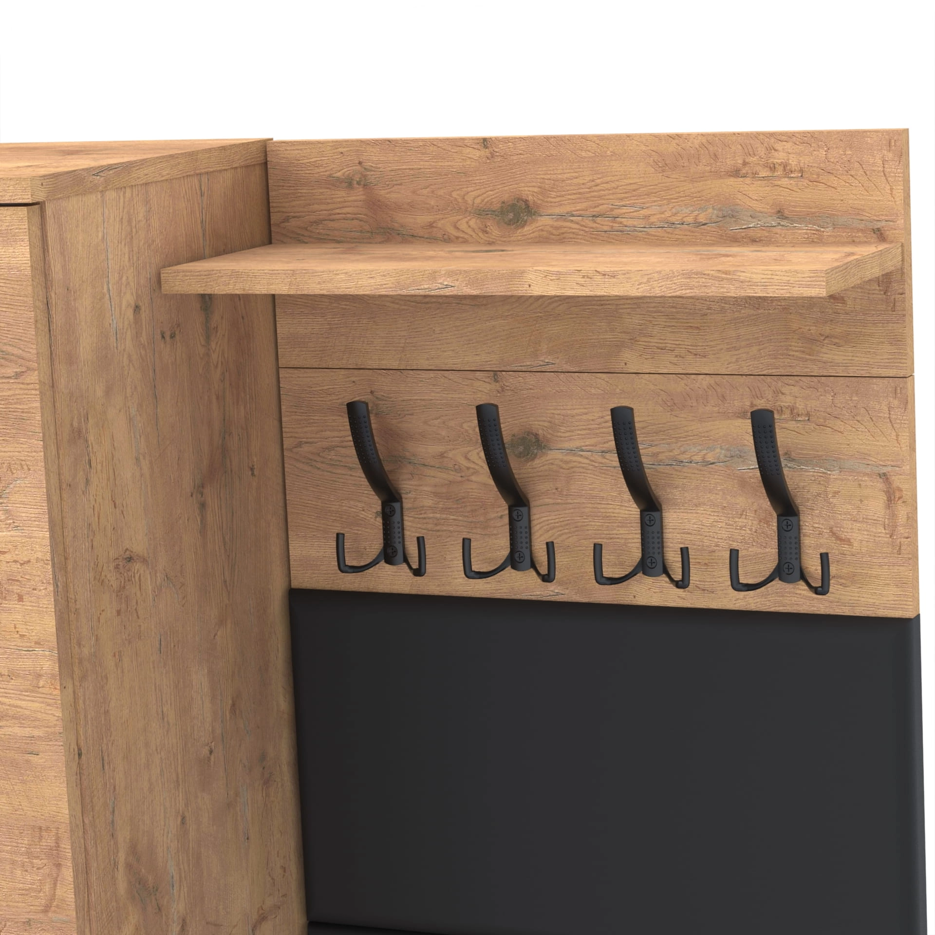 Na górze struktury znajduje się praktyczna półka o głębokości 18 cm, która jest idealna do przechowywania różnych przedmiotów. Półka nie tylko zapewnia dodatkową przestrzeń do przechowywania, ale także stanowi integralną część designu wieszaka, nadając mu ciekawy, nowoczesny wygląd.