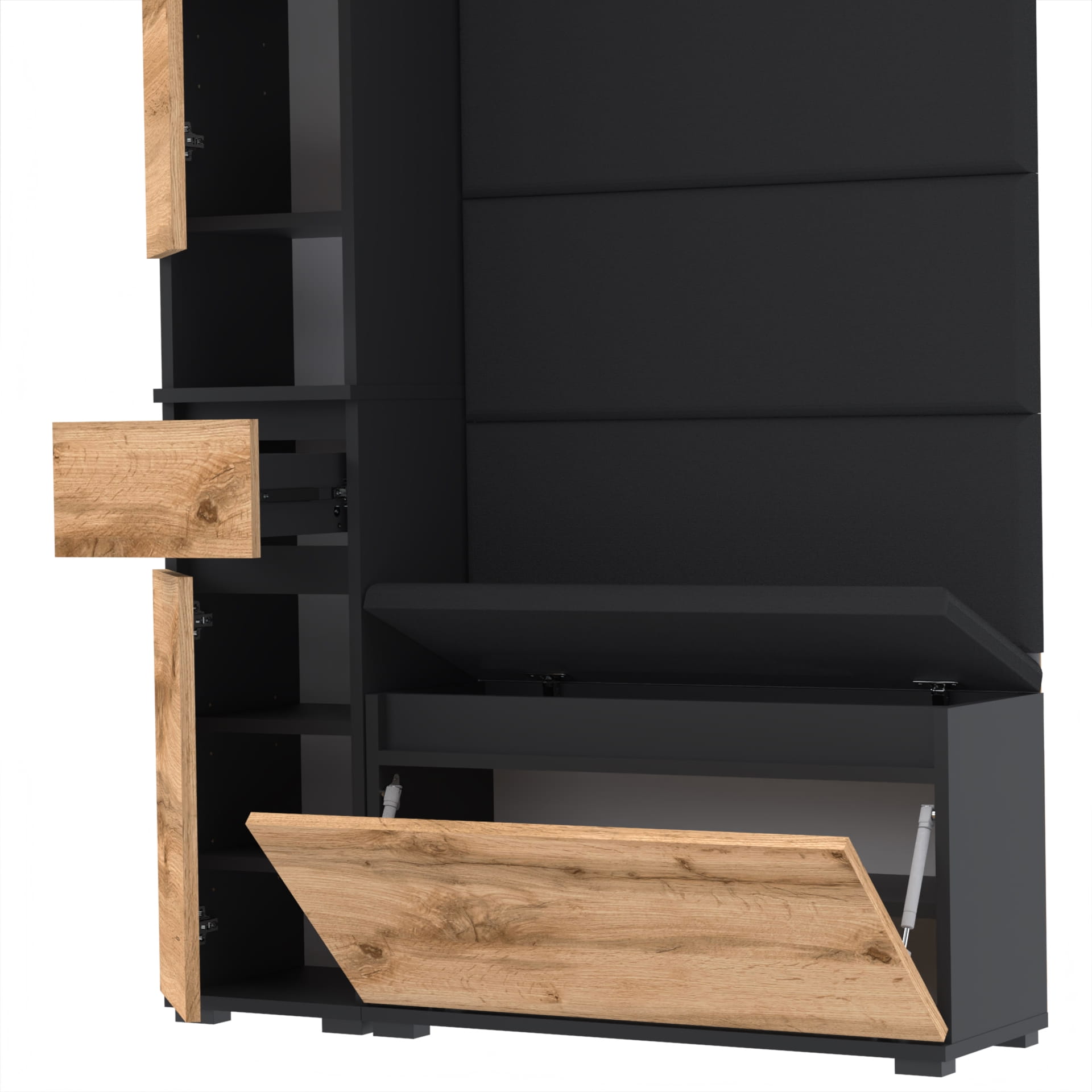 Materiał: Płyta meblowa 18mm, obrzeże ABS, okucia metalowe, nóżki 2cm z plastiku, haki wieszaka metalowe, siłowniki gazowe.