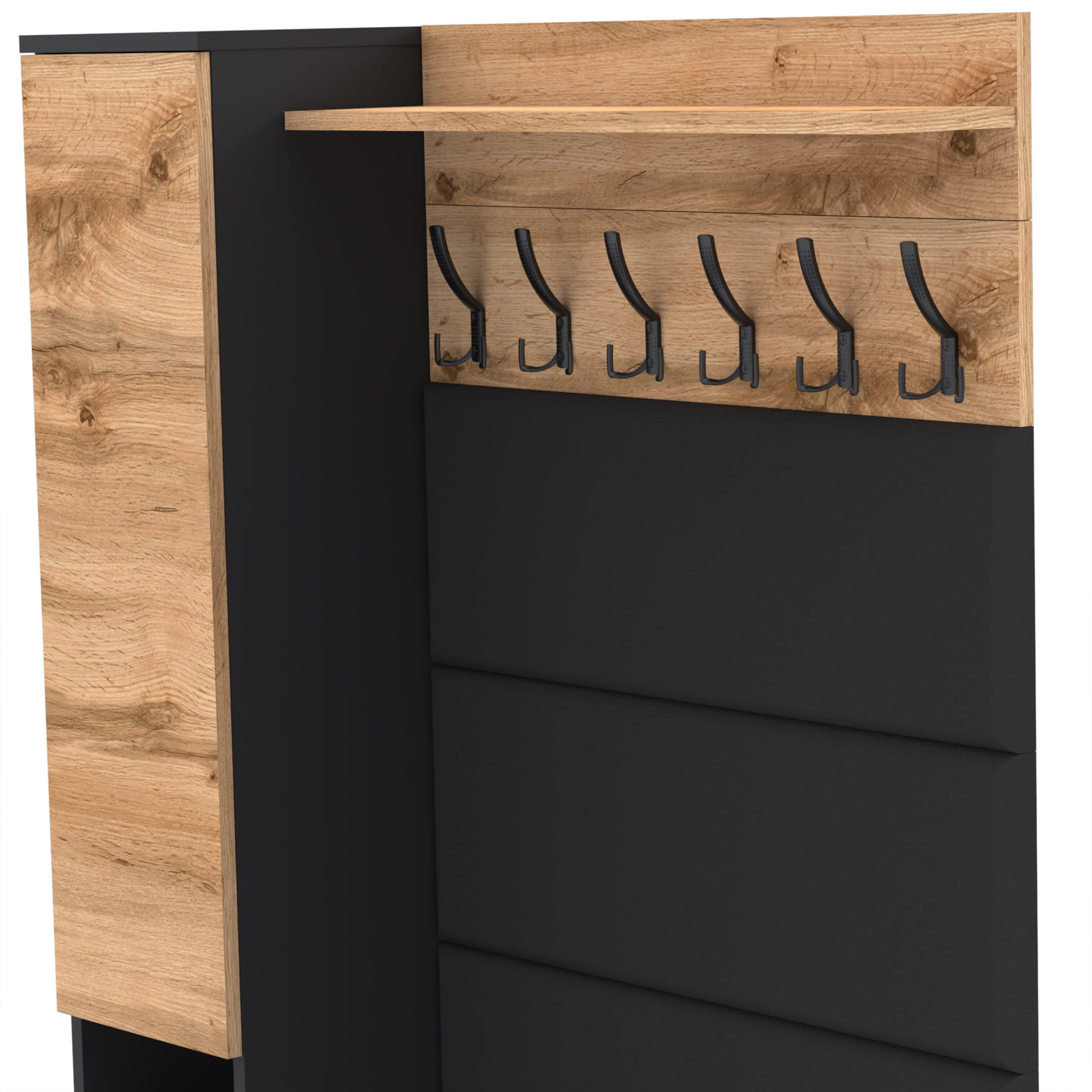Na górze struktury znajduje się praktyczna półka o głębokości 18 cm, która jest idealna do przechowywania różnych przedmiotów. Półka nie tylko zapewnia dodatkową przestrzeń do przechowywania, ale także stanowi integralną część designu wieszaka, nadając mu ciekawy, nowoczesny wygląd.