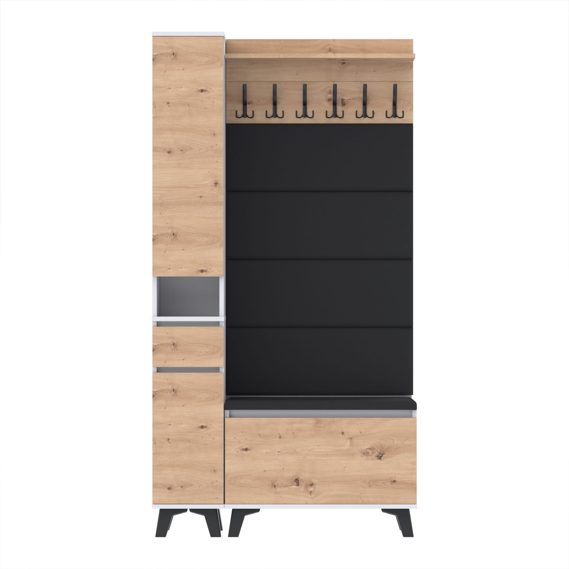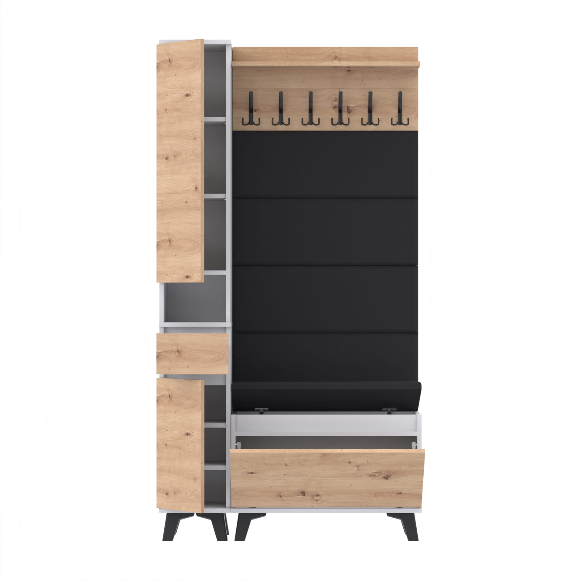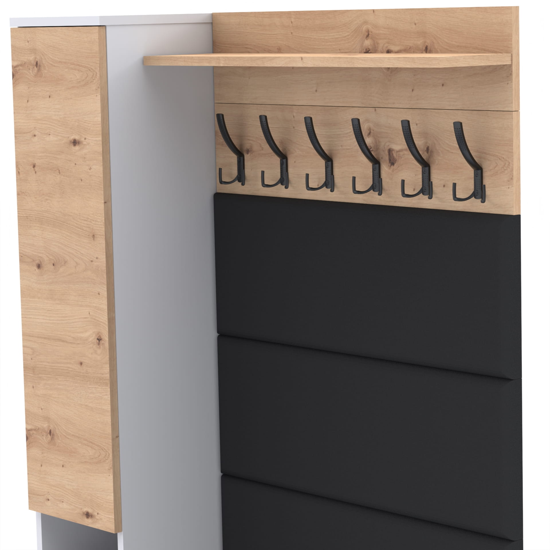Materiał: Płyta meblowa 18mm, obrzeże ABS, okucia metalowe, nóżki 12cm z plastiku, haki wieszaka metalowe.