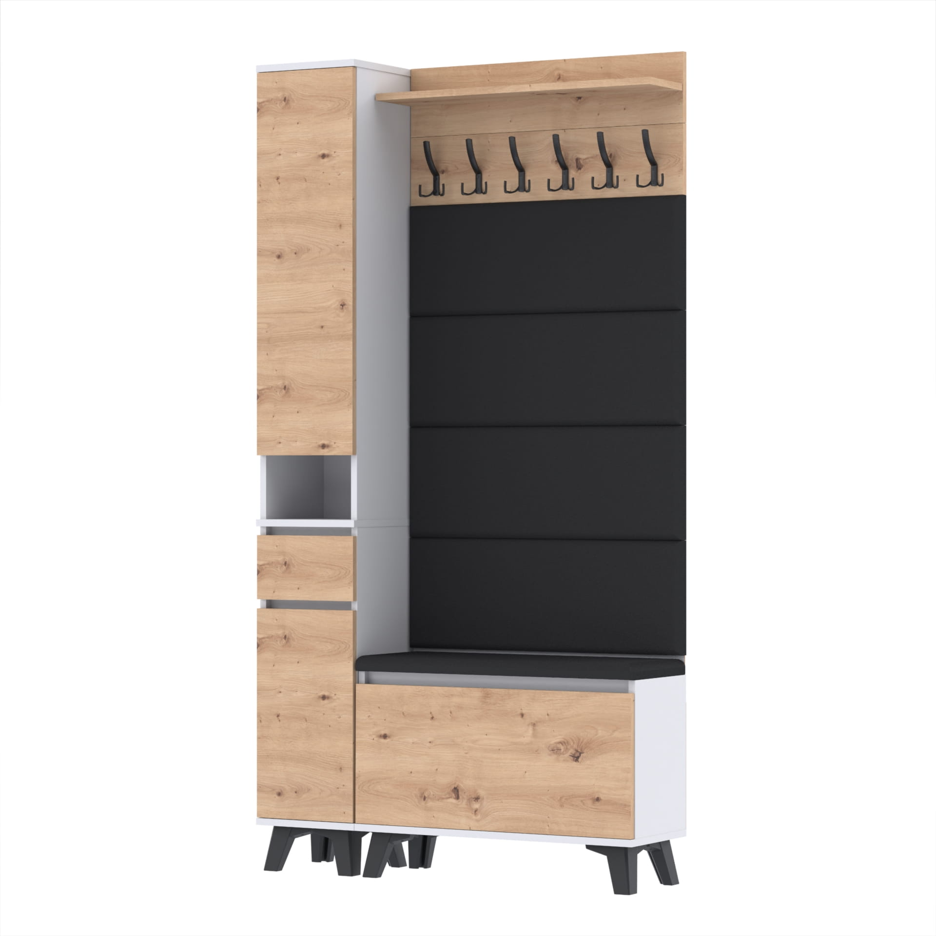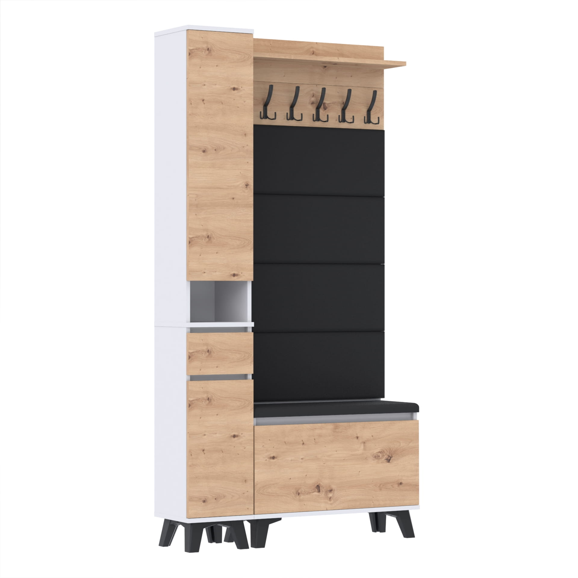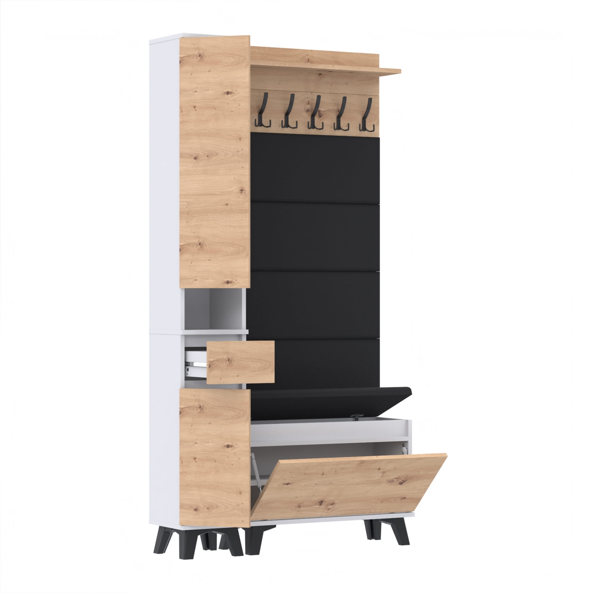 Materiał: Płyta meblowa 18mm, obrzeże ABS, okucia metalowe, nóżki 12cm z plastiku, haki wieszaka metalowe.