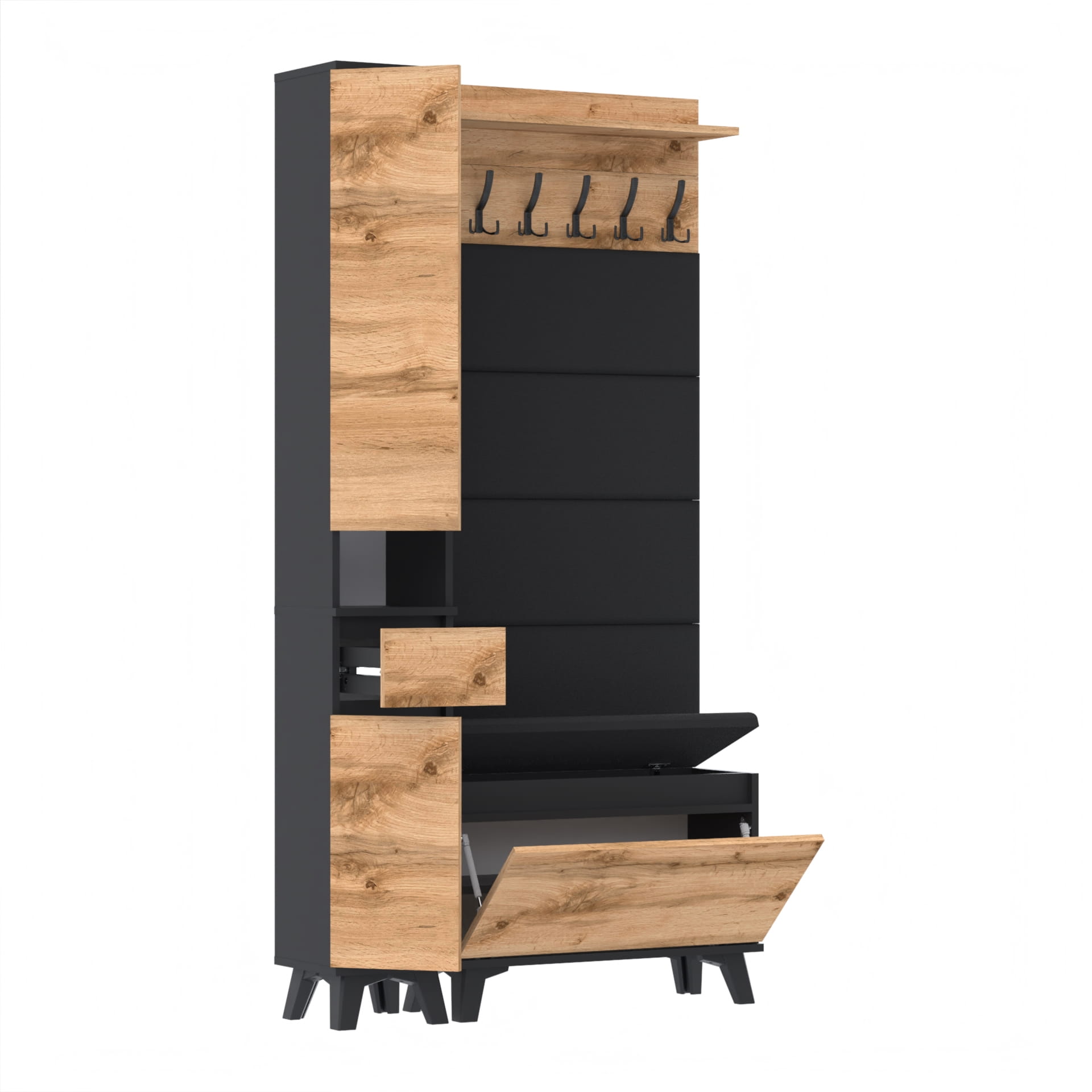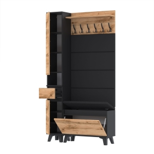 Szafka na buty jest nie tylko wygodna, ale także praktyczna - wewnątrz znajduje się półka, która pozwala na przechowywanie większej ilości obuwia. Dodatkowo, szafka jest wyposażona w schowek na przybory, dzięki czemu wszystko, czego potrzebujesz, jest zawsze pod ręką.