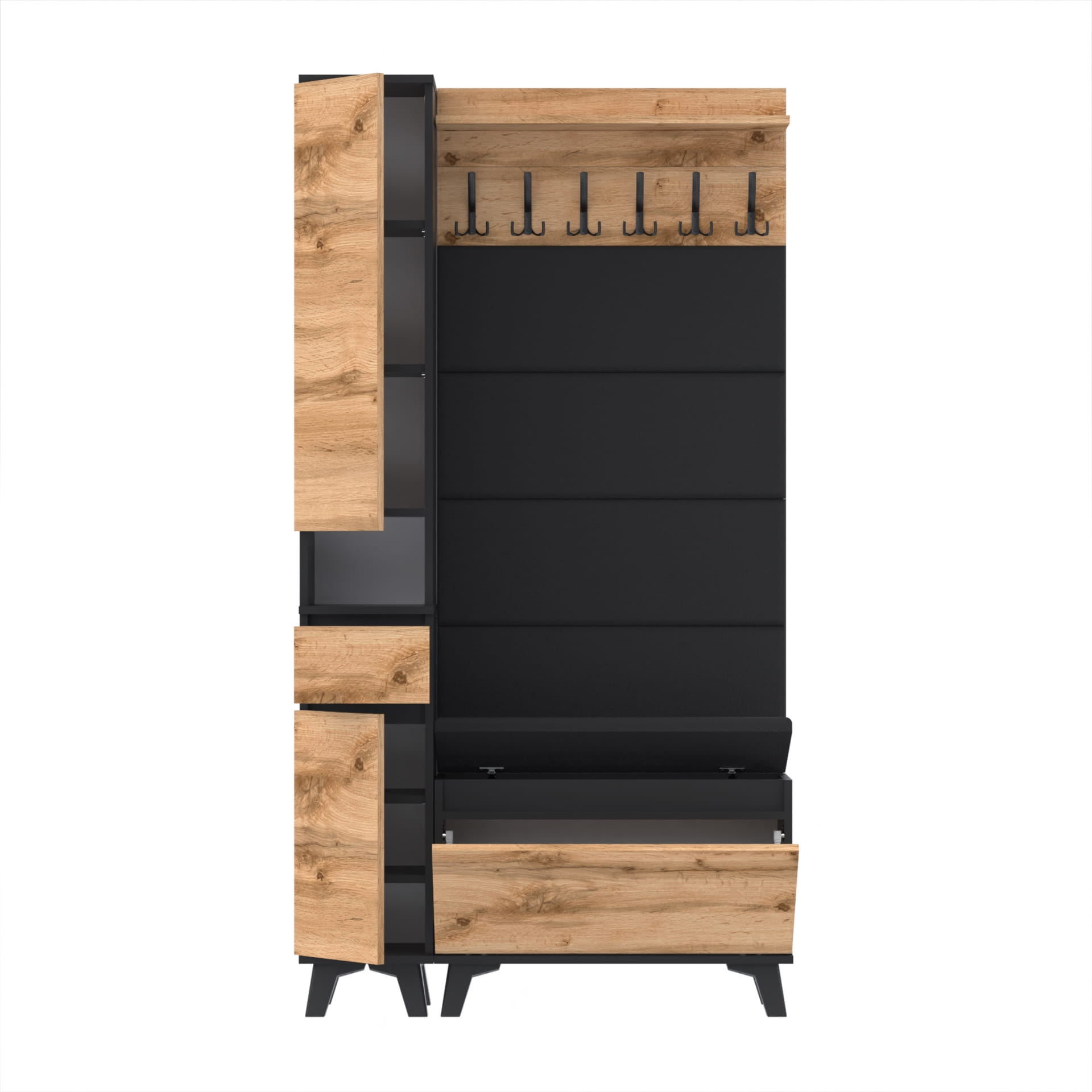 Na górze struktury znajduje się praktyczna półka o głębokości 18 cm, która jest idealna do przechowywania różnych przedmiotów. Półka nie tylko zapewnia dodatkową przestrzeń do przechowywania, ale także stanowi integralną część designu wieszaka, nadając mu ciekawy, nowoczesny wygląd.