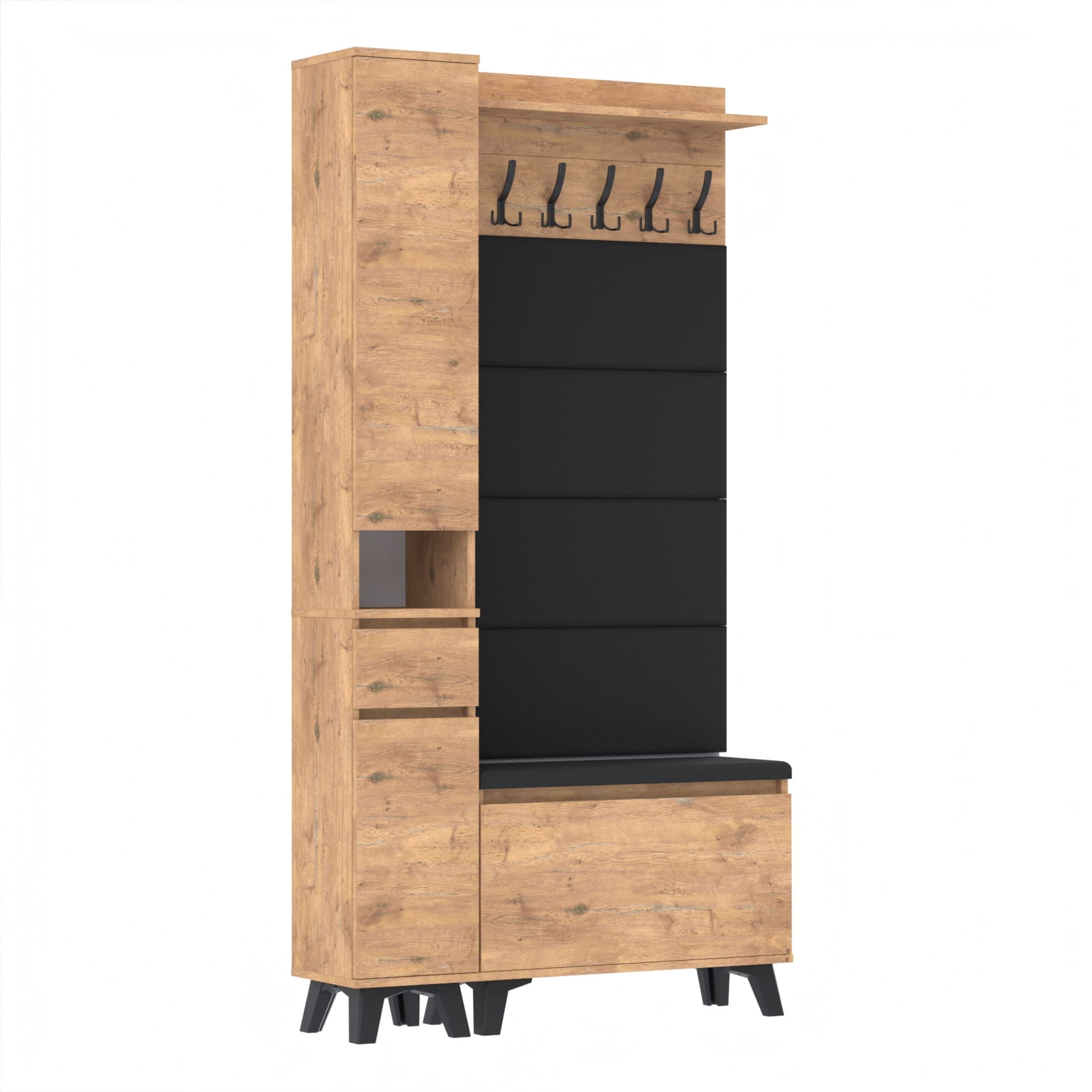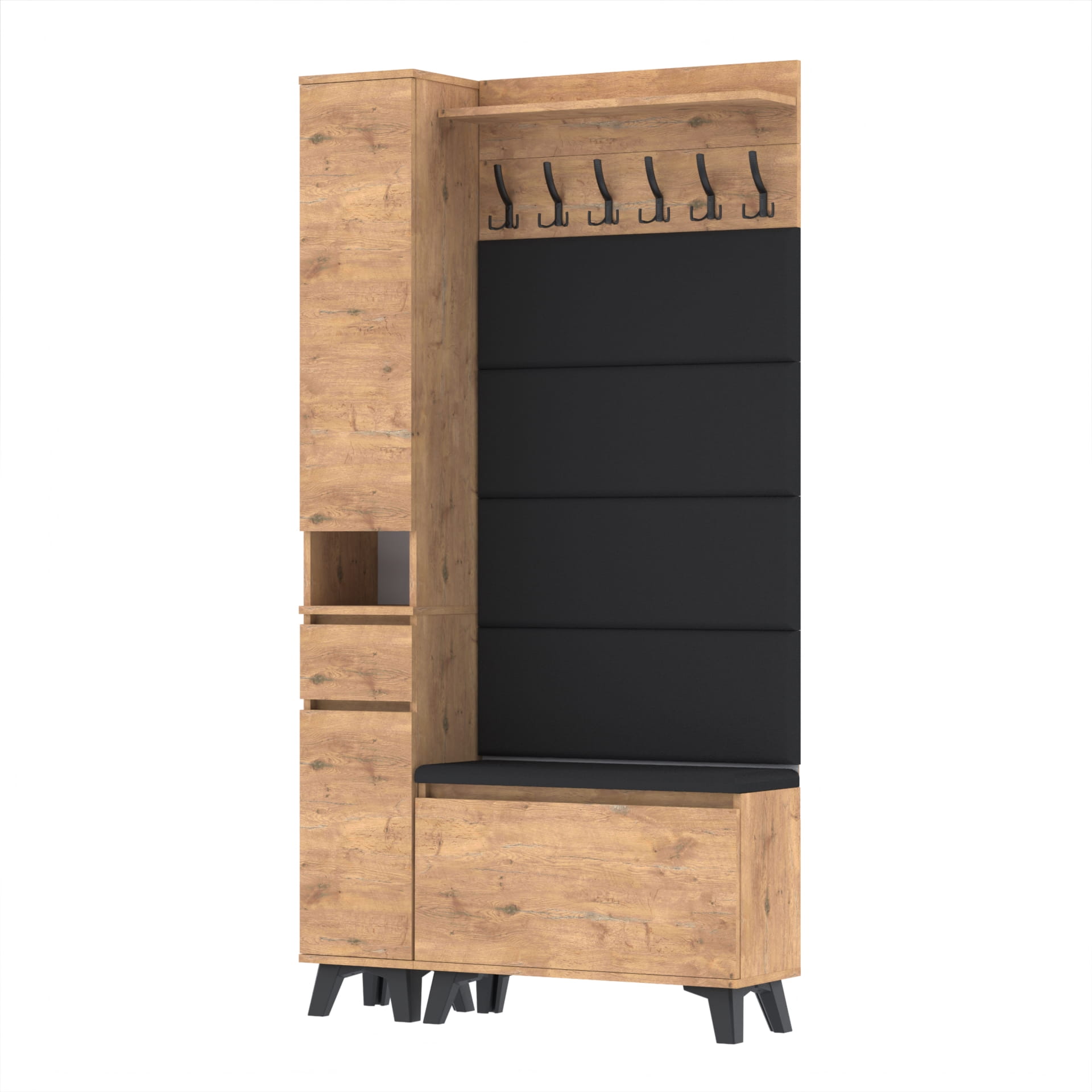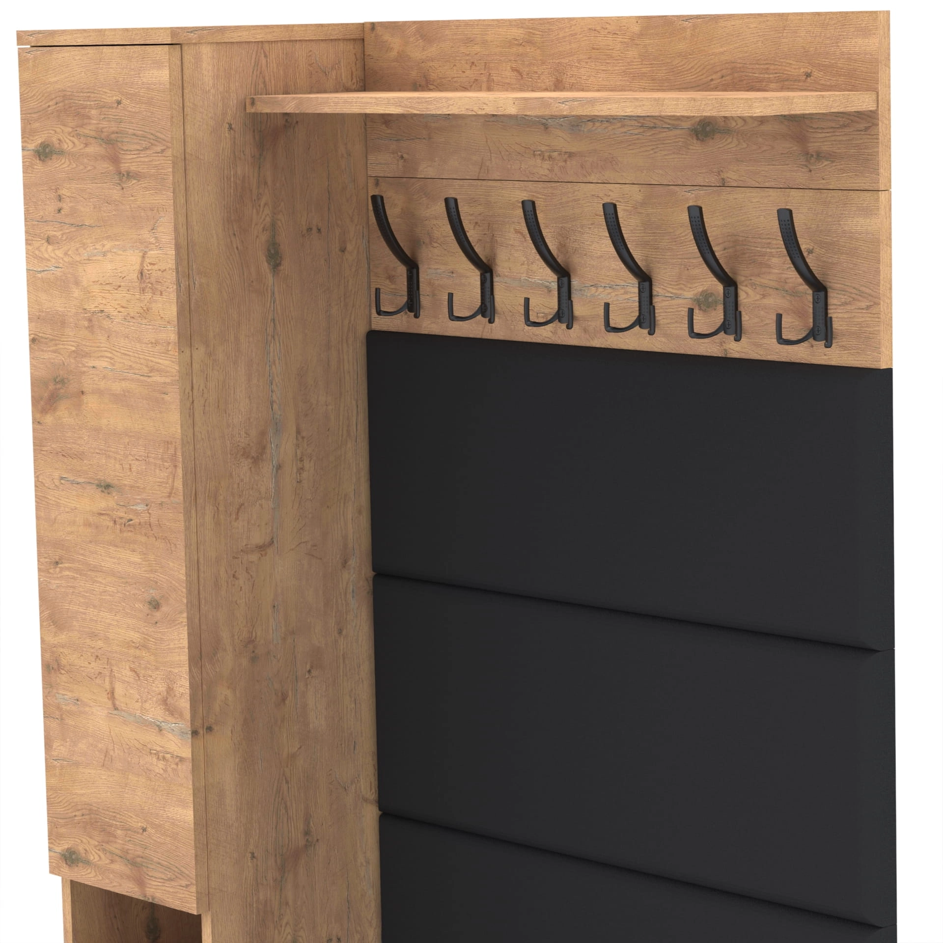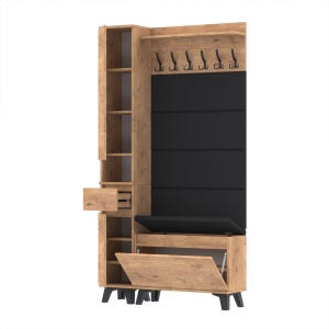 Na górze struktury znajduje się praktyczna półka o głębokości 18 cm, która jest idealna do przechowywania różnych przedmiotów. Półka nie tylko zapewnia dodatkową przestrzeń do przechowywania, ale także stanowi integralną część designu wieszaka, nadając mu ciekawy, nowoczesny wygląd.