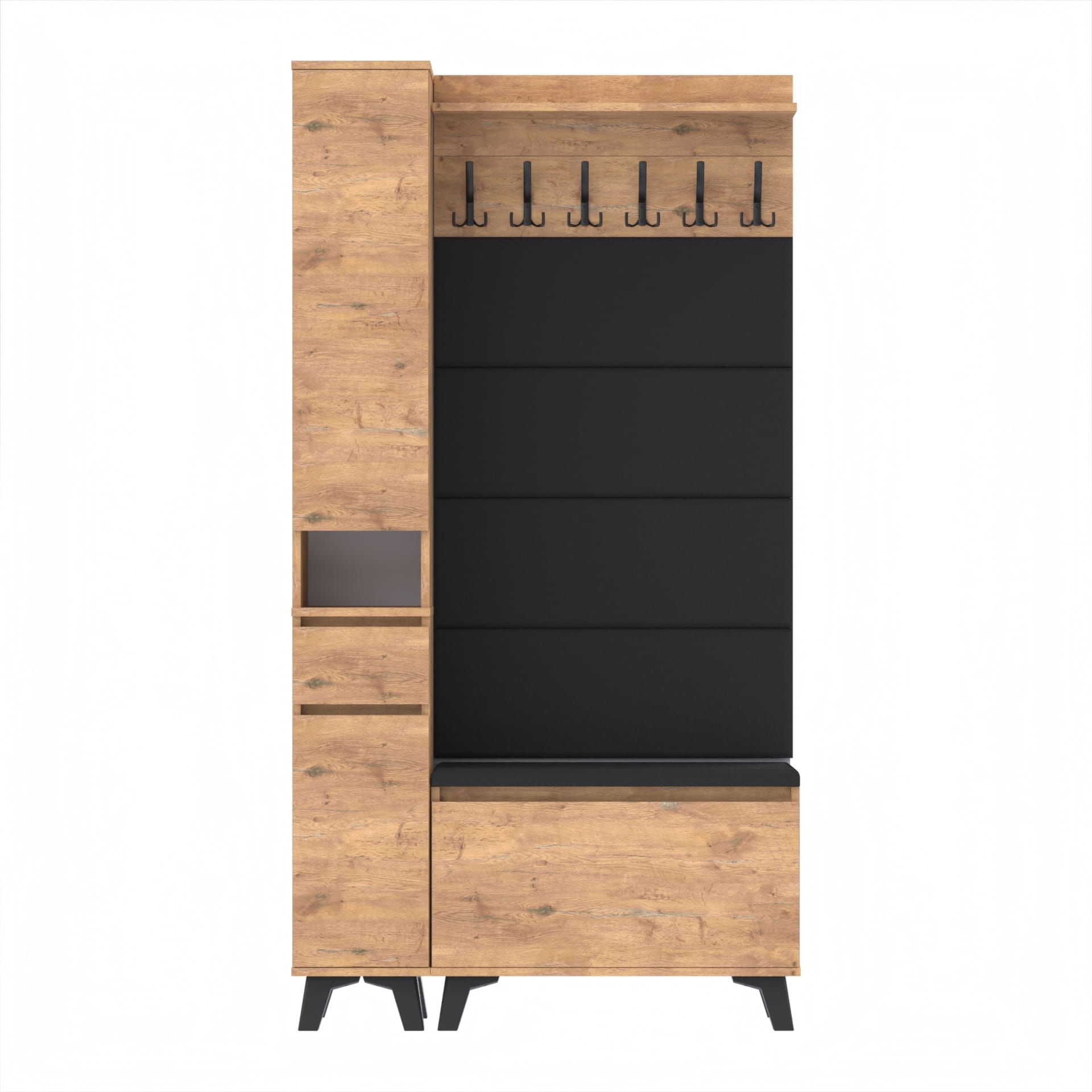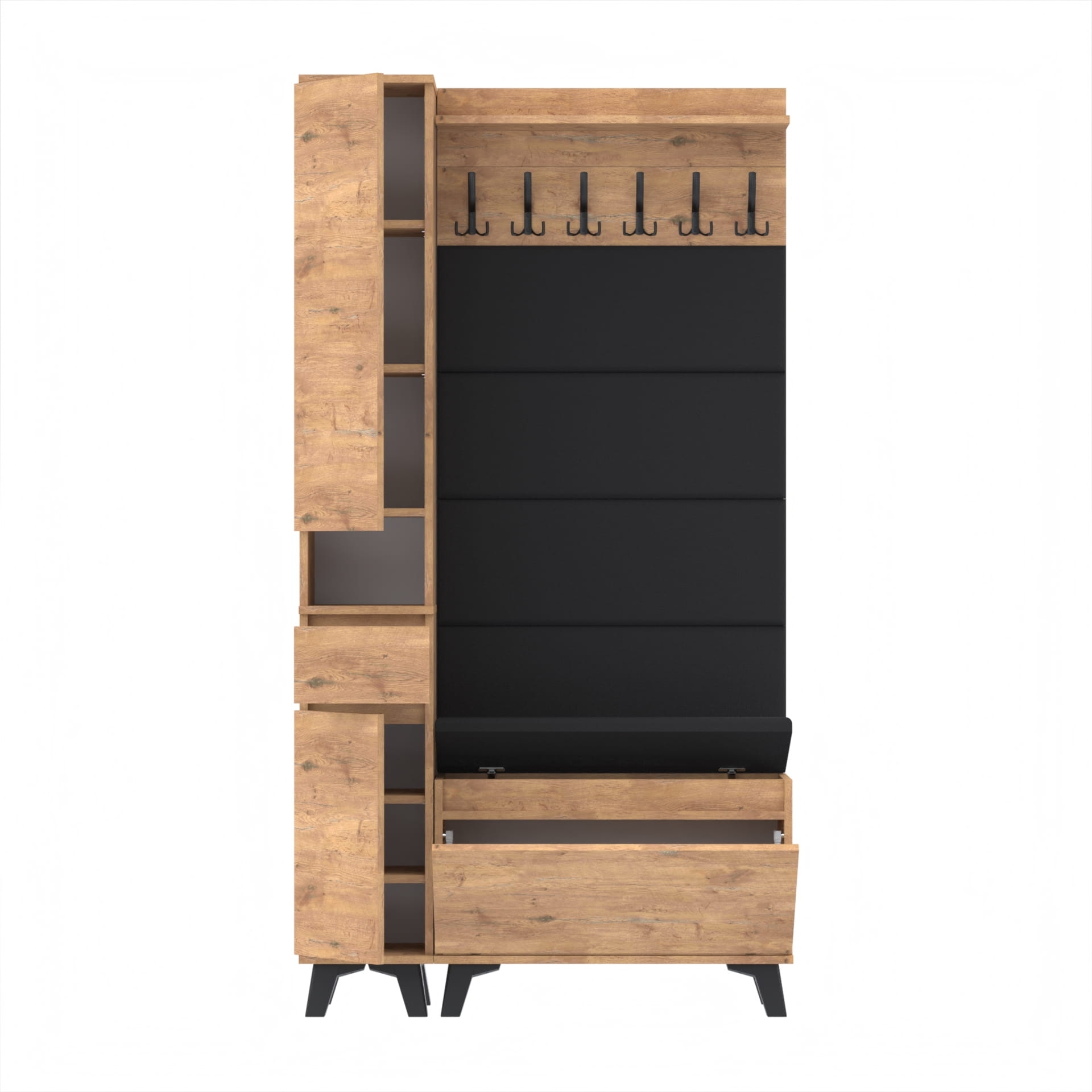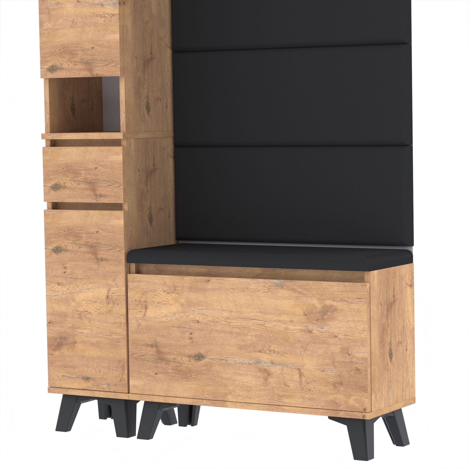 Na górze struktury znajduje się praktyczna półka o głębokości 18 cm, która jest idealna do przechowywania różnych przedmiotów. Półka nie tylko zapewnia dodatkową przestrzeń do przechowywania, ale także stanowi integralną część designu wieszaka, nadając mu ciekawy, nowoczesny wygląd.