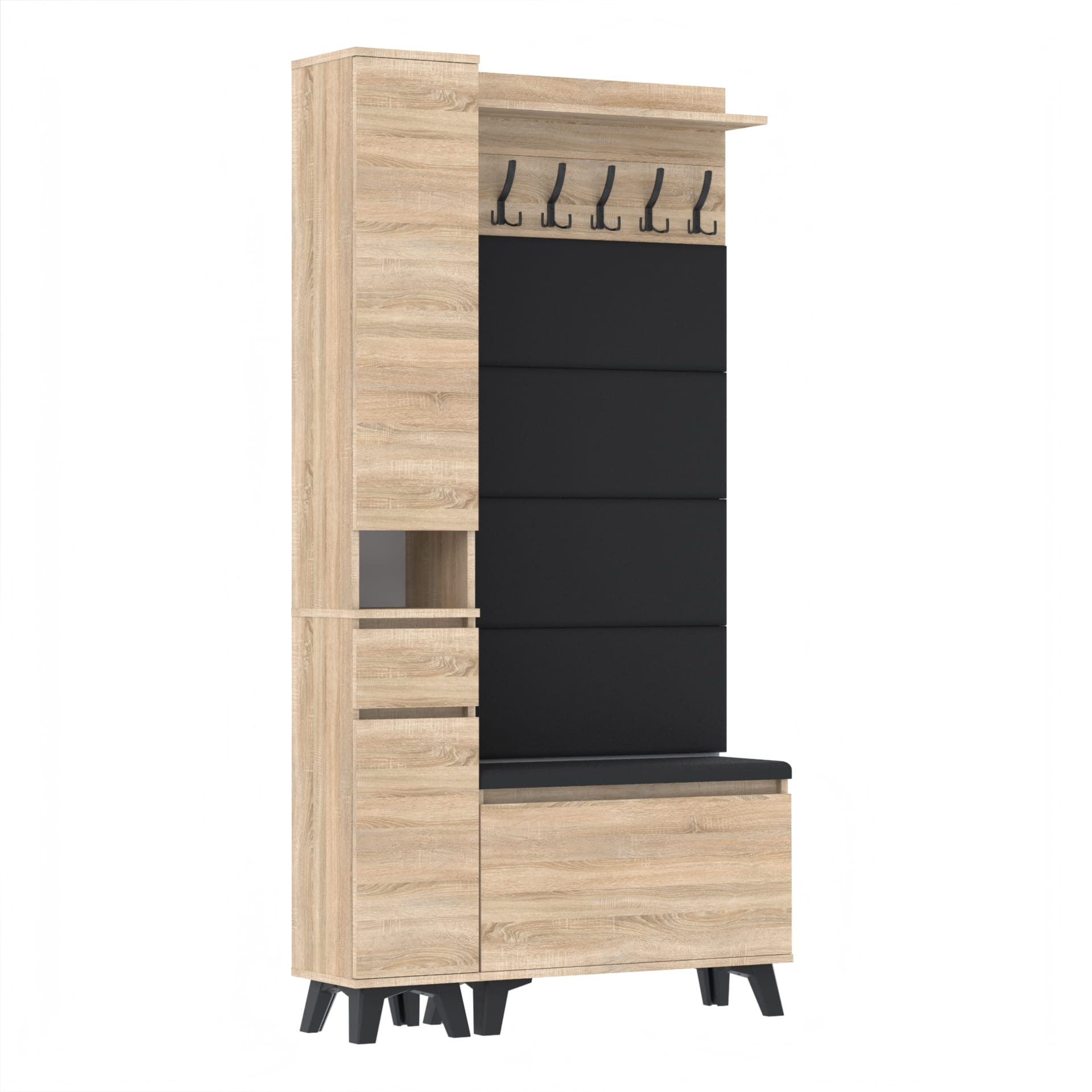 Materiał: Płyta meblowa 18mm, obrzeże ABS, okucia metalowe, nóżki 12cm z plastiku, haki wieszaka metalowe.