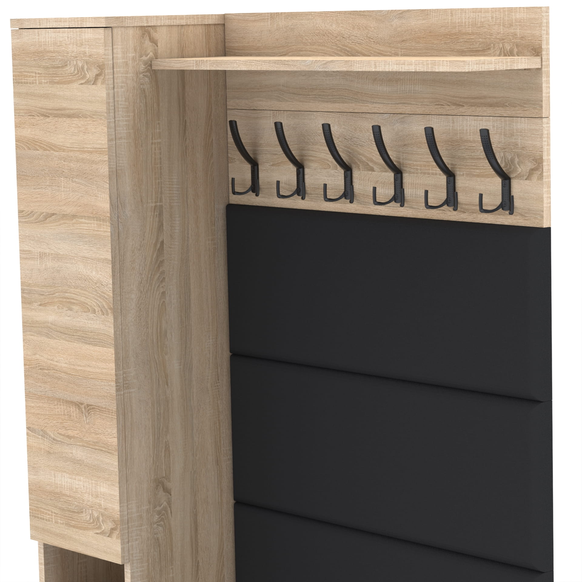 Na górze struktury znajduje się praktyczna półka o głębokości 18 cm, która jest idealna do przechowywania różnych przedmiotów. Półka nie tylko zapewnia dodatkową przestrzeń do przechowywania, ale także stanowi integralną część designu wieszaka, nadając mu ciekawy, nowoczesny wygląd.