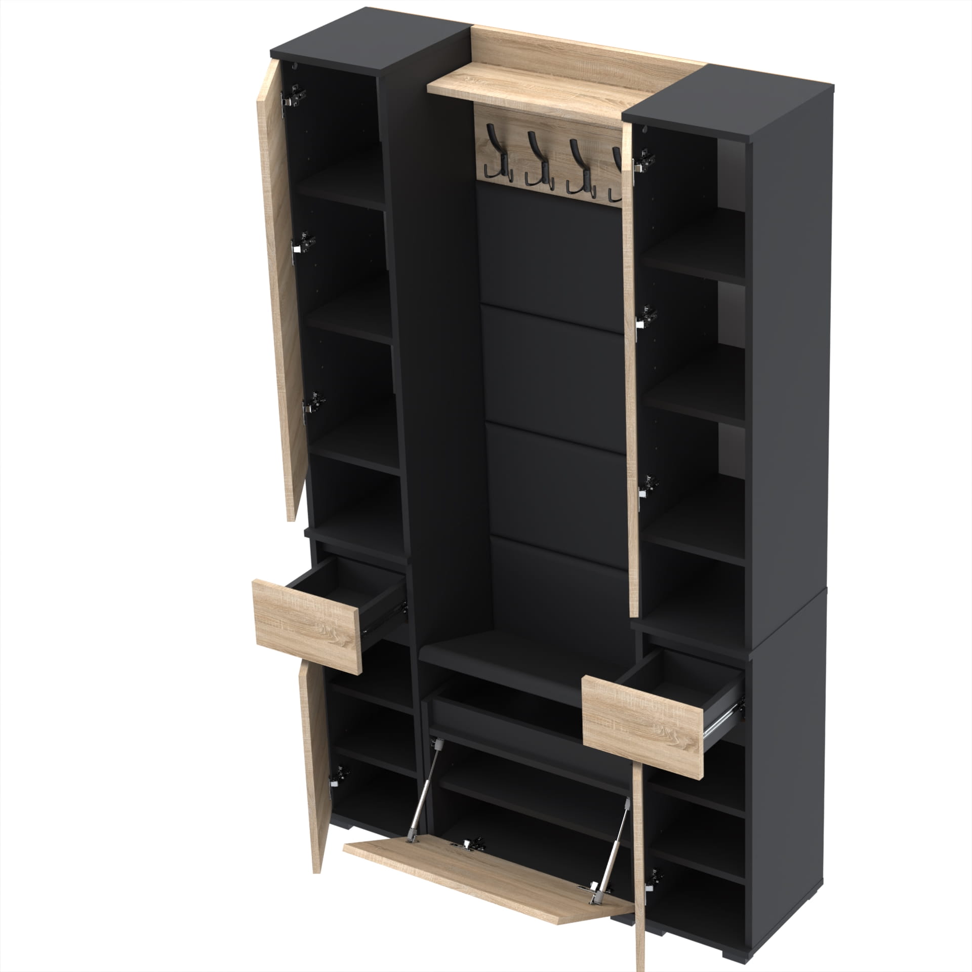 Materiał: Płyta meblowa 18mm, obrzeże ABS, okucia metalowe, nóżki 2cm z tworzywa, haki wieszaka metalowe, siłowniki gazowe.