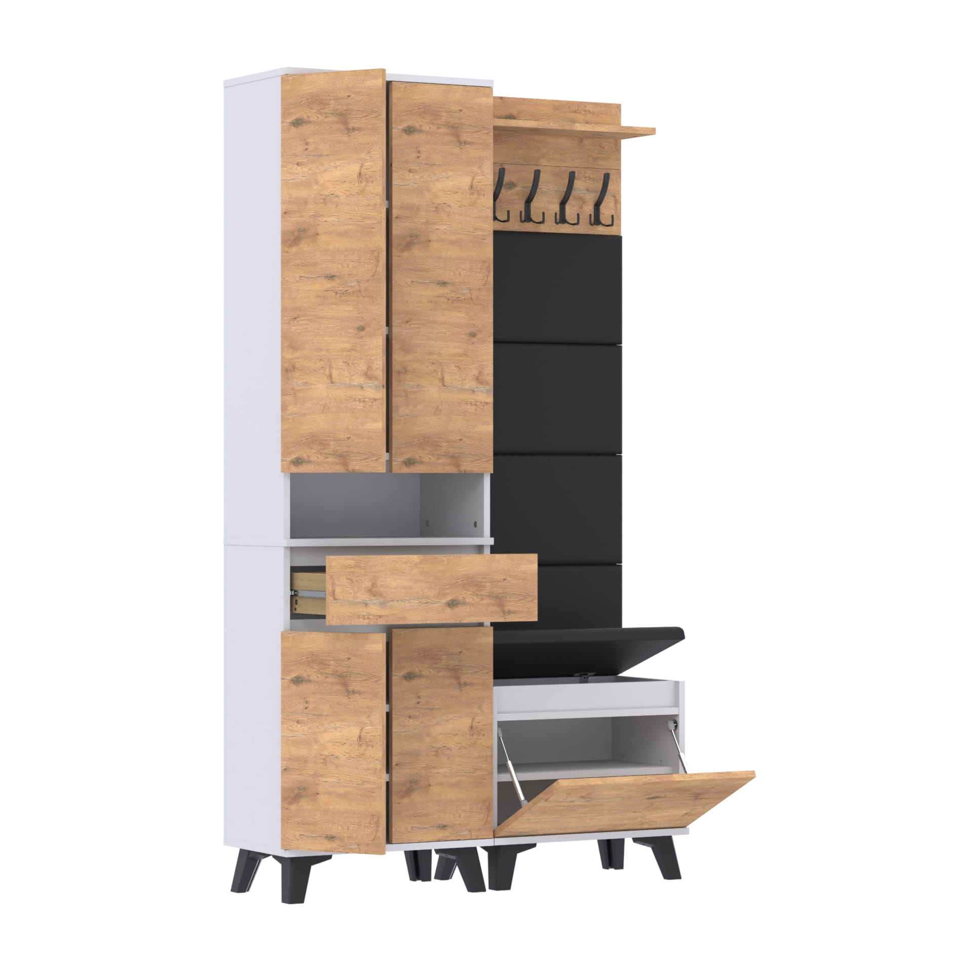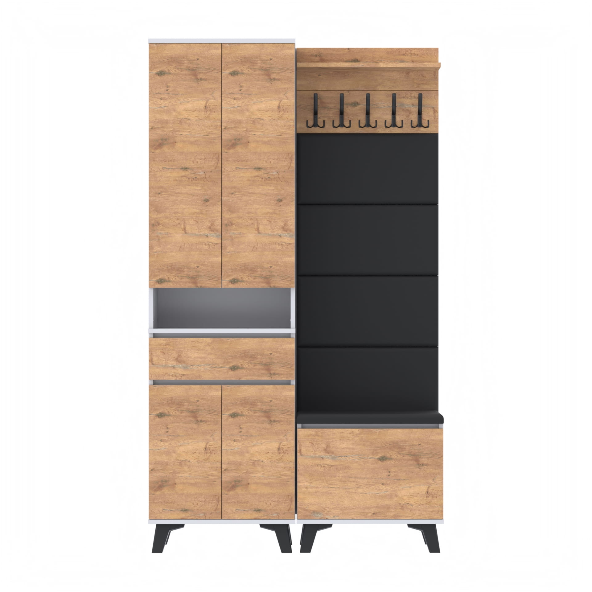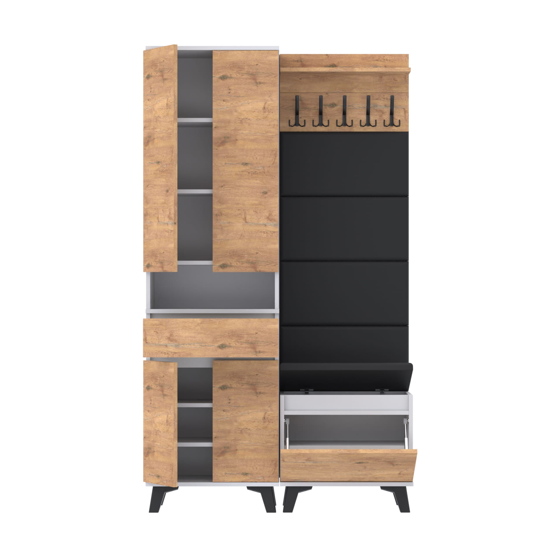 Materiał: Płyta meblowa 18mm, obrzeże ABS, okucia metalowe, nóżki 12cm z plastiku, haki wieszka metalowe.