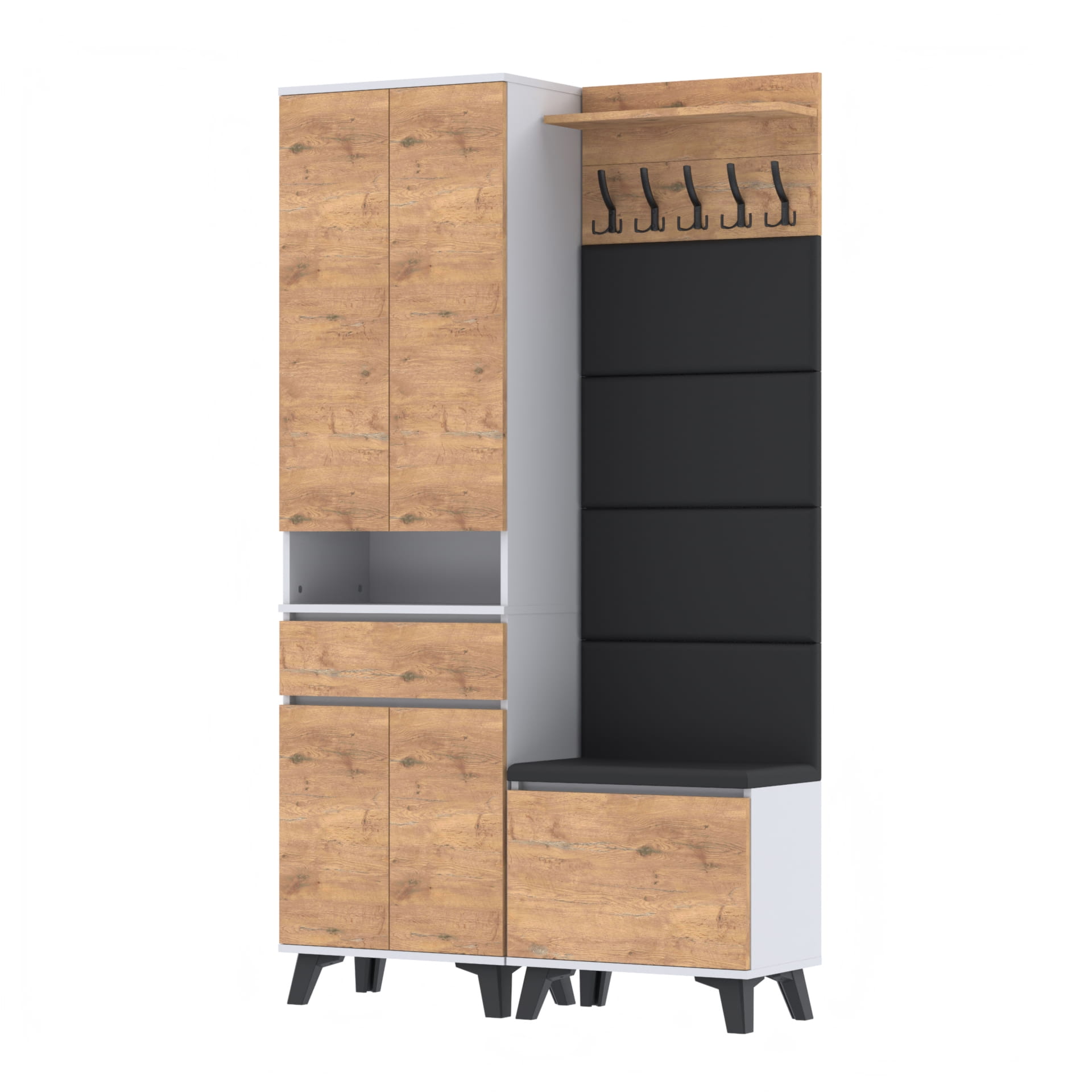 Garderoba to elegancka, funkcjonalna przestrzeń. Wyróżniającym elementem jest szafka na buty z siedziskiem i schowkiem, która ułatwia przechowywanie obuwia i drobnych przedmiotów. Ściany zdobią panele tapicerowane, nadające wnętrzu ciepły, wyrafinowany wygląd. Uzupełnieniem jest praktyczny wieszak ścienny na odzież wierzchnią i dodatkowa szafa na buty lub inne przedmioty, zapewniająca dodatkową przestrzeń do przechowywania.