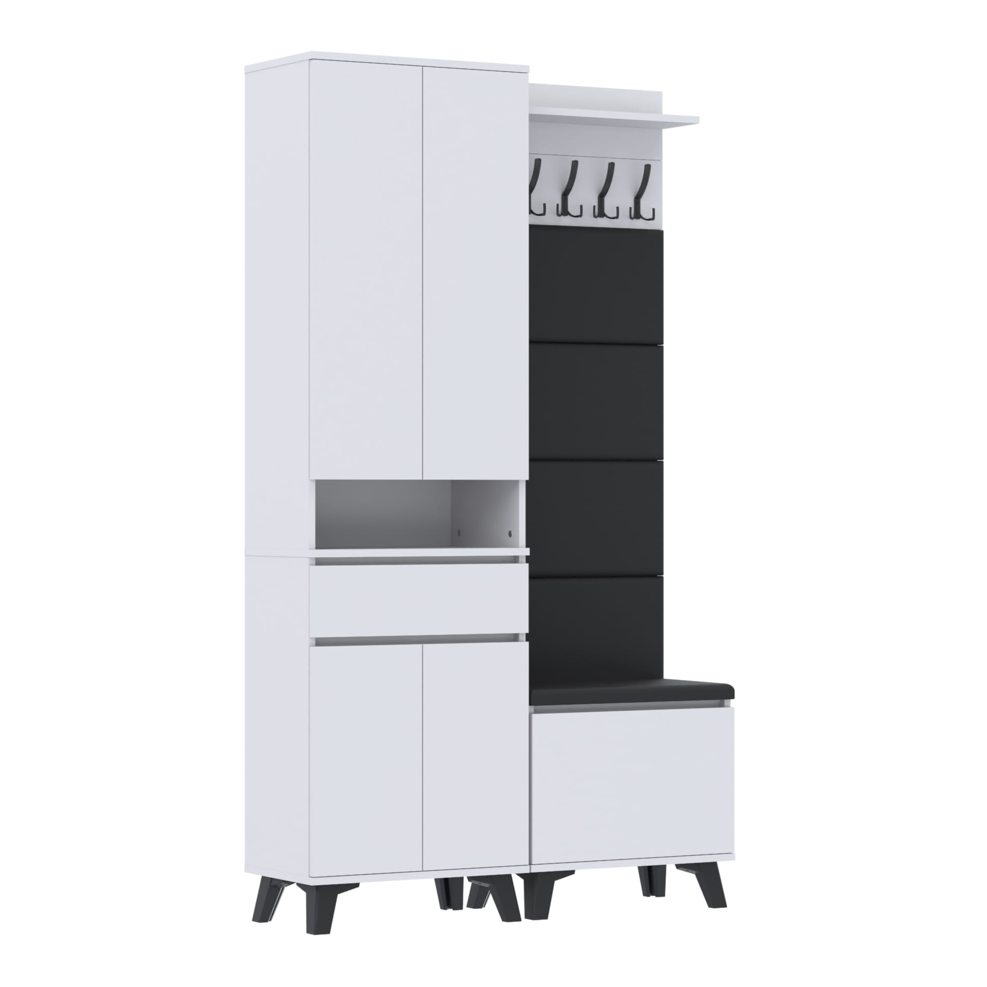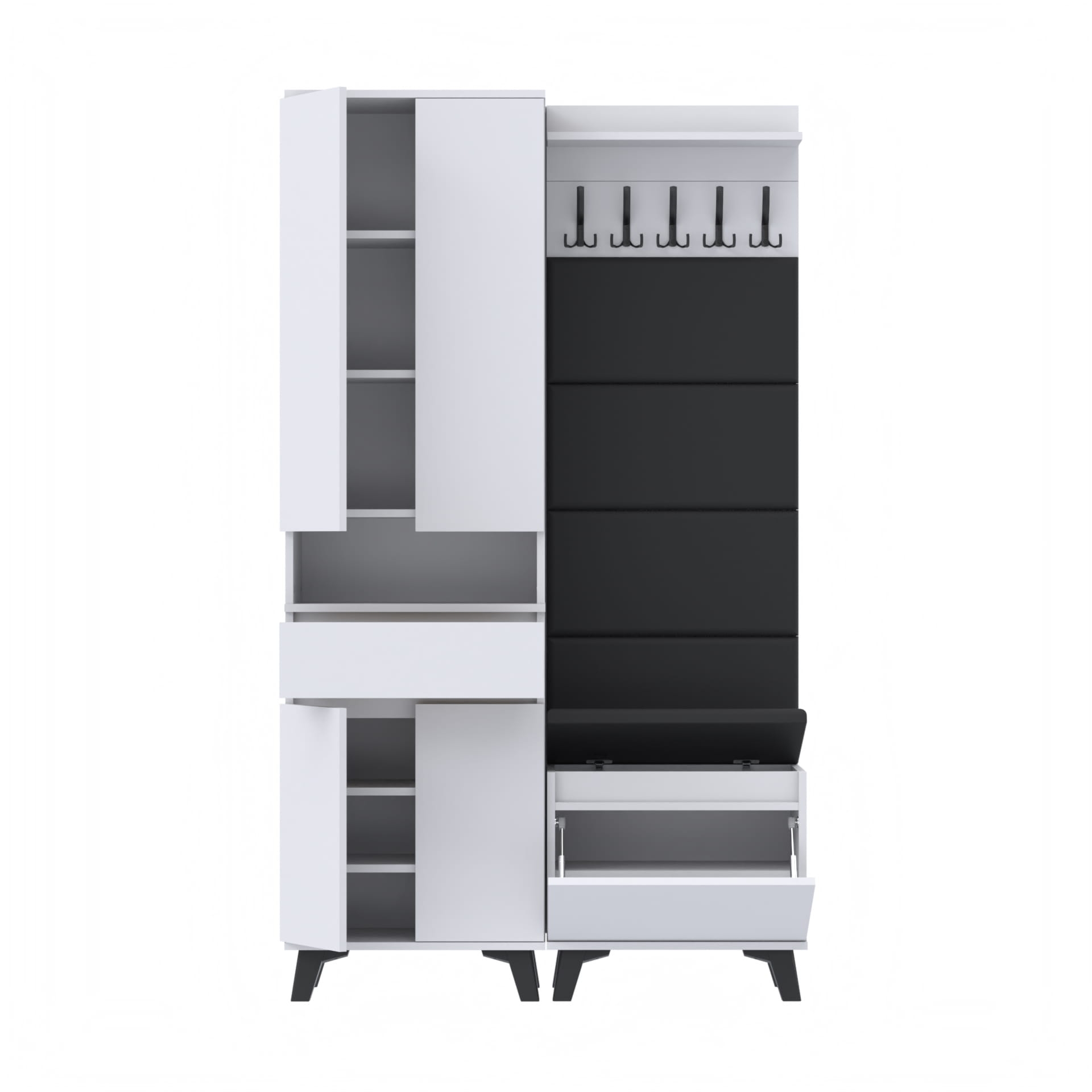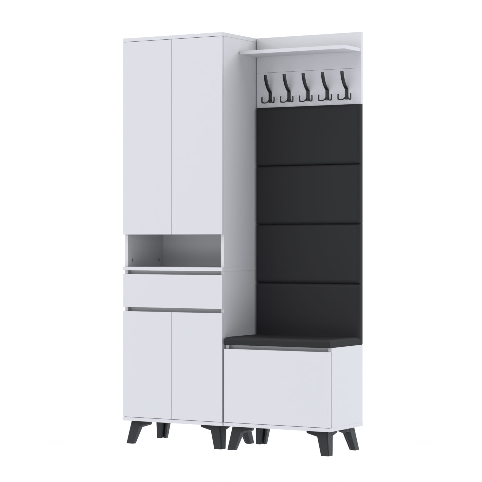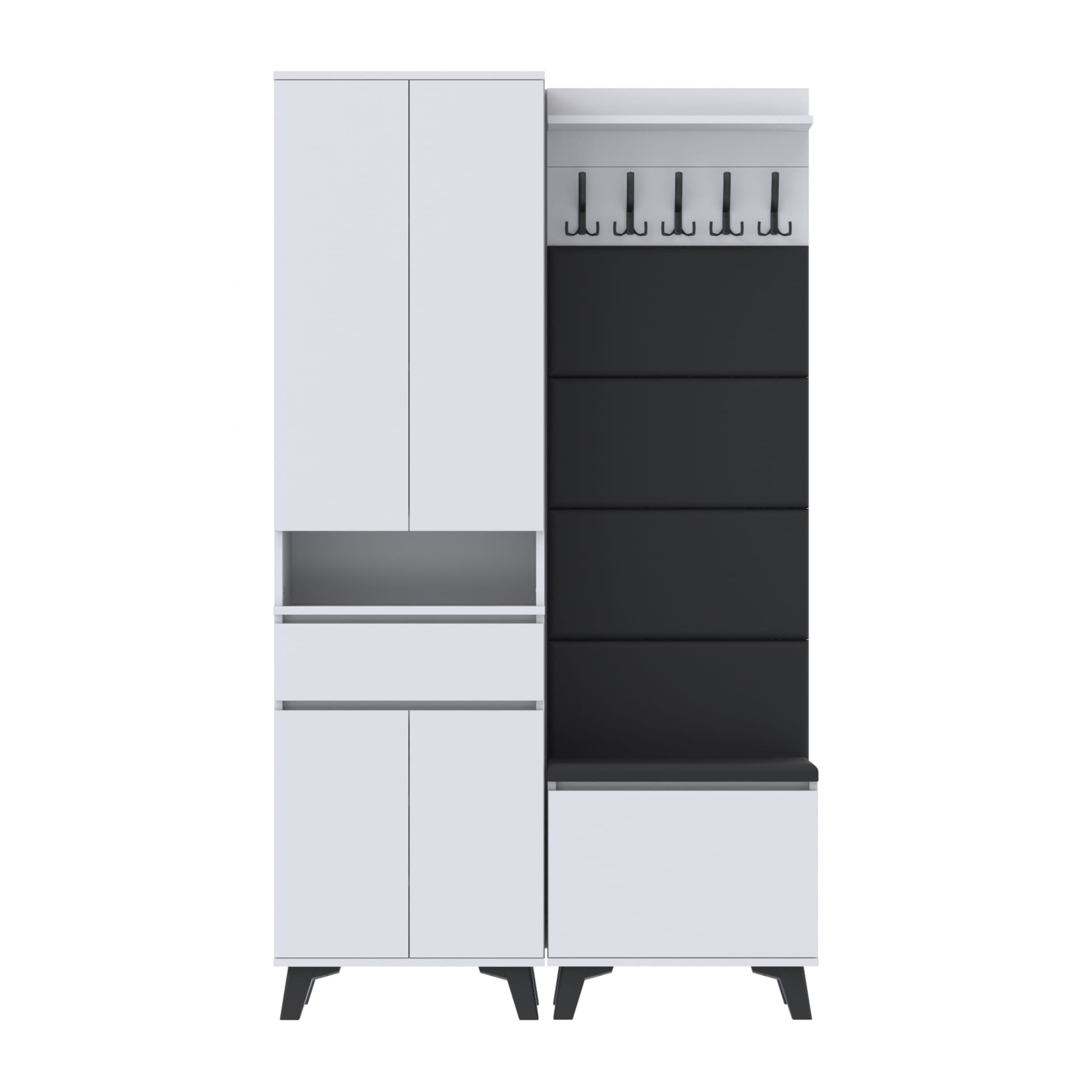 Materiał: Płyta meblowa 18mm, obrzeże ABS, okucia metalowe, nóżki 12cm z plastiku, haki wieszka metalowe.