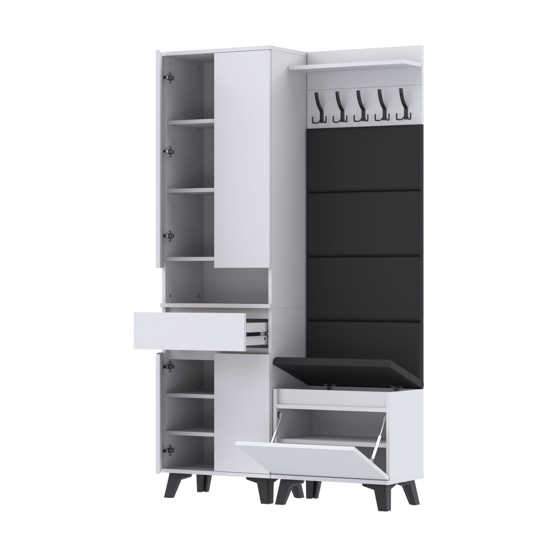 Garderoba to elegancka, funkcjonalna przestrzeń. Wyróżniającym elementem jest szafka na buty z siedziskiem i schowkiem, która ułatwia przechowywanie obuwia i drobnych przedmiotów. Ściany zdobią panele tapicerowane, nadające wnętrzu ciepły, wyrafinowany wygląd. Uzupełnieniem jest praktyczny wieszak ścienny na odzież wierzchnią i dodatkowa szafa na buty lub inne przedmioty, zapewniająca dodatkową przestrzeń do przechowywania.