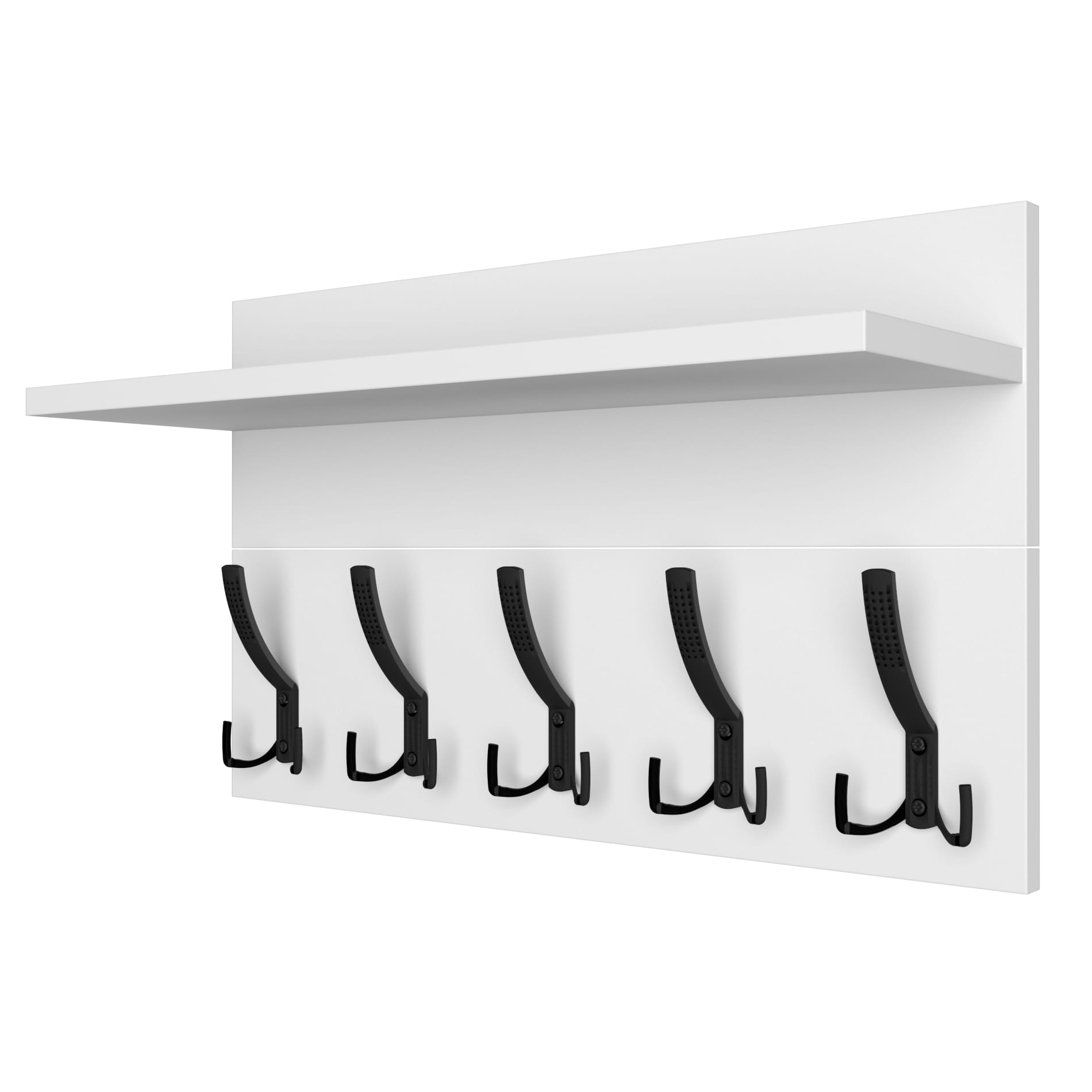 Wieszak z praktyczną półką o głębokości 18 cm. Posiada 5 metalowych uchwytów udostępnia w sumie 15 wieszaków.