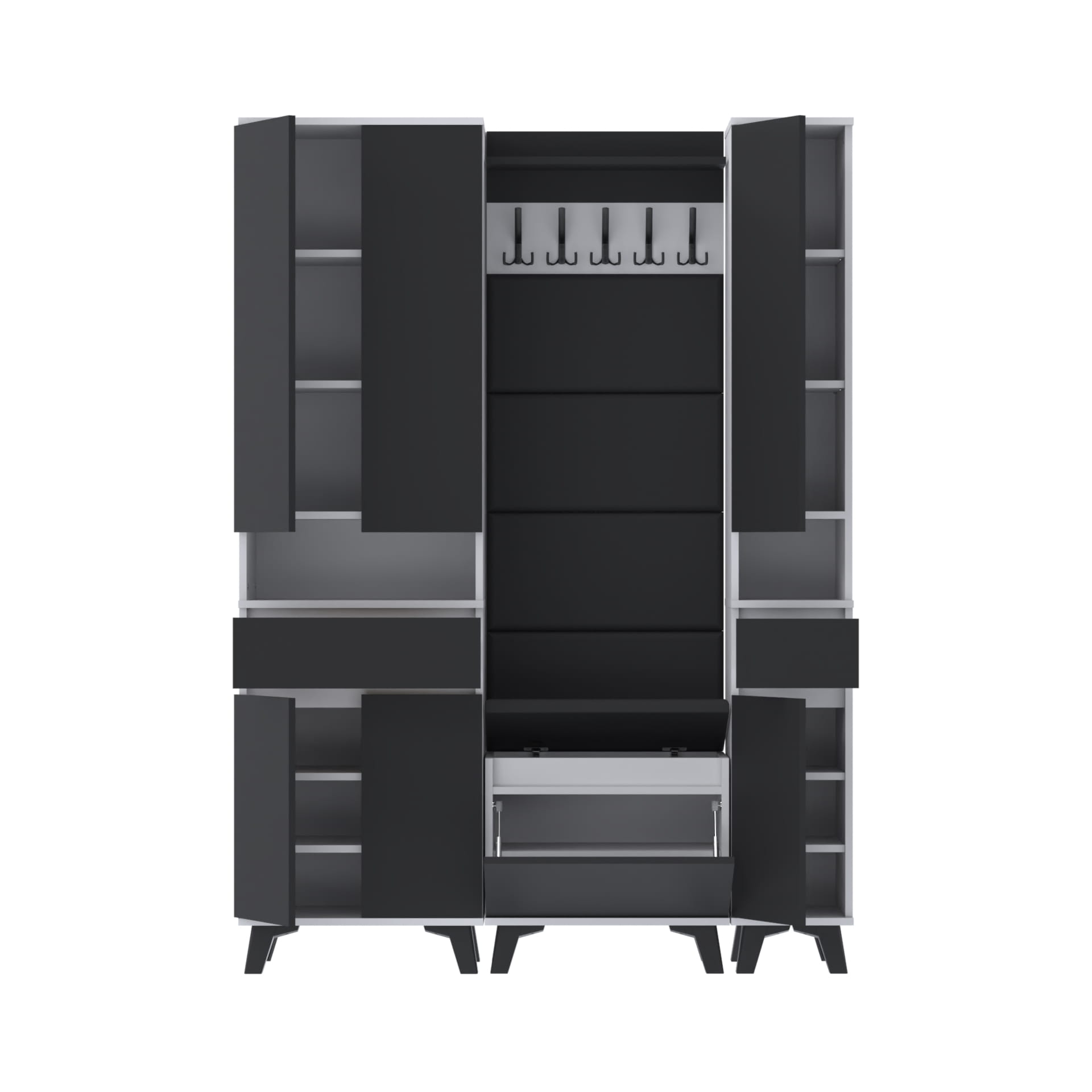 Materiał: Płyta meblowa 18mm, obrzeże ABS, okucia metalowe, nóżki 12cm z tworzywa, haki wieszaka metalowe, siłowniki gazowe.