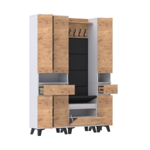 Materiał: Płyta meblowa 18mm, obrzeże ABS, okucia metalowe, nóżki 12cm z plastiku, haki wieszka metalowe.