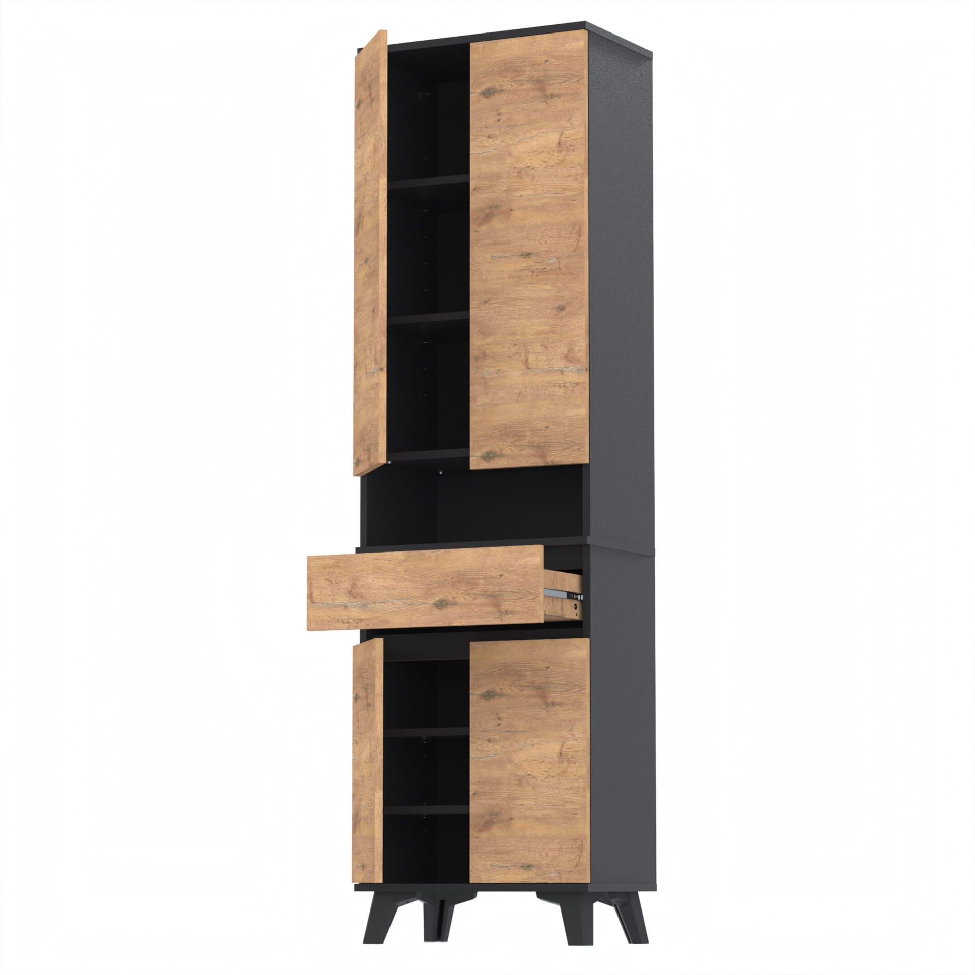 Szafa składa się z dwóch części. W dolnej części znajduje się szafka z 3 poziomami oraz szuflada TRES. Górna część - nadstawka posiada szafkę z czterema poziomami oraz otwartą półkę. Górna część nakłada się na dolną, tak by stanowiły całość.