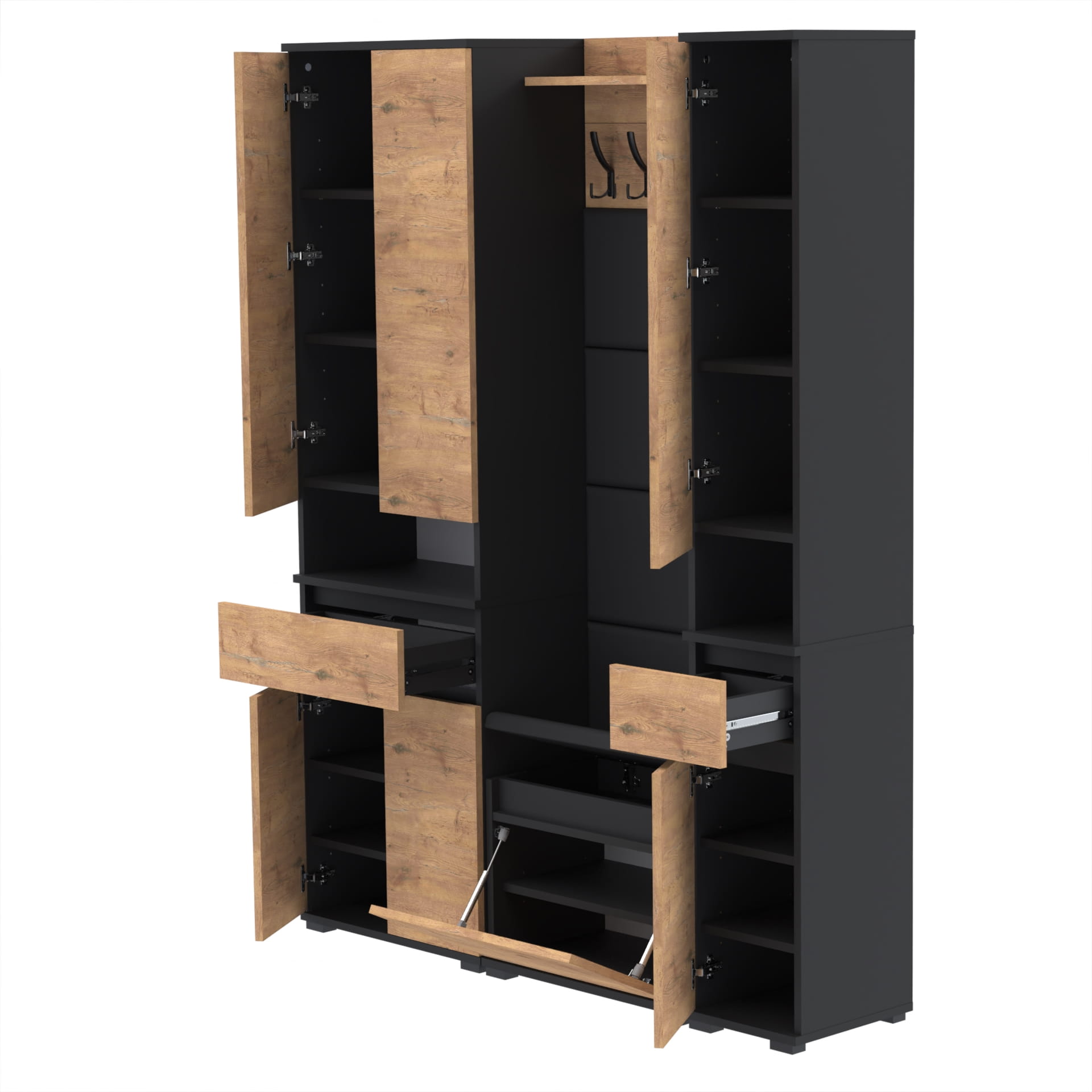 Materiał: Płyta meblowa 18mm, obrzeże ABS, okucia metalowe, nóżki 2cm z tworzywa, haki wieszaka metalowe, siłowniki gazowe.