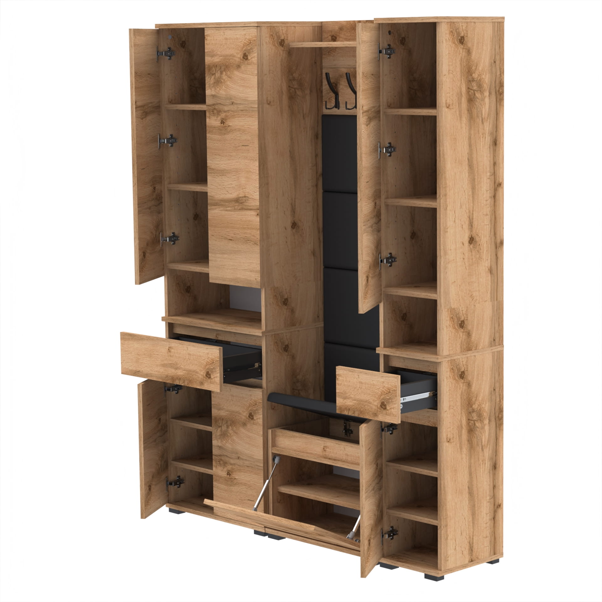 Garderoba to prawdziwy raj dla miłośników elegancji i funkcjonalności. To miejsce, które łączy styl z praktycznością, tworząc harmonijną przestrzeń do przechowywania i organizacji. Centralnym punktem tej garderoby jest szafka na buty z siedziskiem i schowkiem. To miejsce, w którym nie tylko przechowasz swoje ulubione obuwie, ale także znajdziesz wygodne miejsce do zdejmowania i zakładania butów. Schowek pozwoli Ci zachować porządek w garderobie, przechowując drobne przedmioty i akcesoria w jednym miejscu.