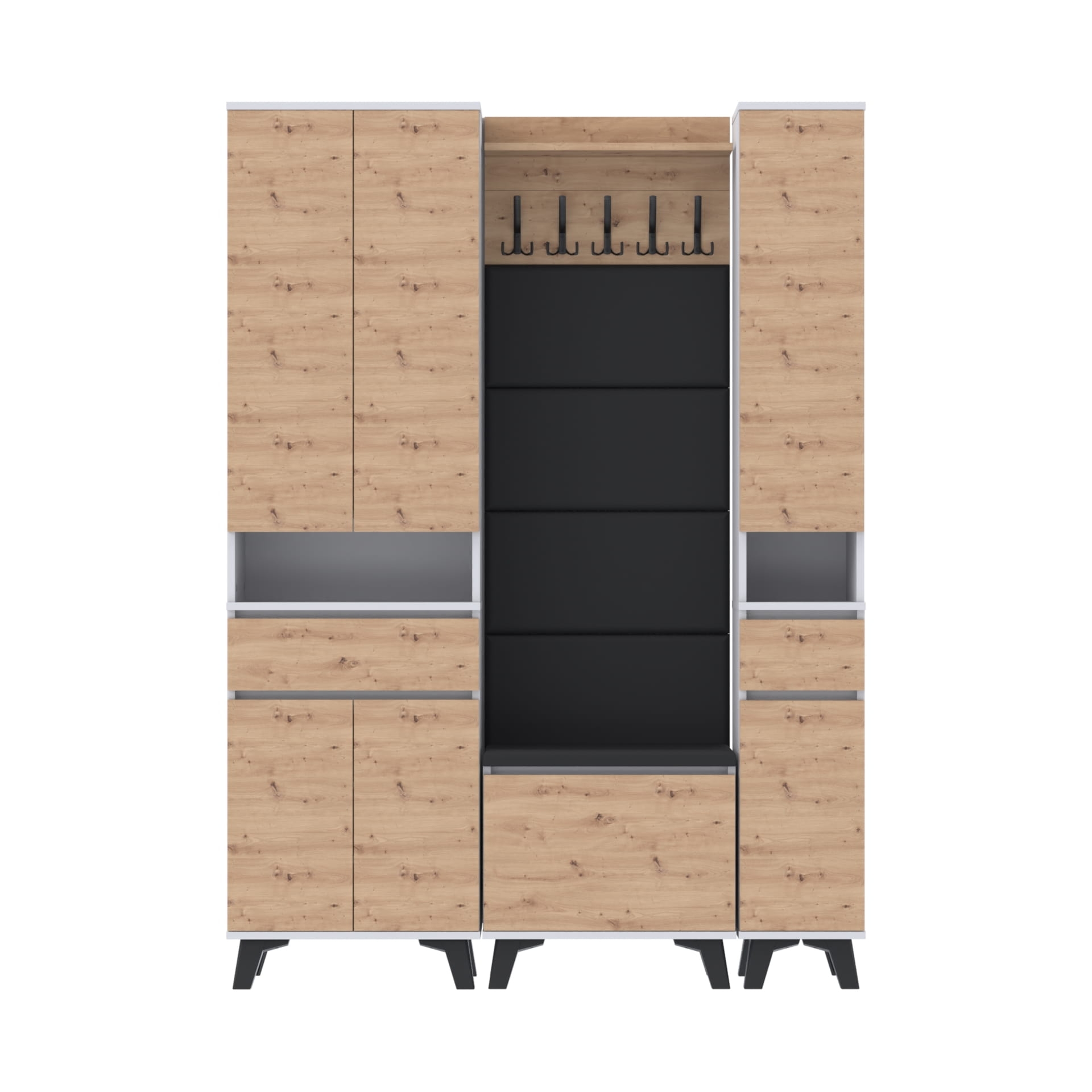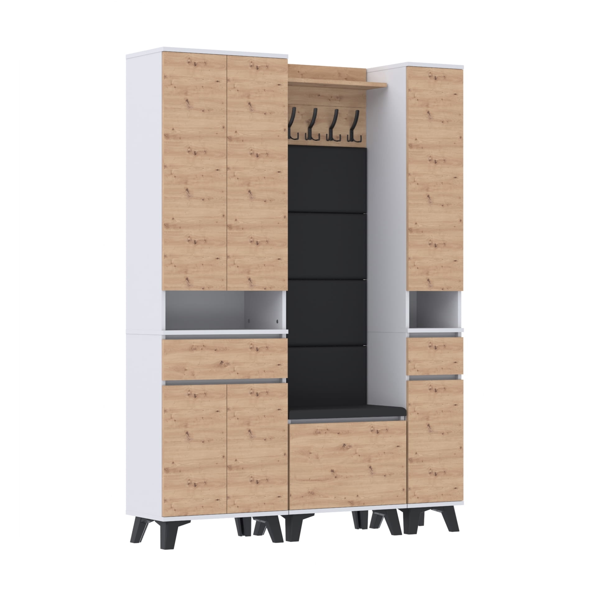 Materiał: Płyta meblowa 18mm, obrzeże ABS, okucia metalowe, nóżki 12cm z plastiku, haki wieszka metalowe.