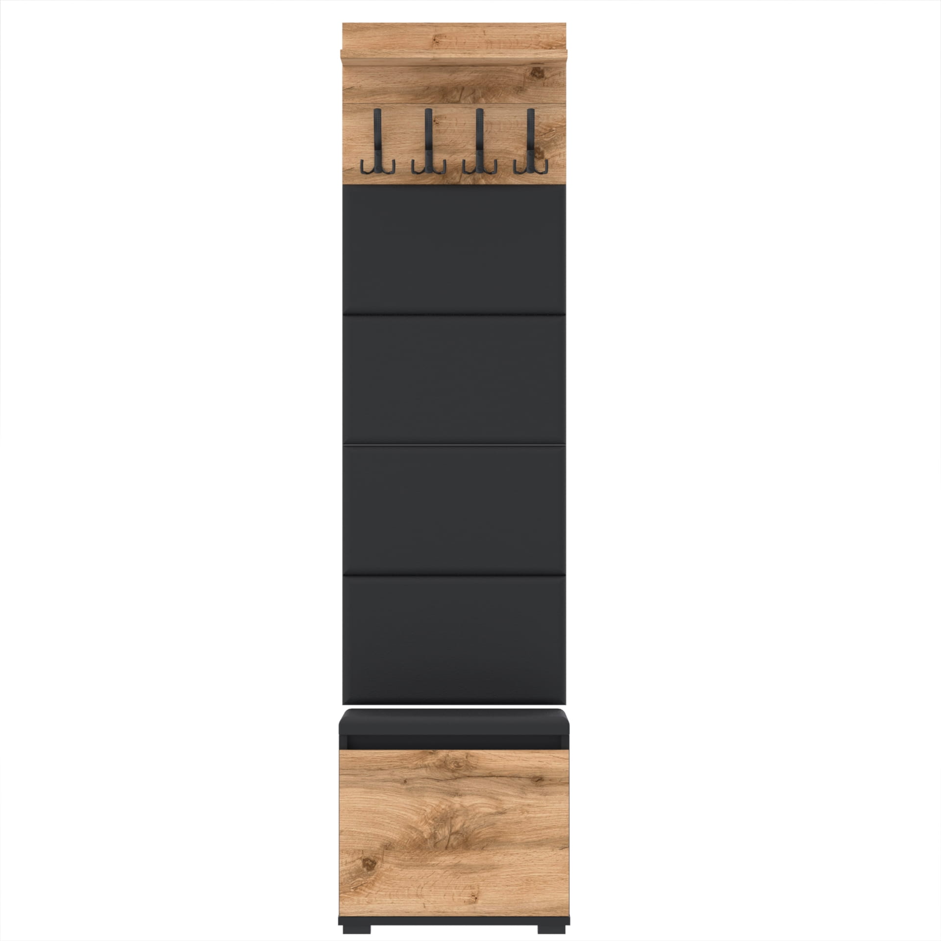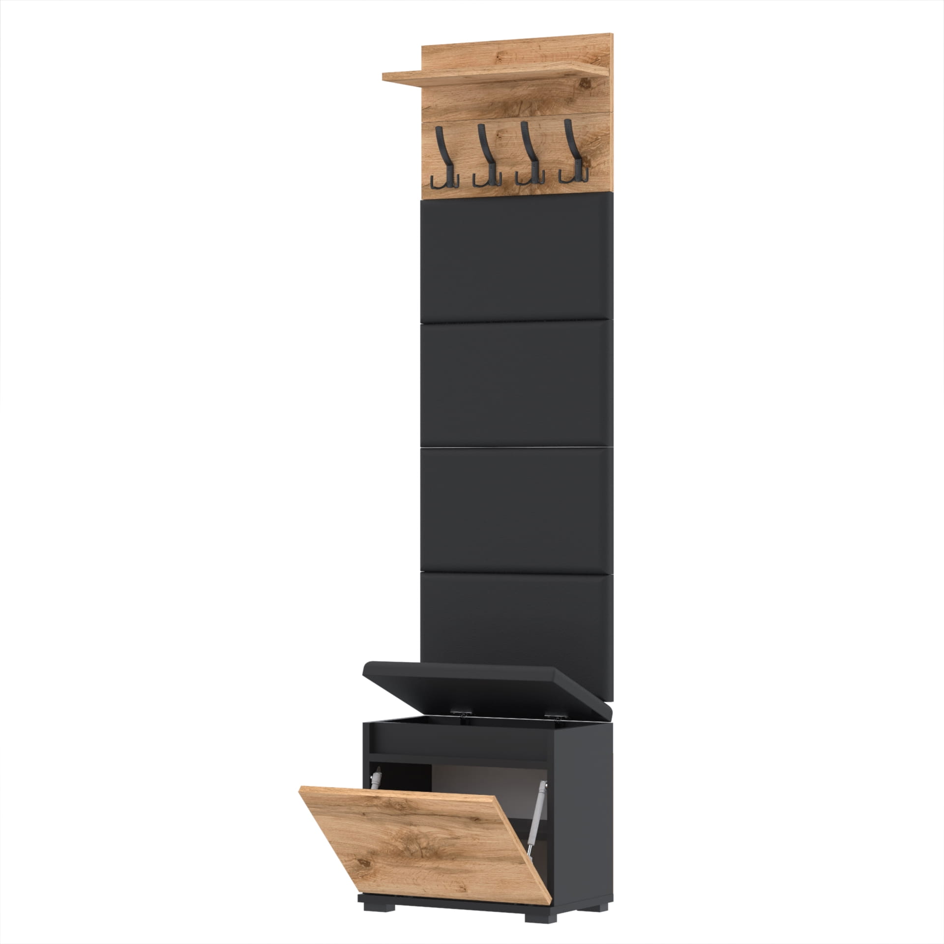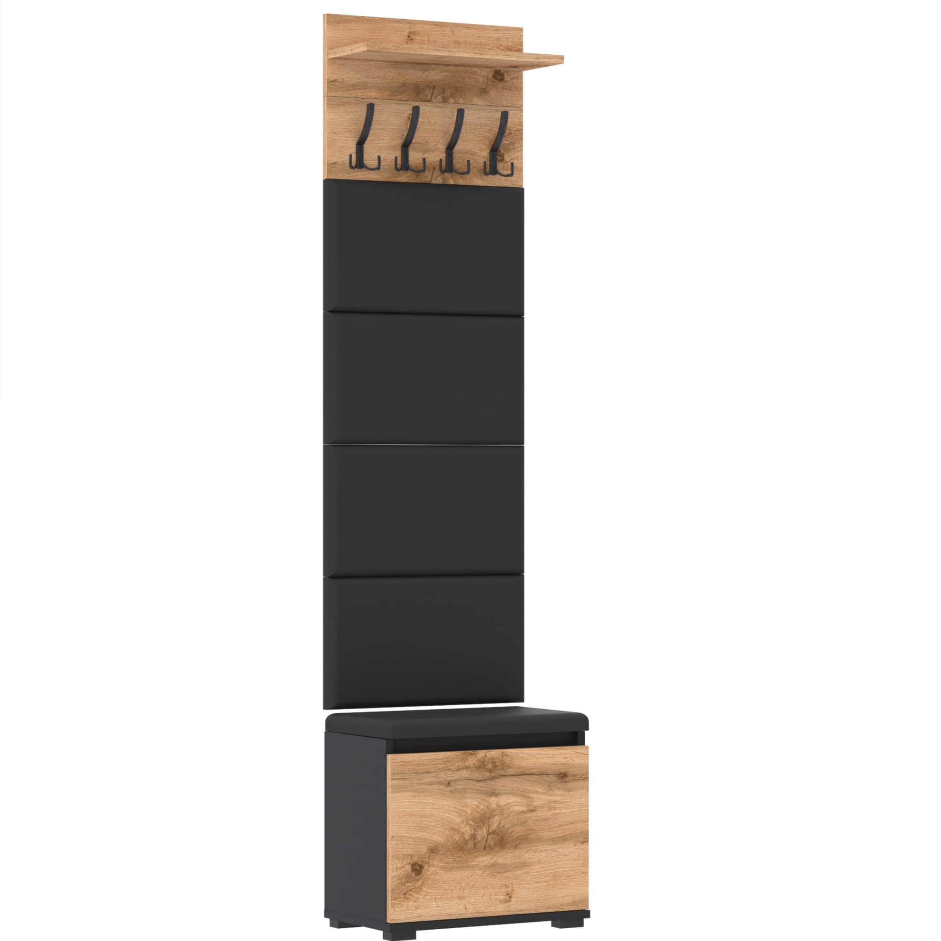 Zestaw - szafka na buty ze schowkiem, wieszak ścienny, półka, 4 panele tapicerowane.