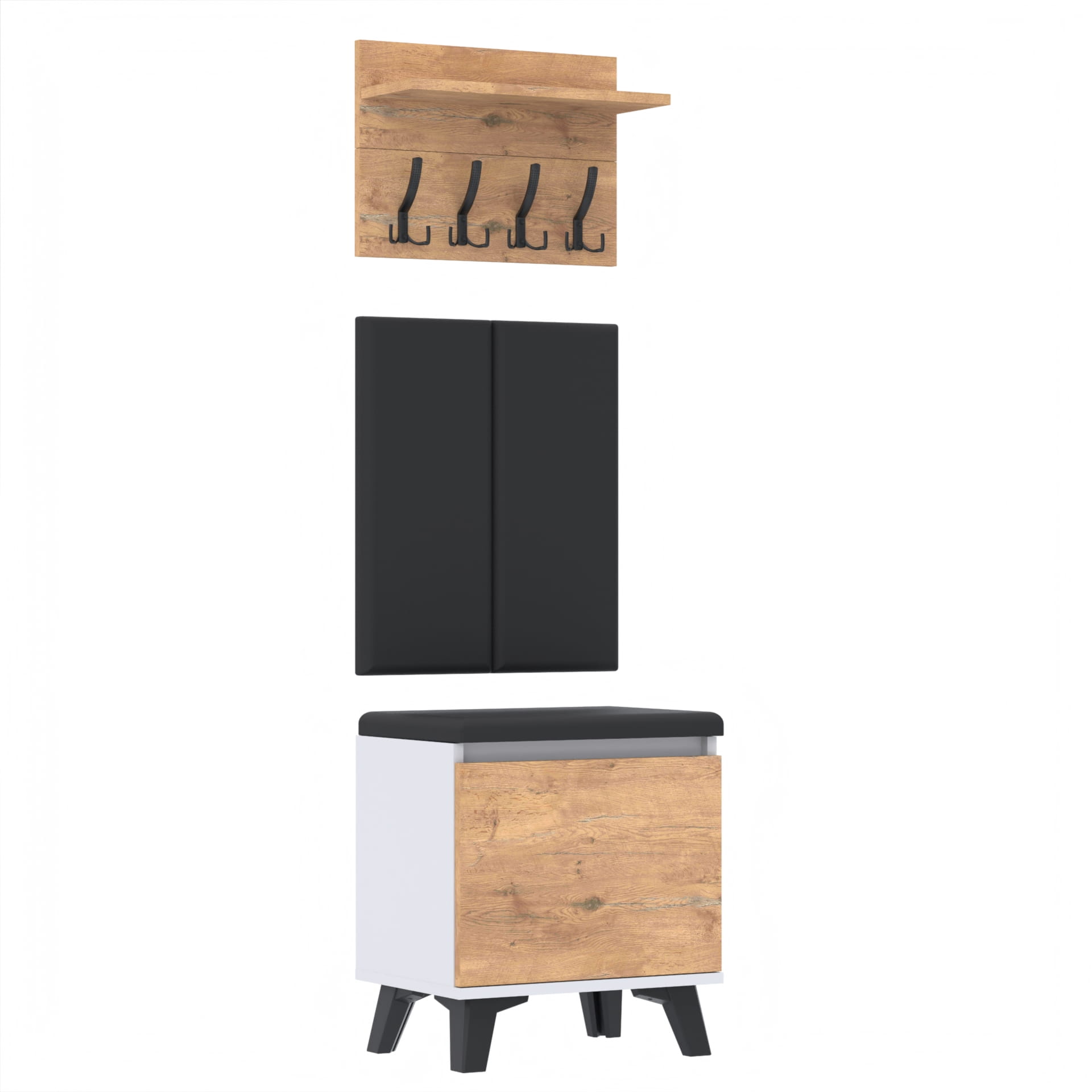 Garderoba to stylowy i praktyczny obszar w naszych domach. Kluczowym elementem jest szafka na buty z siedziskiem i schowkiem, która ułatwia organizację obuwia oraz drobnych akcesoriów. Tapicerowane panele na ścianach dodają wnętrzu ciepłego, eleganckiego charakteru. Przemyślane dopełnienie stanowi praktyczny wieszak ścienny, doskonały do przechowywania odzieży wierzchniej.