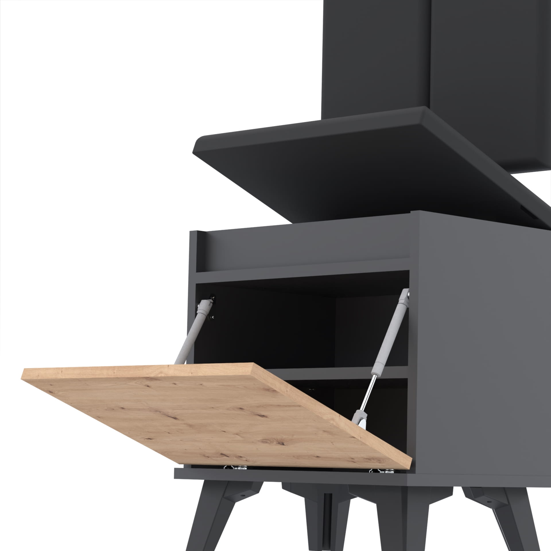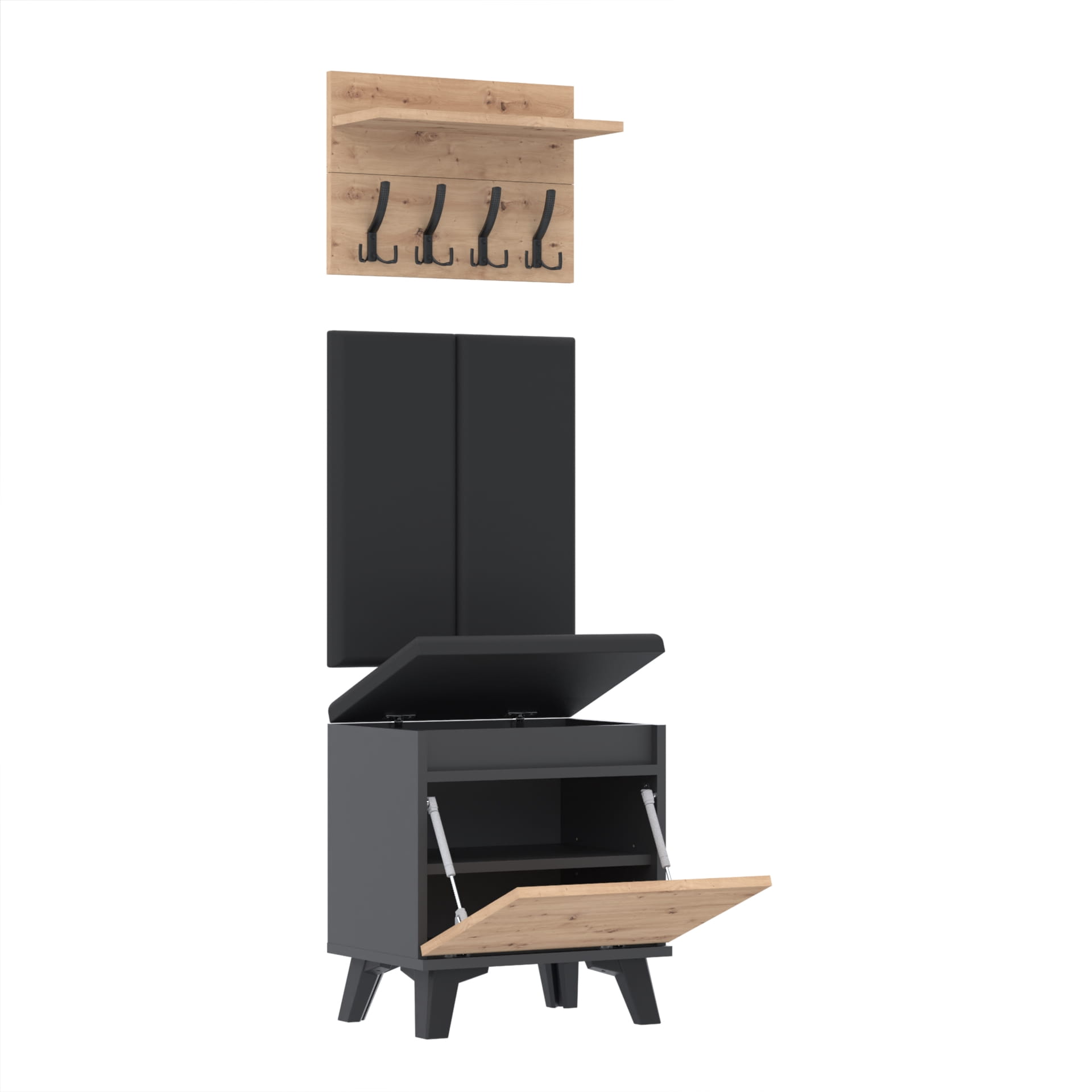 Materiał: Płyta meblowa 18mm, obrzeże ABS, okucia metalowe, nóżki z plastiku, haki wieszaka metalowe, siłowniki gazowe.