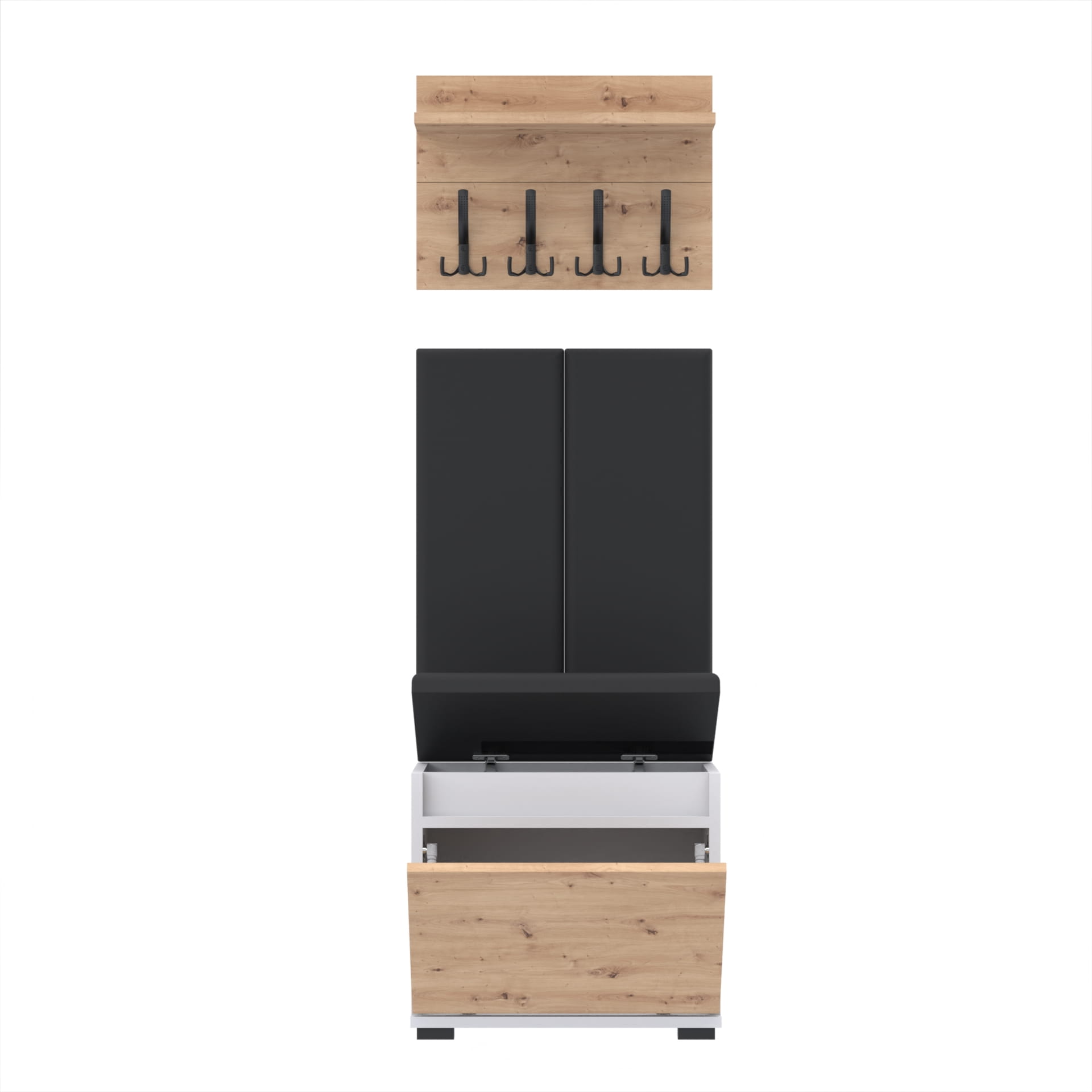 Szafka na buty jest nie tylko wygodna, ale także praktyczna - wewnątrz znajduje się półka, która pozwala na przechowywanie większej ilości obuwia. Dodatkowo, szafka jest wyposażona w schowek na przybory, dzięki czemu wszystko, czego potrzebujesz, jest zawsze pod ręką.