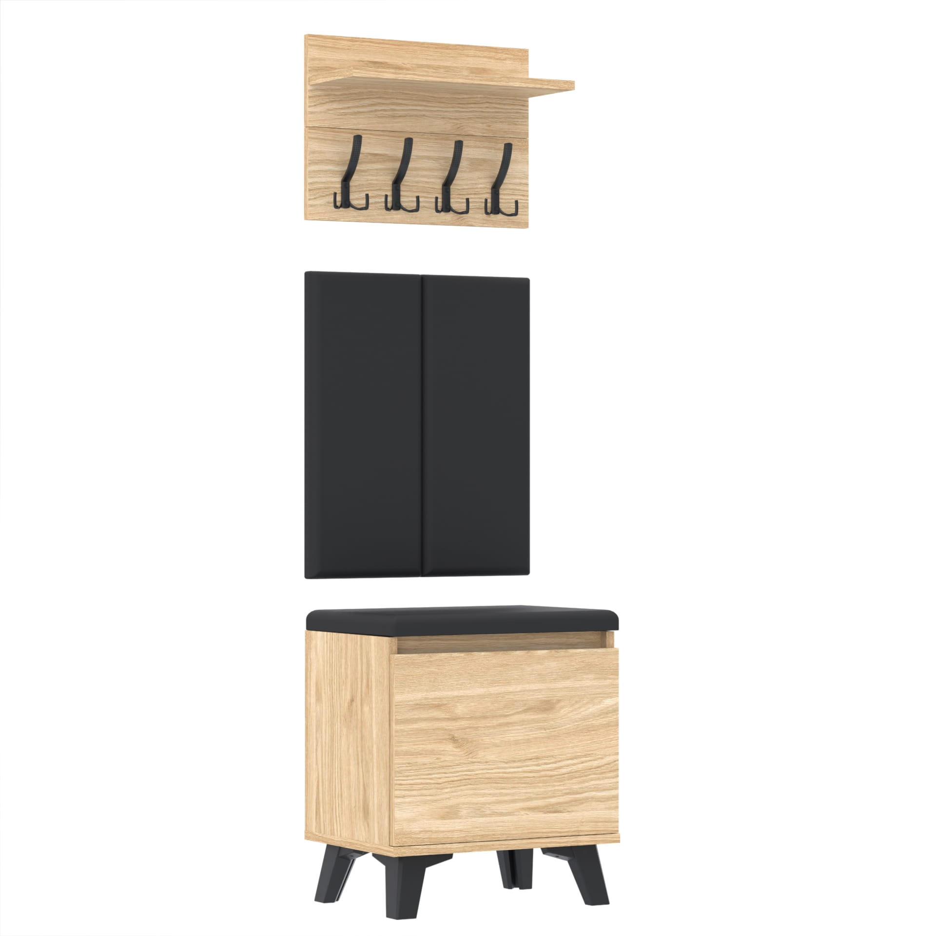 Garderoba to stylowy i praktyczny obszar w naszych domach. Kluczowym elementem jest szafka na buty z siedziskiem i schowkiem, która ułatwia organizację obuwia oraz drobnych akcesoriów. Tapicerowane panele na ścianach dodają wnętrzu ciepłego, eleganckiego charakteru. Przemyślane dopełnienie stanowi praktyczny wieszak ścienny, doskonały do przechowywania odzieży wierzchniej.