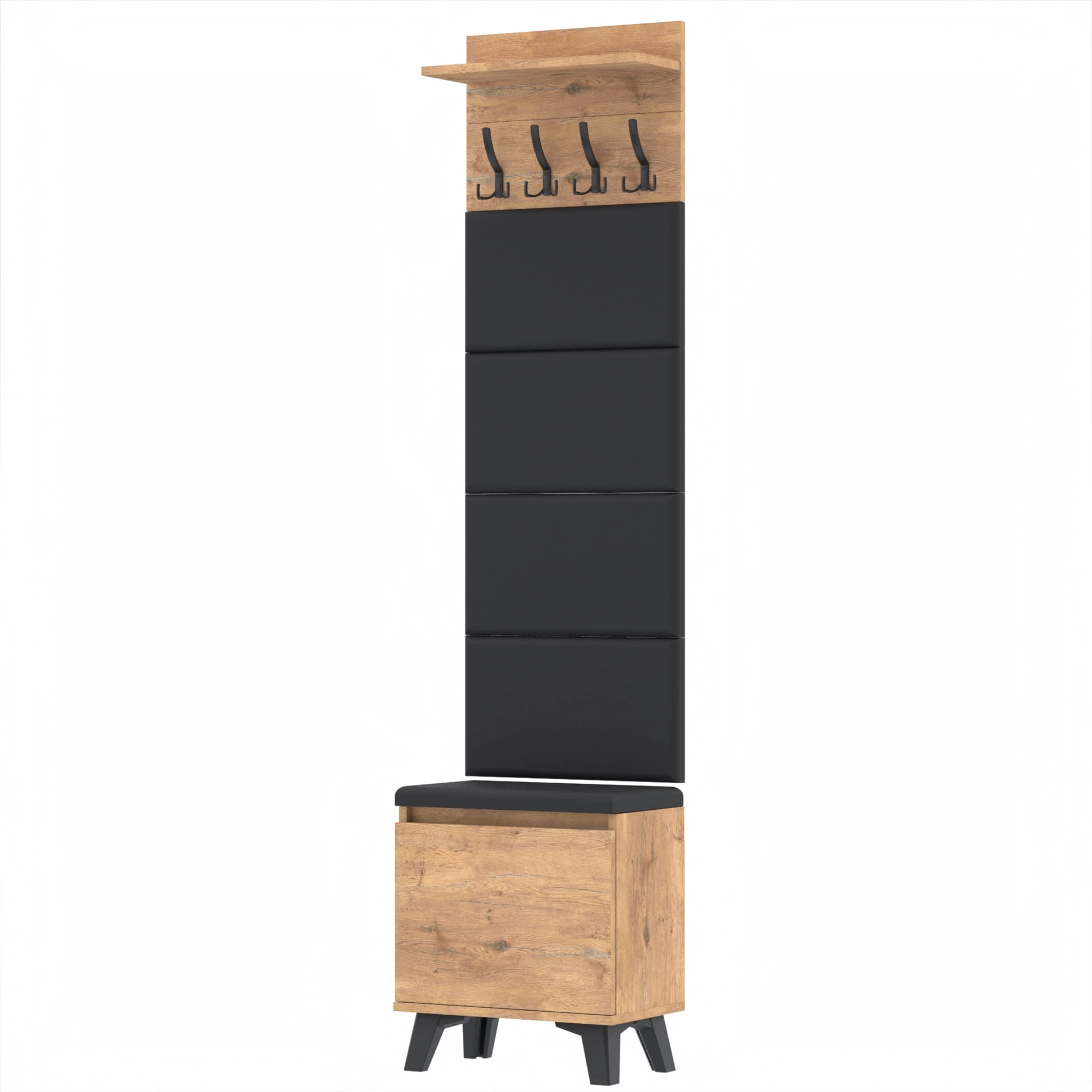 Na górze struktury znajduje się praktyczna półka o głębokości 18 cm, która jest idealna do przechowywania różnych przedmiotów. Półka nie tylko zapewnia dodatkową przestrzeń do przechowywania, ale także stanowi integralną część designu wieszaka, nadając mu ciekawy, nowoczesny wygląd.