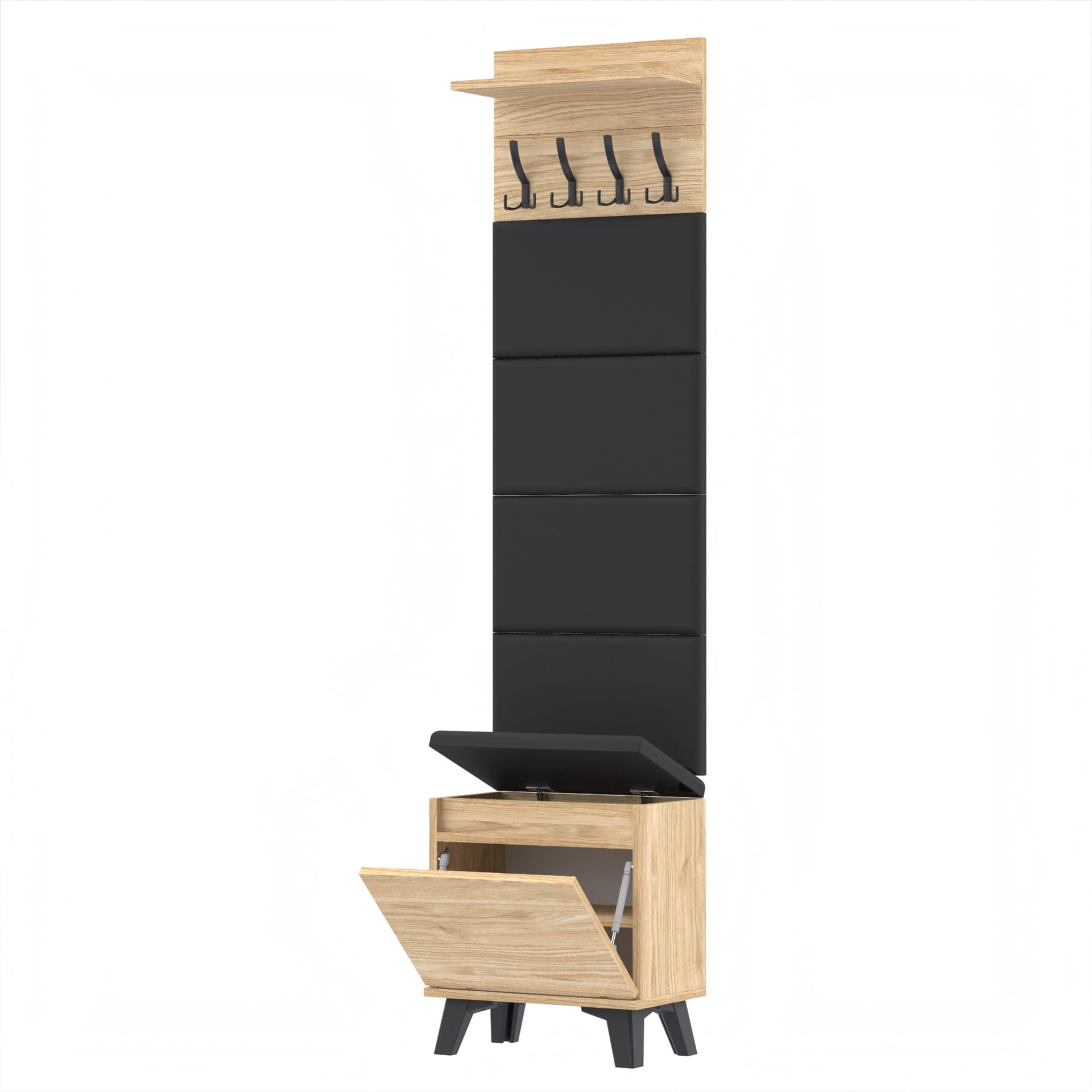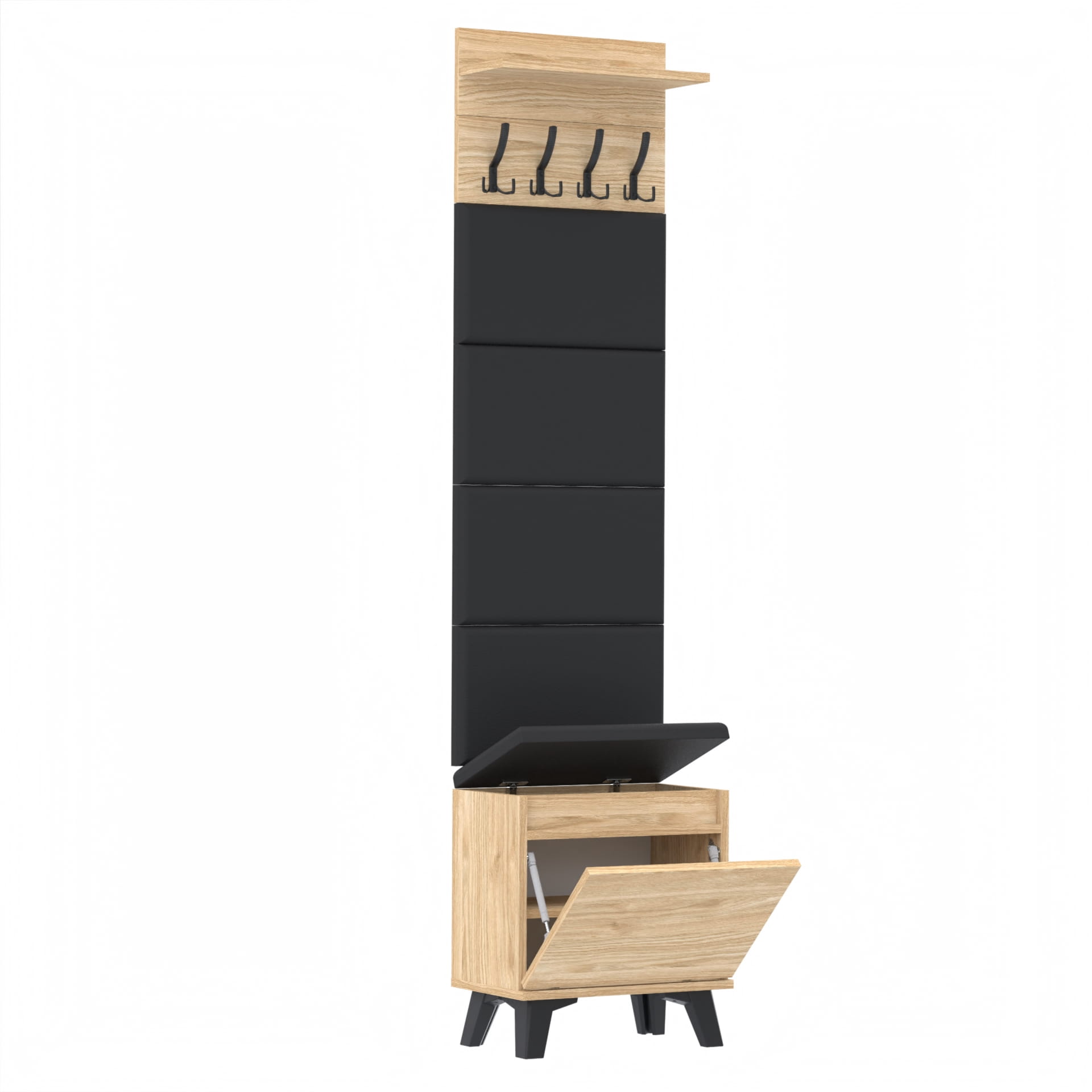 Na górze struktury znajduje się praktyczna półka o głębokości 18 cm, która jest idealna do przechowywania różnych przedmiotów. Półka nie tylko zapewnia dodatkową przestrzeń do przechowywania, ale także stanowi integralną część designu wieszaka, nadając mu ciekawy, nowoczesny wygląd.