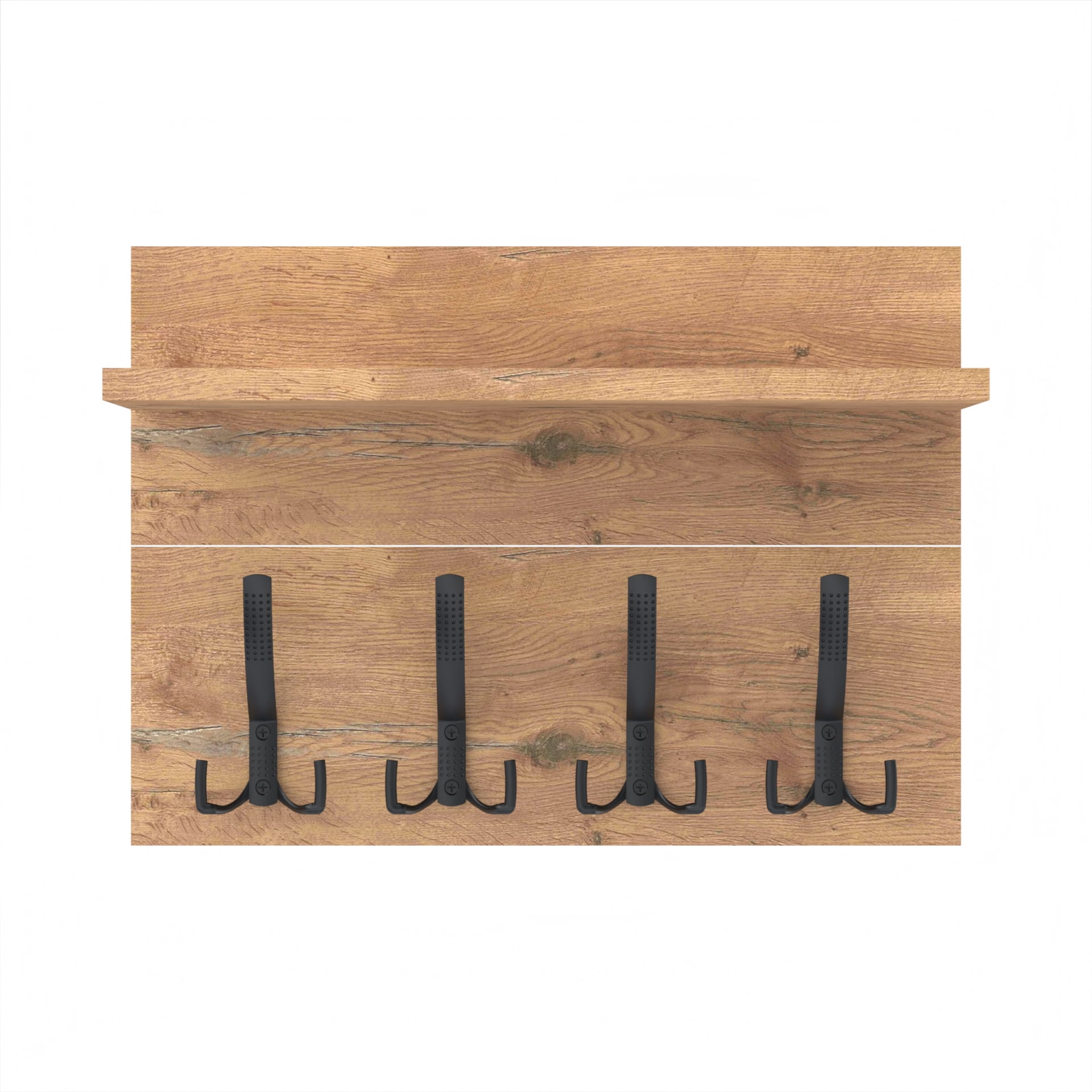 Na górze struktury znajduje się praktyczna półka o głębokości 18 cm, która jest idealna do przechowywania różnych przedmiotów. Półka nie tylko zapewnia dodatkową przestrzeń do przechowywania, ale także stanowi integralną część designu wieszaka, nadając mu ciekawy, nowoczesny wygląd.