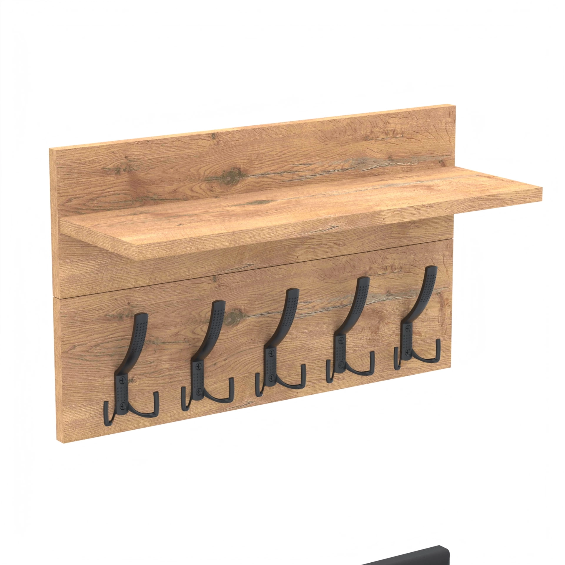 Na górze struktury znajduje się praktyczna półka o głębokości 18 cm, która jest idealna do przechowywania różnych przedmiotów. Półka nie tylko zapewnia dodatkową przestrzeń do przechowywania, ale także stanowi integralną część designu wieszaka, nadając mu ciekawy, nowoczesny wygląd.