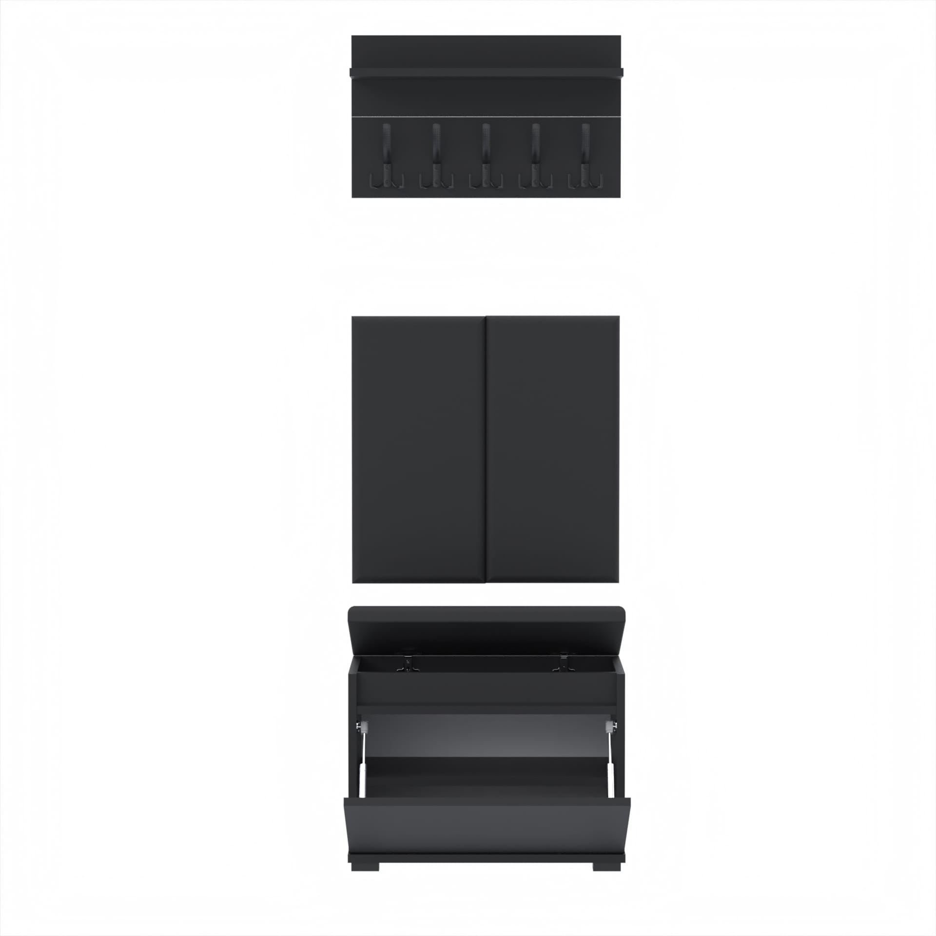 Materiał: Płyta meblowa 18mm, obrzeże ABS, okucia metalowe, nóżki z plastiku, haki wieszaka metalowe, siłowniki gazowe.