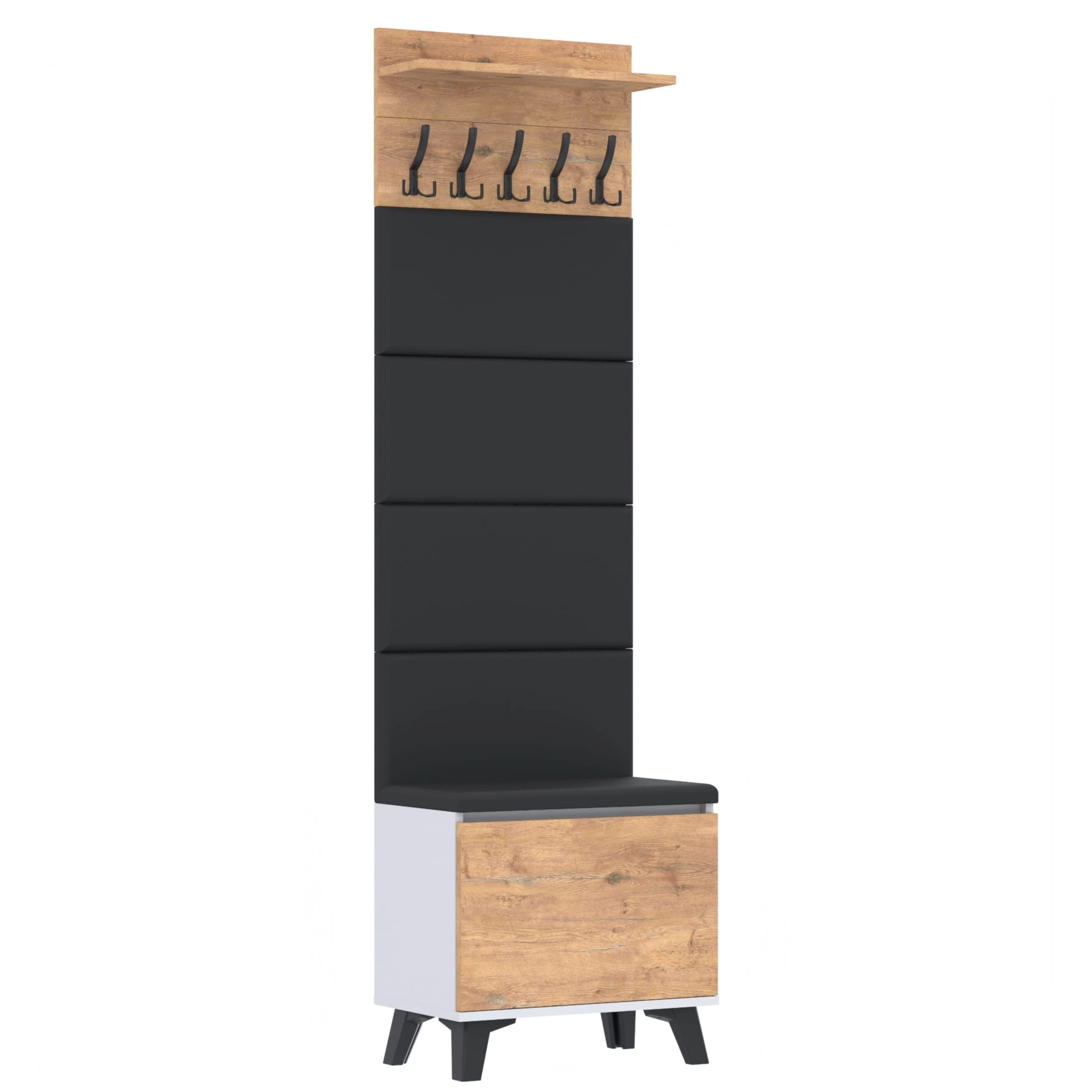 Materiał: Płyta meblowa 18mm, obrzeże ABS, okucia metalowe, nóżki 12cm z plastiku, haki wieszaka metalowe.