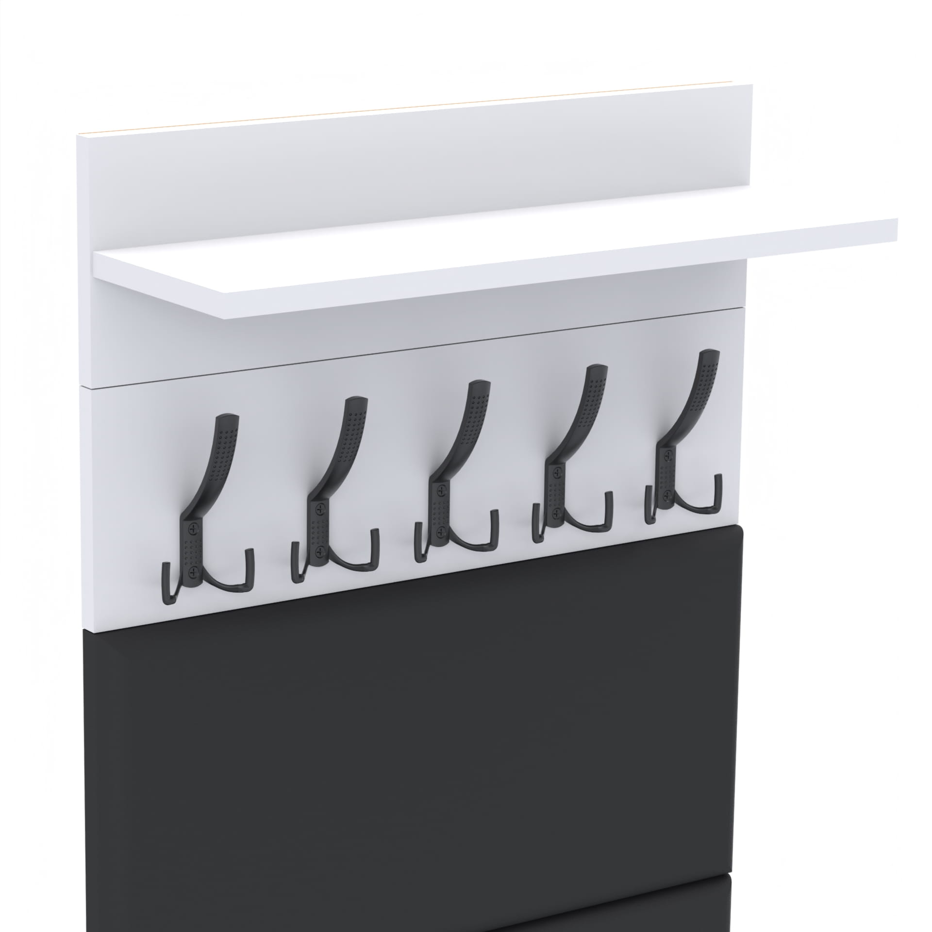 Wieszak z półką mocuje się do ściany za pomocą kołków rozporowych zawartych w zestawie. Można go powiesić nad siedziskiem na dowolnej wysokości. Wieszak i półka są oddzielnymi płytami, przykręca się je do ściany oddzielnie.