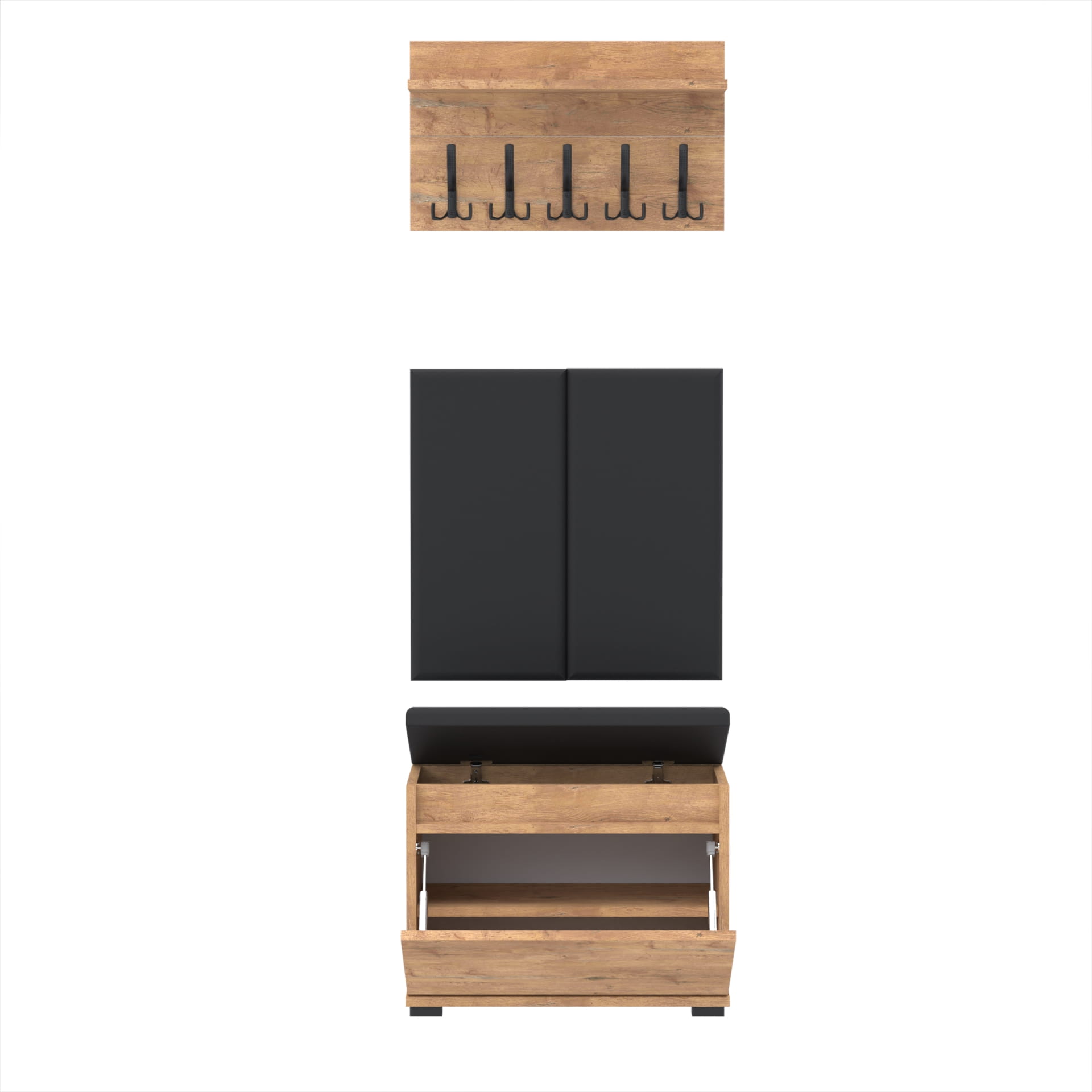 Garderoba to stylowy i praktyczny obszar w naszych domach. Kluczowym elementem jest szafka na buty z siedziskiem i schowkiem, która ułatwia organizację obuwia oraz drobnych akcesoriów. Tapicerowane panele na ścianach dodają wnętrzu ciepłego, eleganckiego charakteru. Przemyślane dopełnienie stanowi praktyczny wieszak ścienny, doskonały do przechowywania odzieży wierzchniej.
