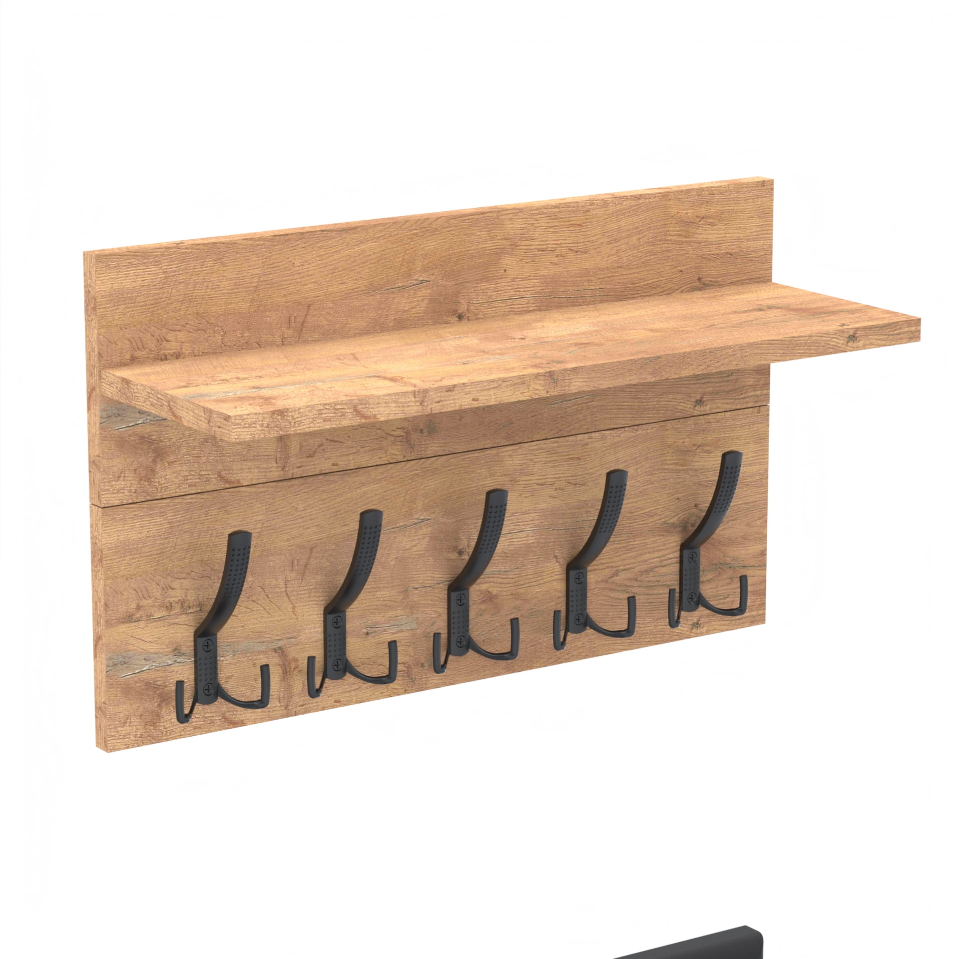 Na górze struktury znajduje się praktyczna półka o głębokości 18 cm, która jest idealna do przechowywania różnych przedmiotów. Półka nie tylko zapewnia dodatkową przestrzeń do przechowywania, ale także stanowi integralną część designu wieszaka, nadając mu ciekawy, nowoczesny wygląd.